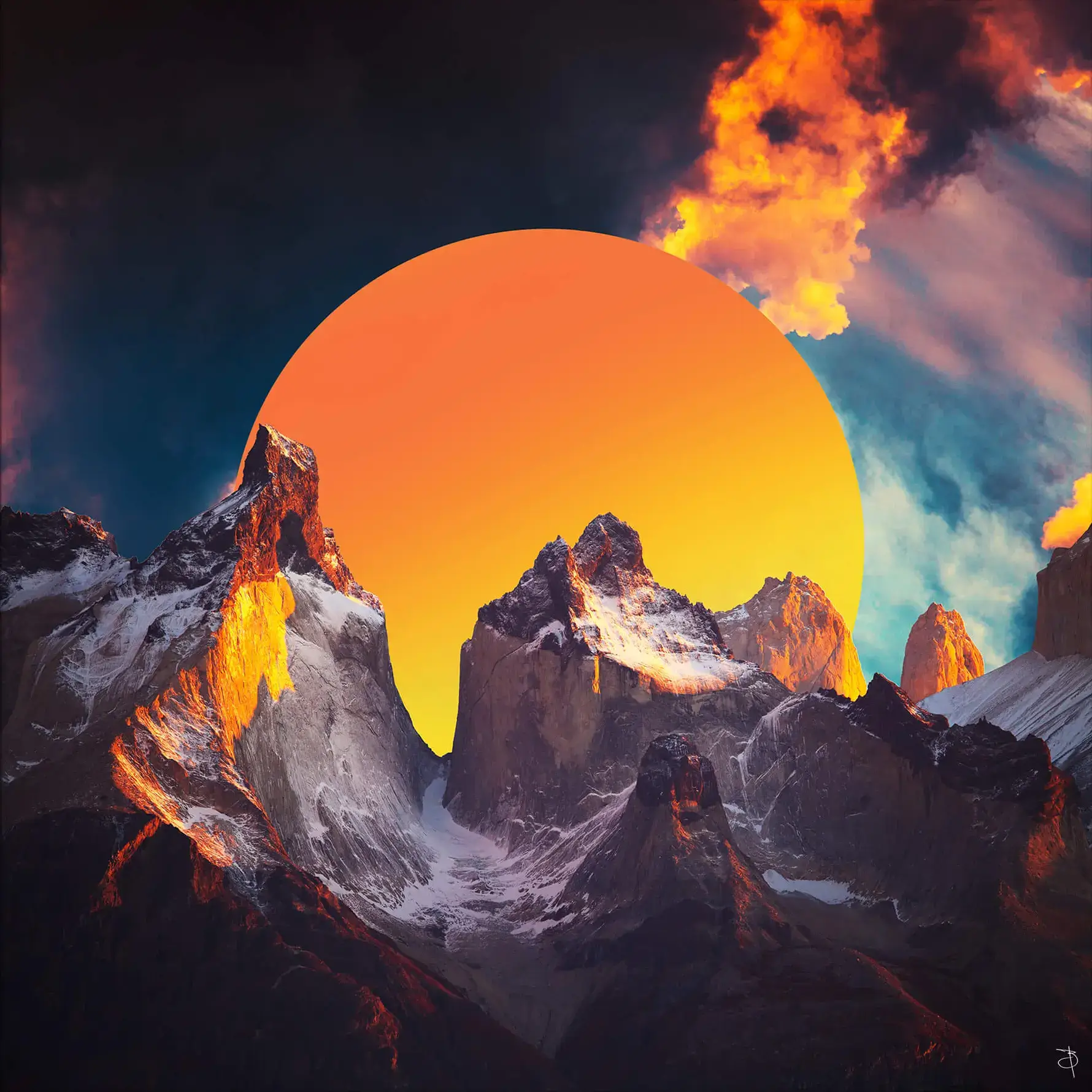 Snow-capped mountain peaks reach up towards a dramatically large, orange sun set against a dusky sky. The contrast of the warm sun and cool blues of the sky creates a striking visual effect. The composition might be digitally created, combining elements of nature in a collage style to amplify their grandeur and beauty.
