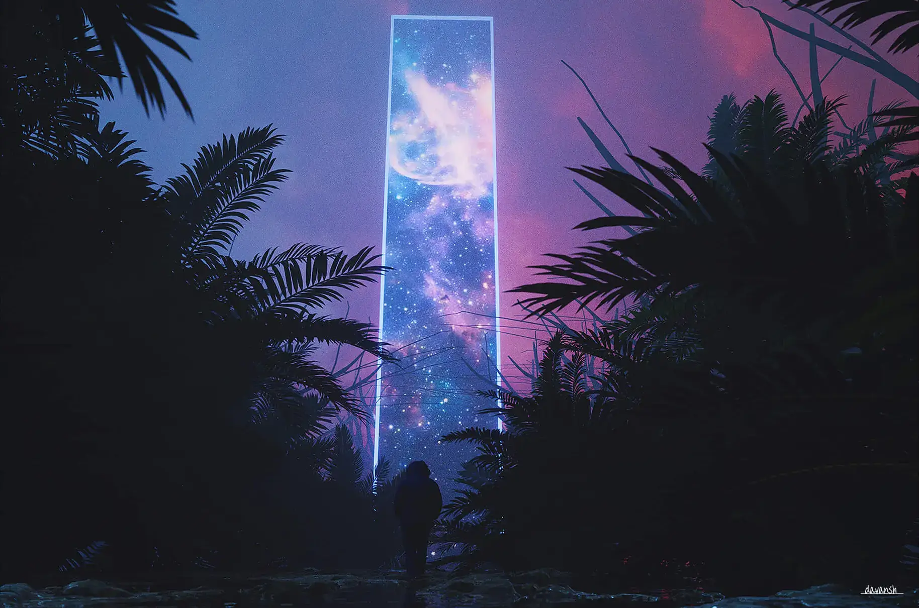 This image shows a person standing in front of a tall, door-shaped portal that looks out into a starry night sky with a bright moon and nebulae. The portal is glowing and seems magical. Around the person are dark silhouettes of palm trees, and it looks like they are in a tropical forest. The sky behind the portal has pink and blue colors, like a sunset or sunrise.