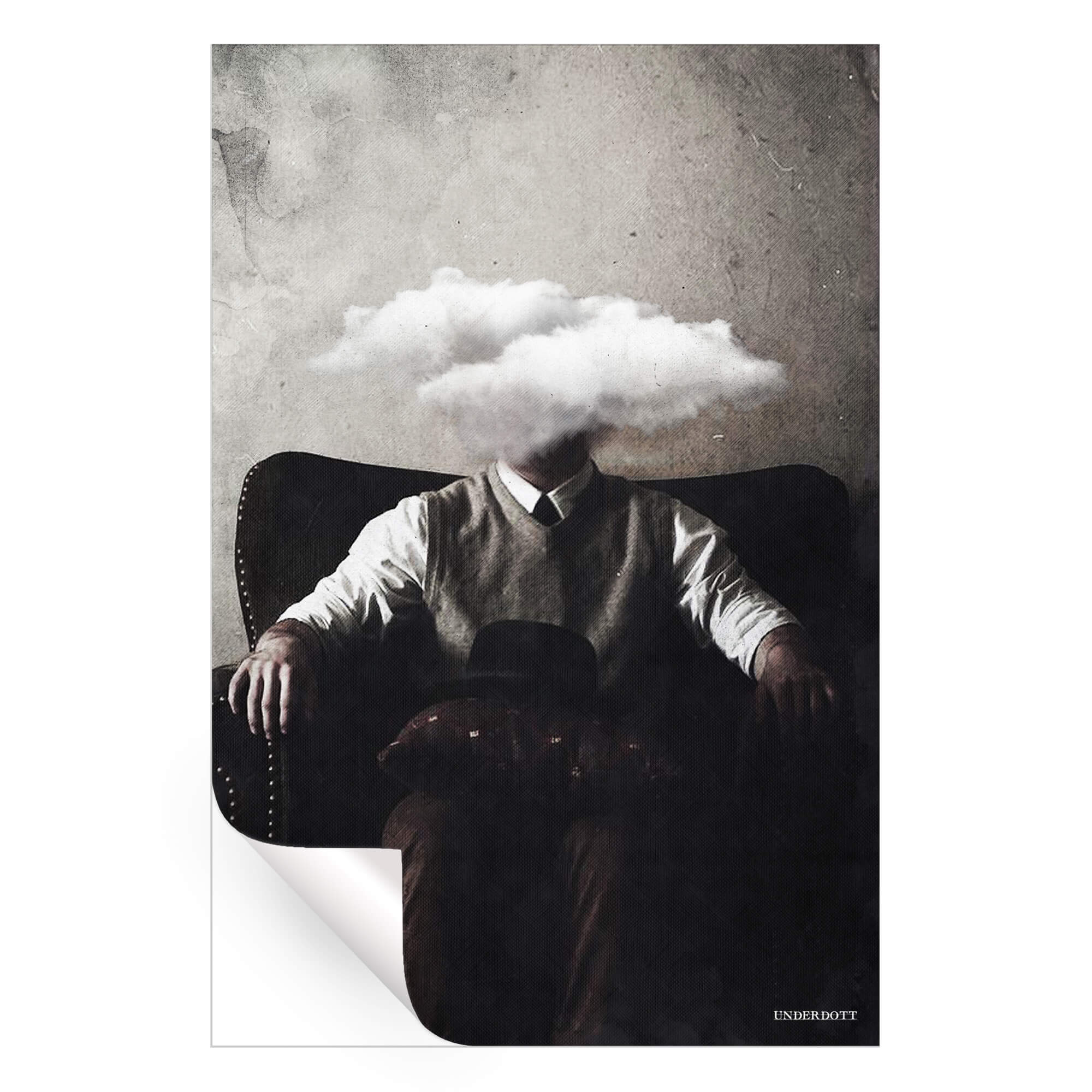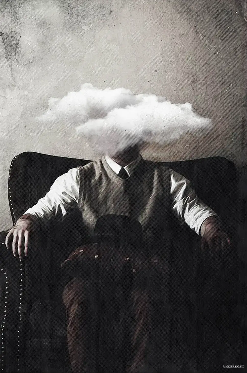 Seated, a figure’s head is replaced by a fluffy white cloud against a textured, neutral background. The figure is dressed in a vintage style and is positioned in tensed posture within a large armchair. Diagonal lines are present throughout the entire composition, adding to the mood of the piece.