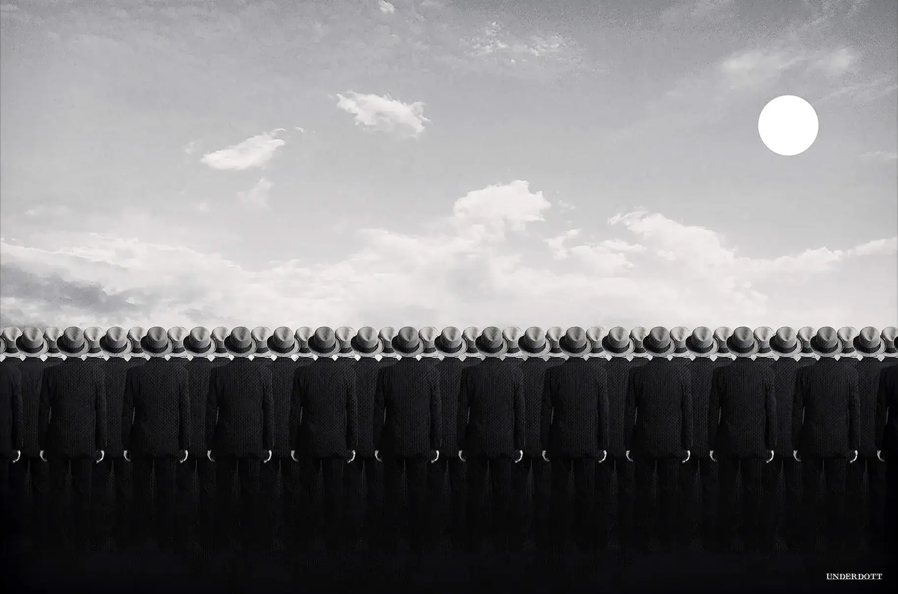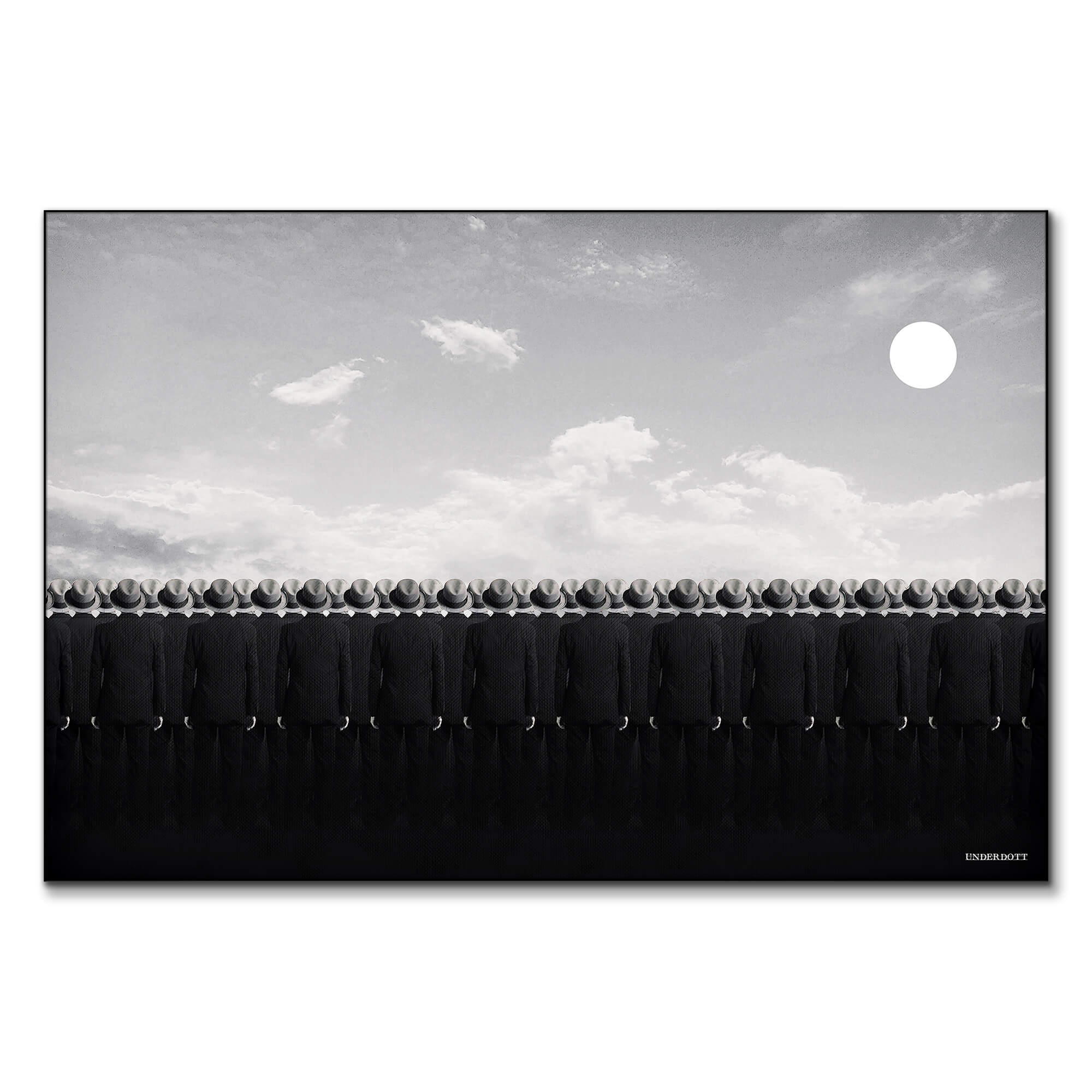 Identical men in dark suits and brimmed hats form two razor-straight rows that run the full width of the painting. Their backs face the viewer, so only silhouettes and the soft curve of each fedora are seen. Above them stretches a pale sky brushed with gentle clouds, interrupted only by a stark white sun that hovers like a minimal coin. The scene is rendered entirely in monochrome, enhancing the hypnotic rhythm created by repeating shapes and tones.