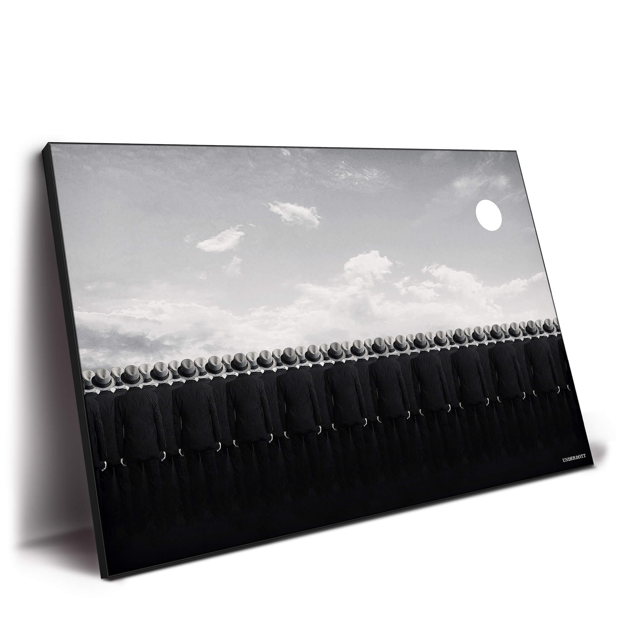Reflection doubles the lower row, so the men seem to stand on a glossy void, amplifying the surreal balance between calm order and quiet unease. The horizon splits the composition almost exactly in half, letting sky and figures share power in the frame. Subtle mid-grays soften the clouds, while deep blacks hold the coats in disciplined blocks. The image feels still, almost meditative, yet the endless repetition hints at conformity. Viewed large, every shadowed brim and soft cloud invites longer contemplation, making this surreal wall art both soothing and thought-provoking.