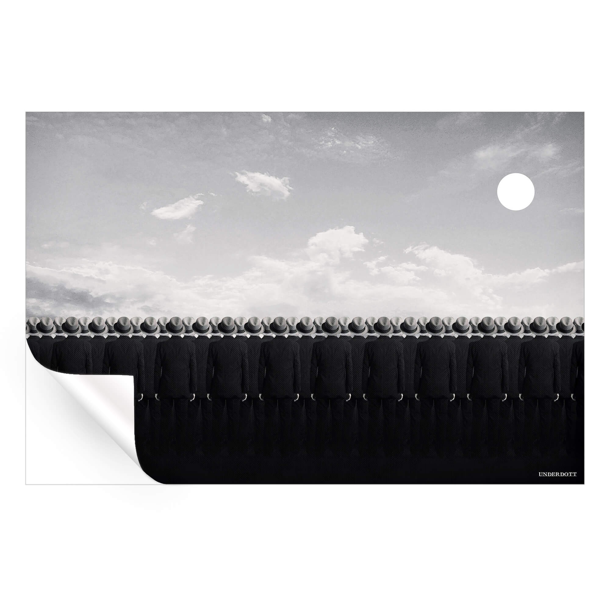 Repeat comes from Underdott, a French visual storyteller known for dreamlike scenes that blend vintage fashion with quiet symbolism. His indie art portfolio often explores anonymity, balance, and minimal palettes, all visible here in the mirrored rows and restrained black and white treatment. Visit the artist link above to view more large wall art prints that share this calm, introspective style.