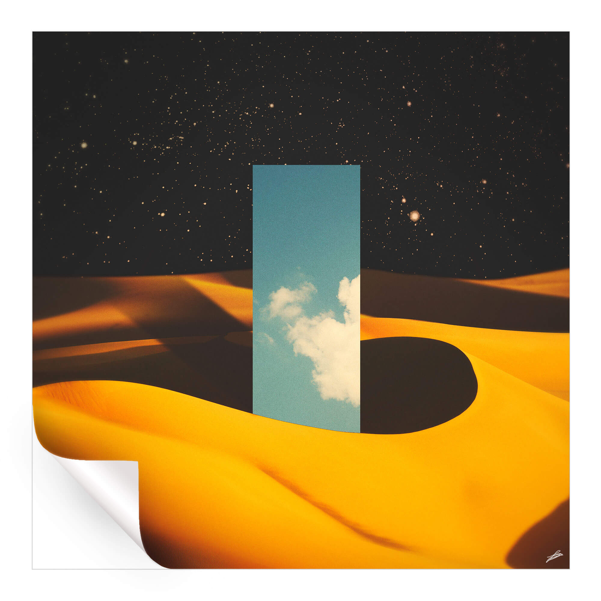 Capturing the essence of the surreal, this wall art features a mesmerizing desert landscape bathed in a golden hue. A mysterious monolith stands at the center, a slice of sky piercing through the sand dunes, juxtaposing the boundless celestial with the undulating earth.