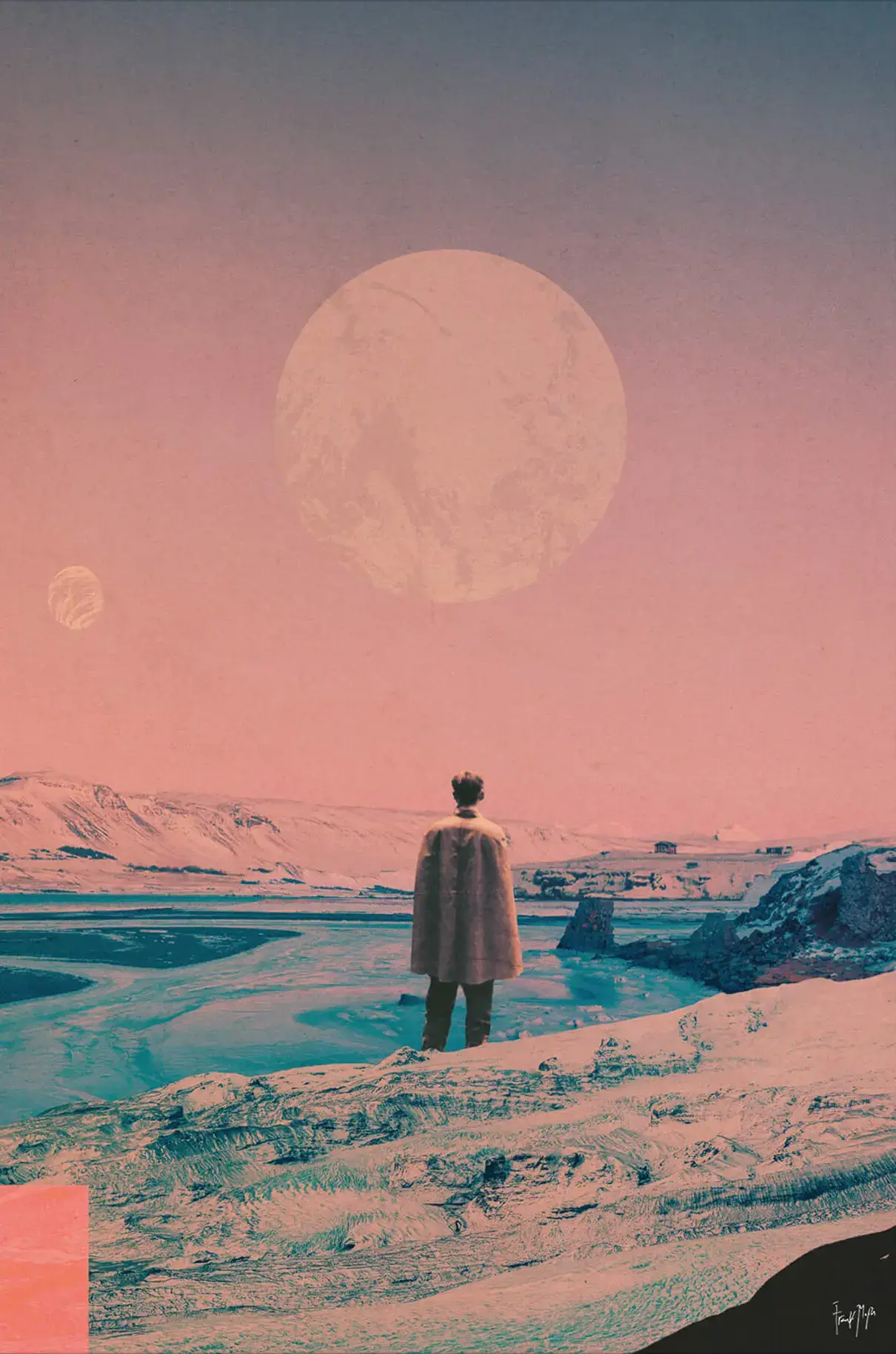 This atmospheric landscape merges surrealism and serenity in equal measure. A lone figure stands overlooking a vast pastel horizon, where icy terrain meets a glowing pink sky and twin moons rise above. The dreamlike tones of blush, coral, and teal make the scene feel both cosmic and human—an image of solitude and awe.