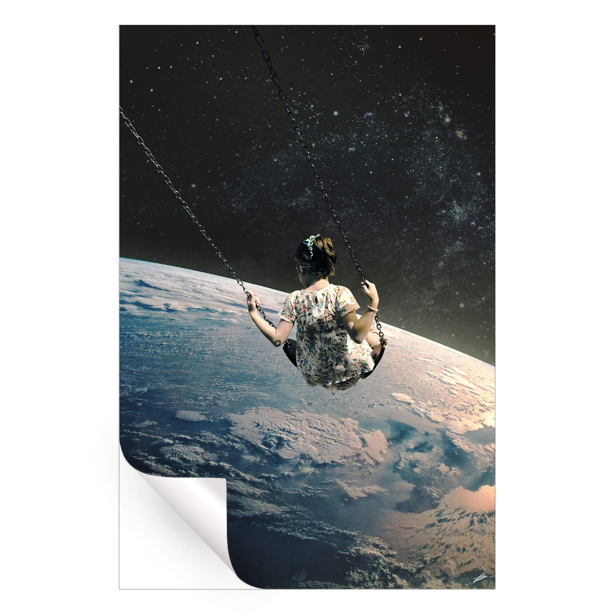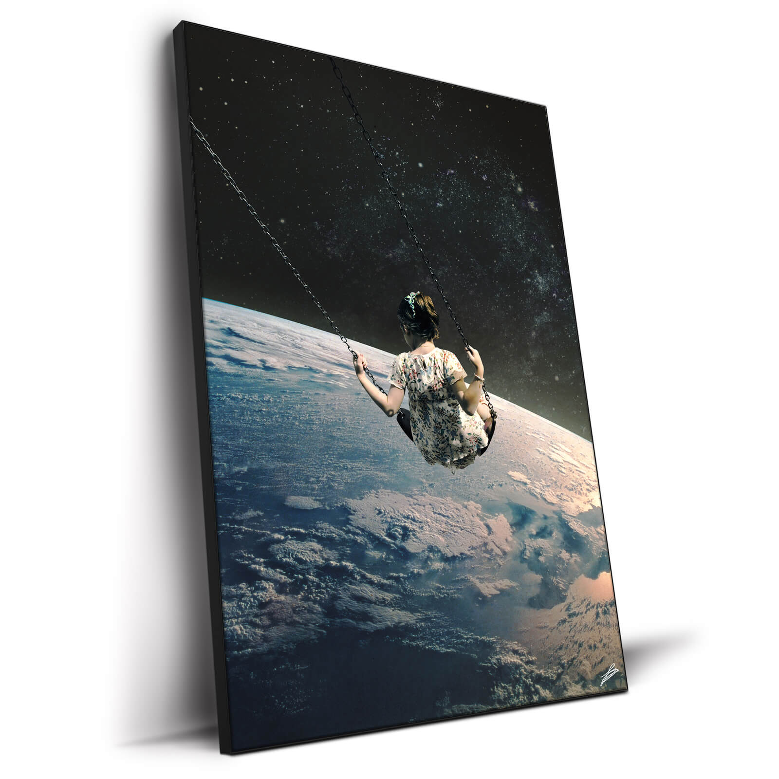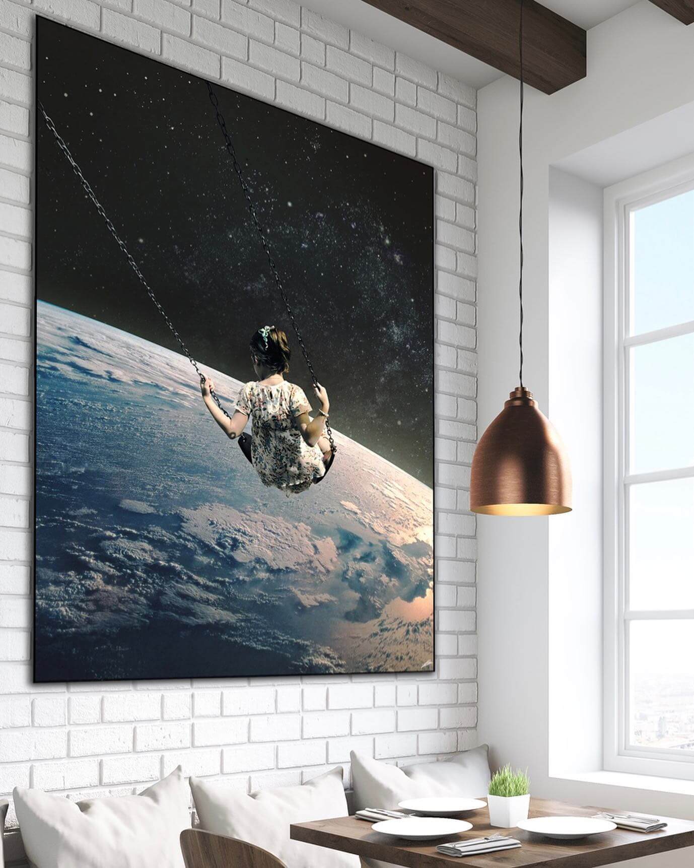 As the subject drifts on a swing hung from celestial bodies, the beauty and vastness of the cosmos unfold in the backdrop, with Earth’s blue hues and swirling clouds far below. This piece is a fantastical ode to dreams and wonder, perfect for anyone who cherishes the magic of the stars and the thrill of the unknown.