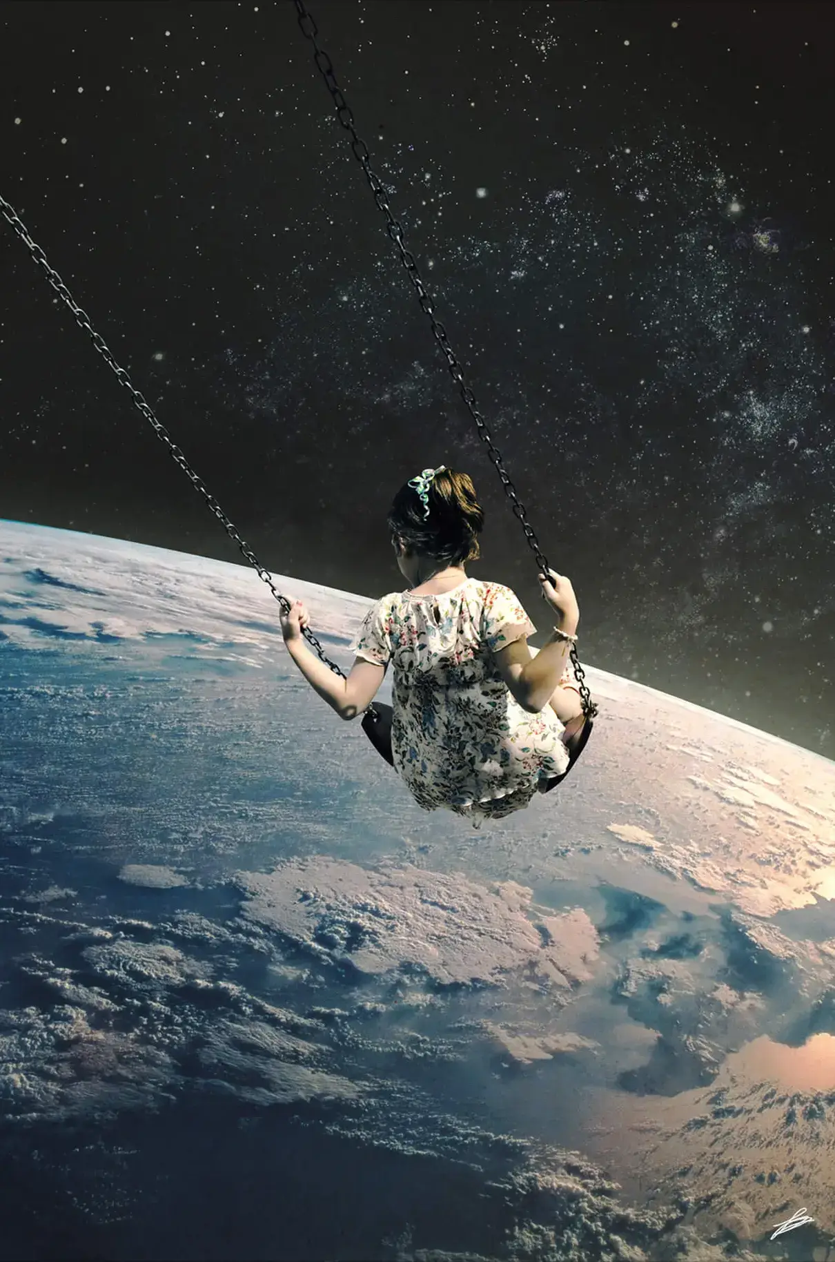 A surreal scene of a figure on a swing, soaring high above Earth’s atmosphere. The image blends the nostalgia of a childhood swing with the boundless realms of space, inviting the viewer into a universe where imagination defies gravity.