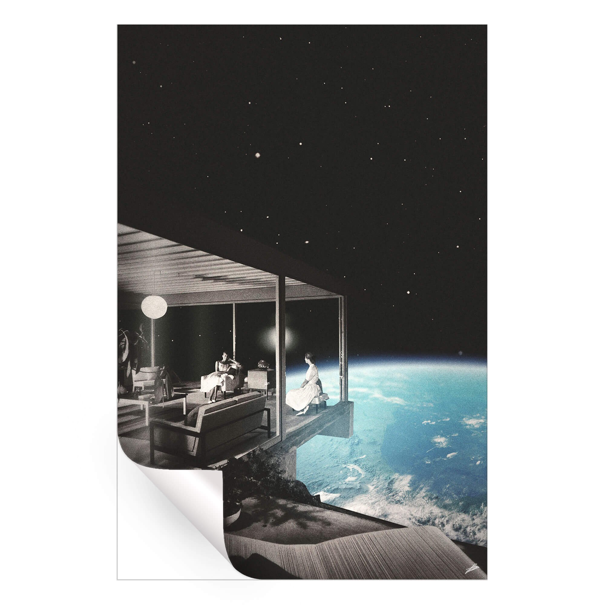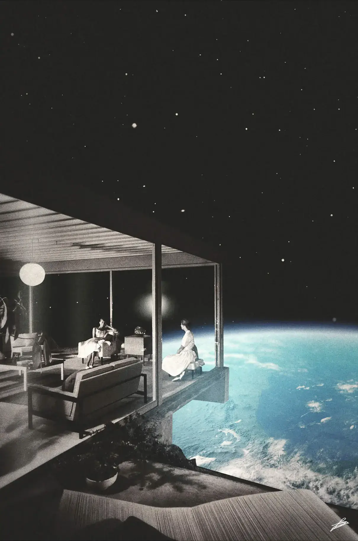 This thought-provoking wall art presents a surreal juxtaposition of a cozy, modern living room effortlessly floating above the Earth’s atmosphere, offering a unique blend of domestic familiarity and the boundless expanse of space.