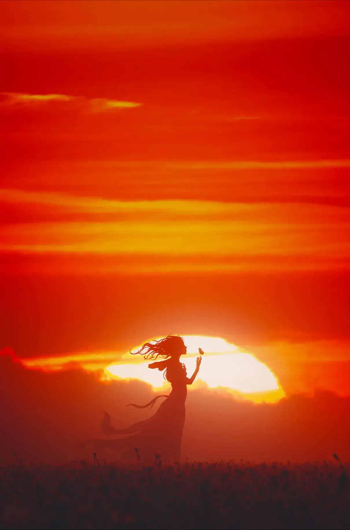 The image features a person standing in a field with a flowing dress and hair blowing in the wind. Behind them, the sun sets in a dramatic, fiery orange sky with streaks of clouds. The person appears to be in a pose of freedom or celebration. Ears to be a field with wildflowers, backed by a range of mountains under a clear sky.