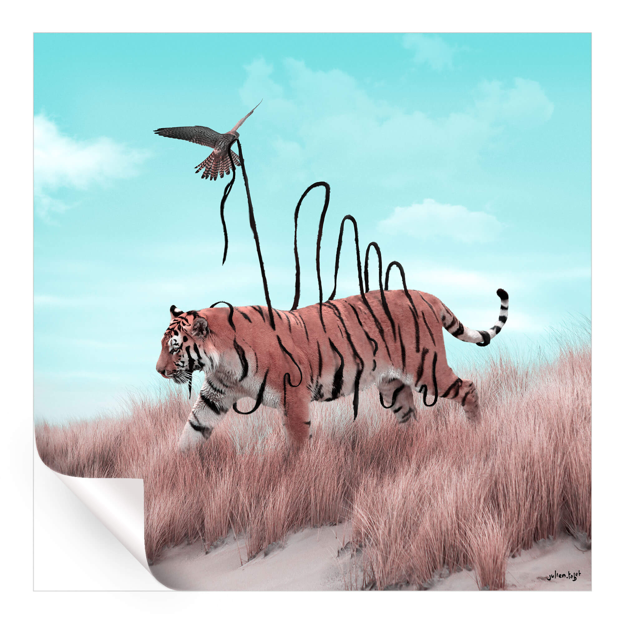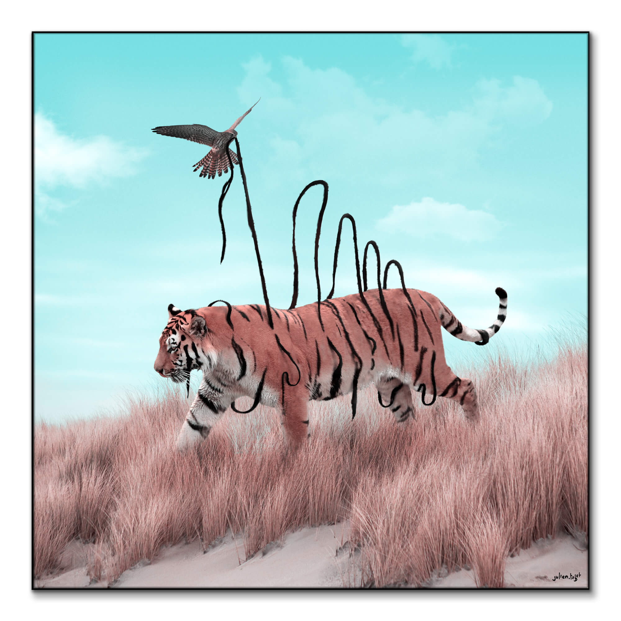 Above, a single bird seems tethered to the tiger by these same ethereal strands, as if engaged in an impossible flight of fancy.