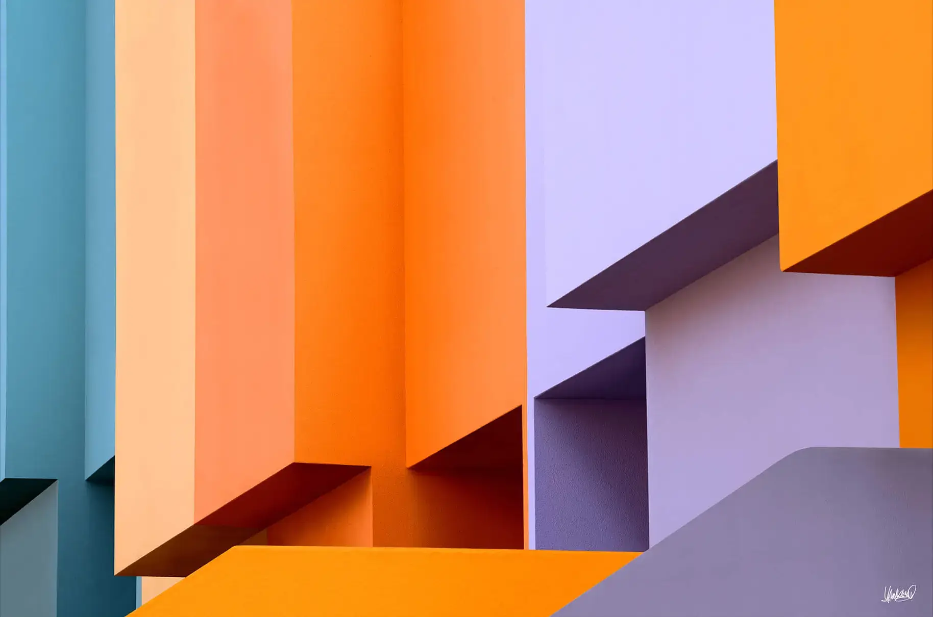 An abstract view of a building showcases a harmonious blend of teal, orange, and lavender blocks. The geometric forms and sharp angles create a visually engaging composition, while the contrasting colors add depth and vibrancy. The light and shadow on the surface of the structure enhances the three-dimensionality of the design, making it both intriguing and aesthetically pleasing.