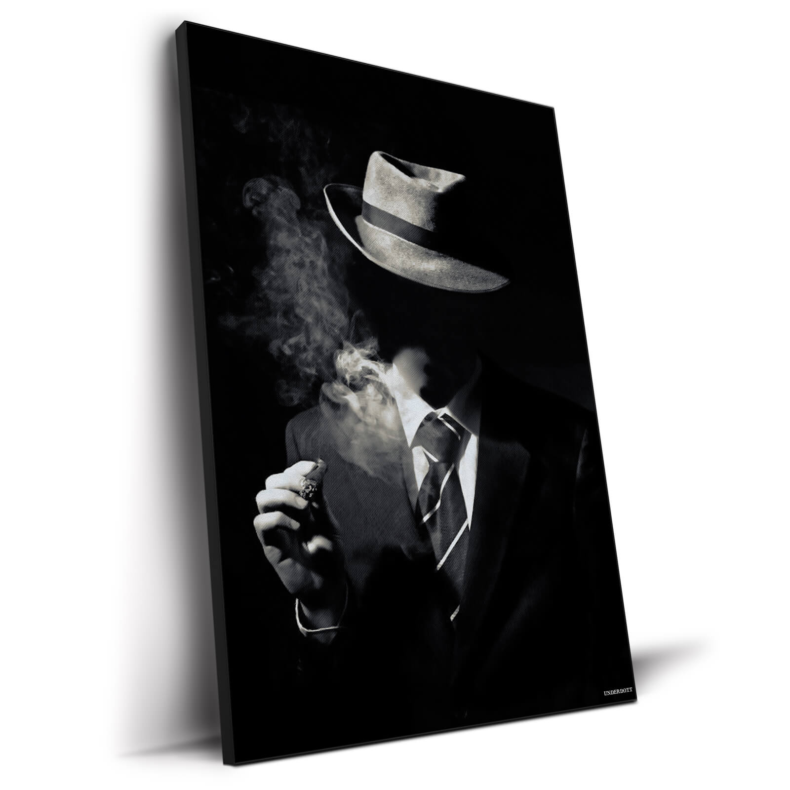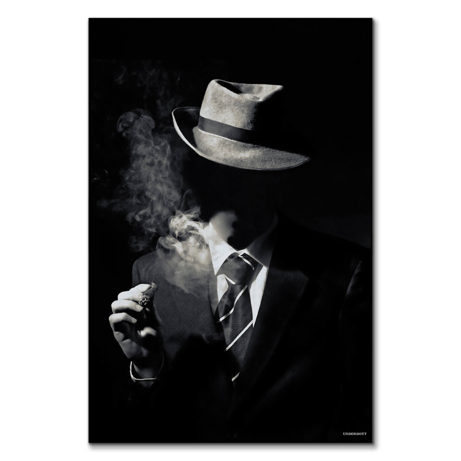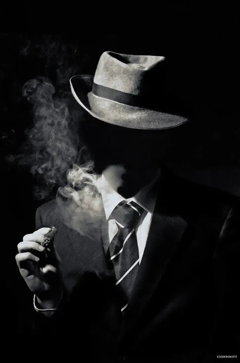 A person is obscured by shadows and smoke, the figure’s face hidden by a fedora. a cloud of smoke drifts from a cigar held in their hand. The smoke swirls around the hat and the sharp lines of a suit and tie, adding a film noir aesthetic. A patchwork texture is applied over the entire image, adding to its intrigue.