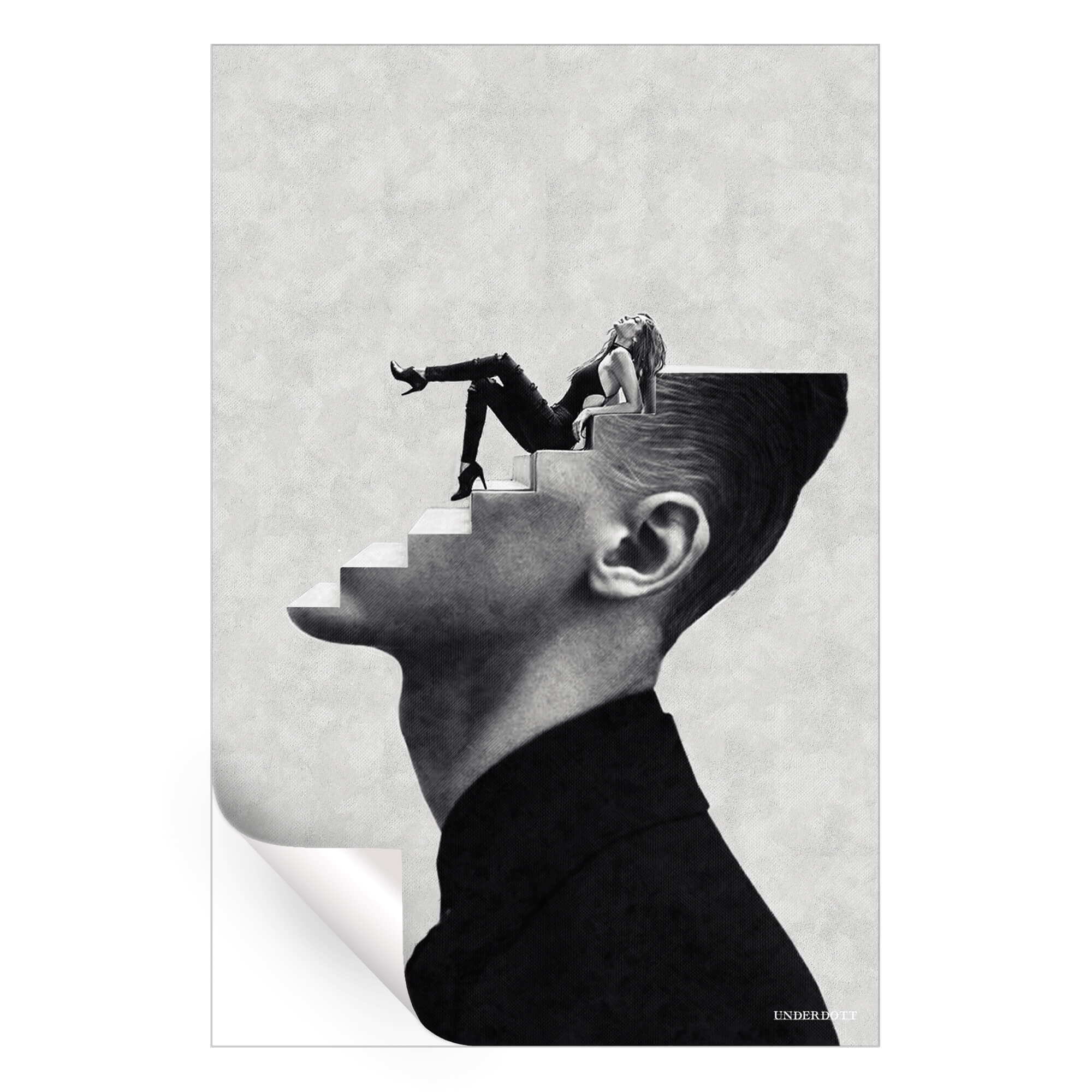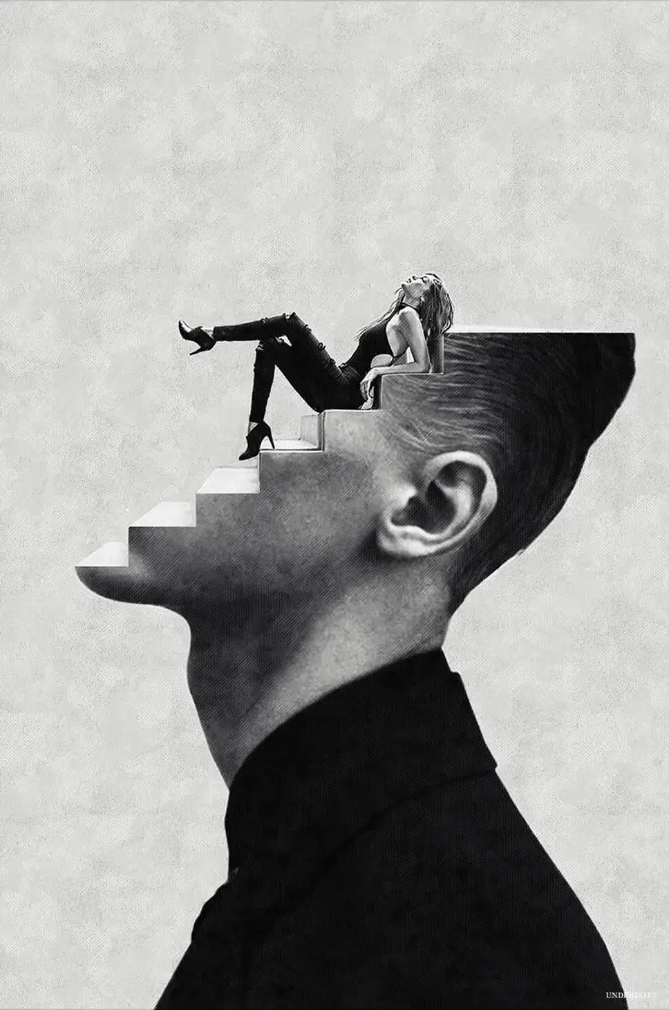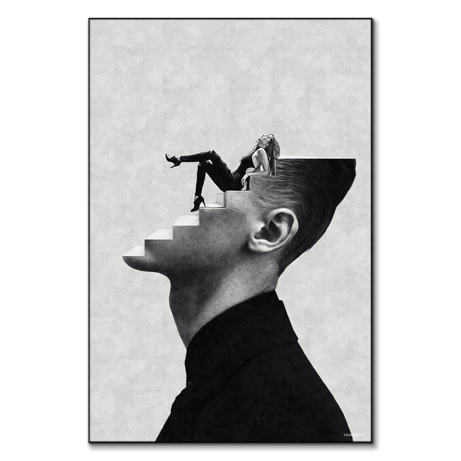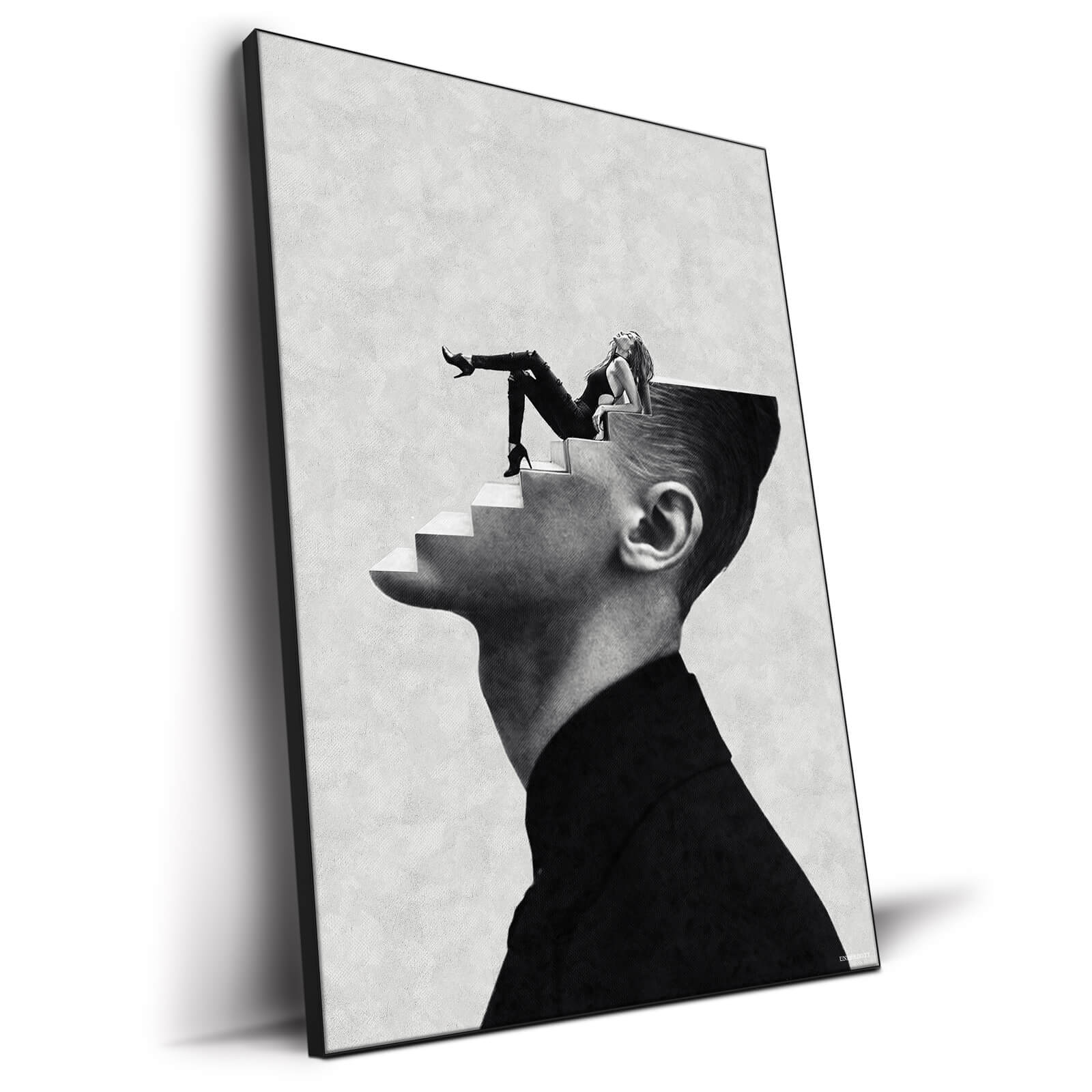 Monochromatic and surrealist, a profile forms a set of stairs, leading up to the top of his head. At the summit, a reclined woman poses, foot pointed in the air.