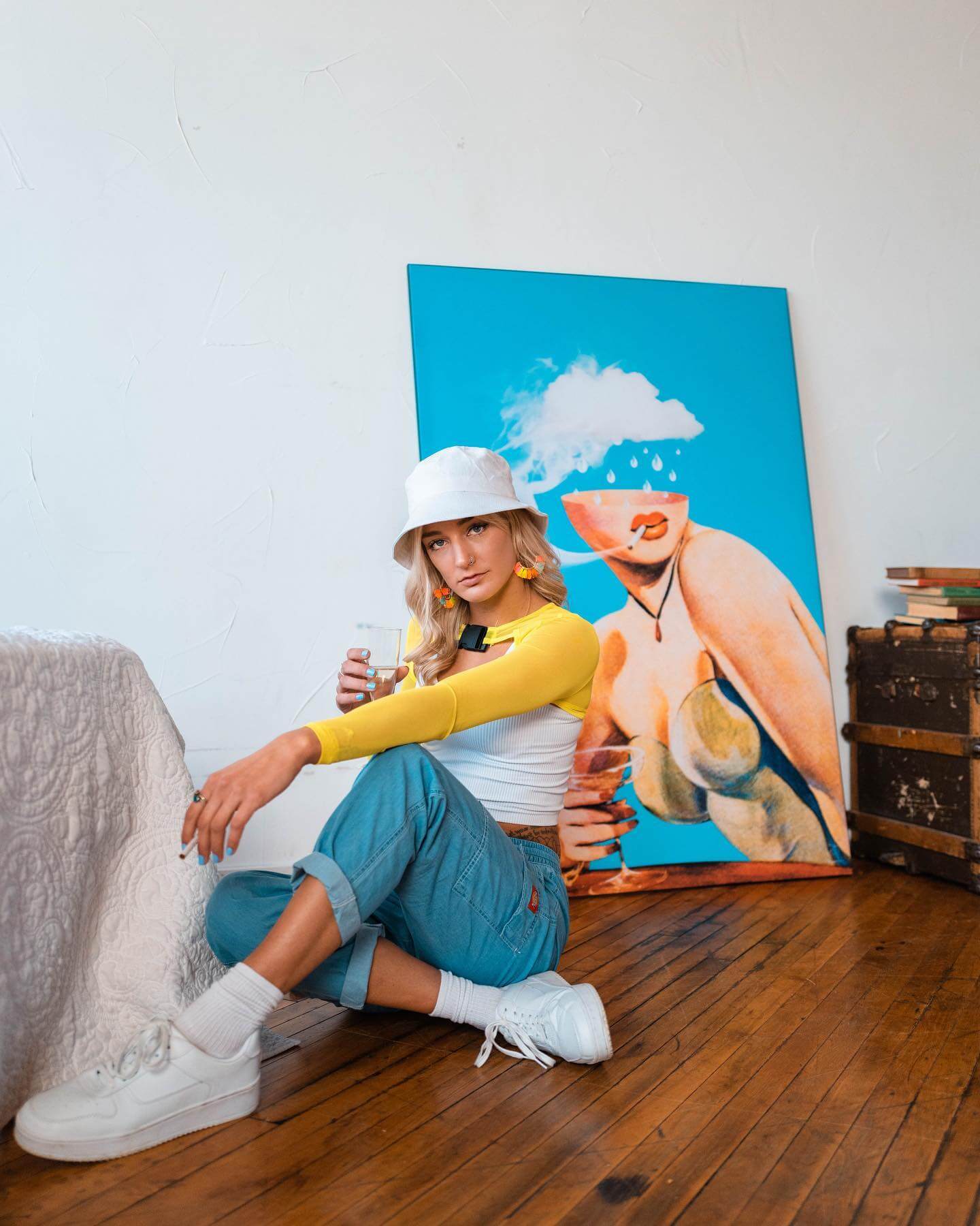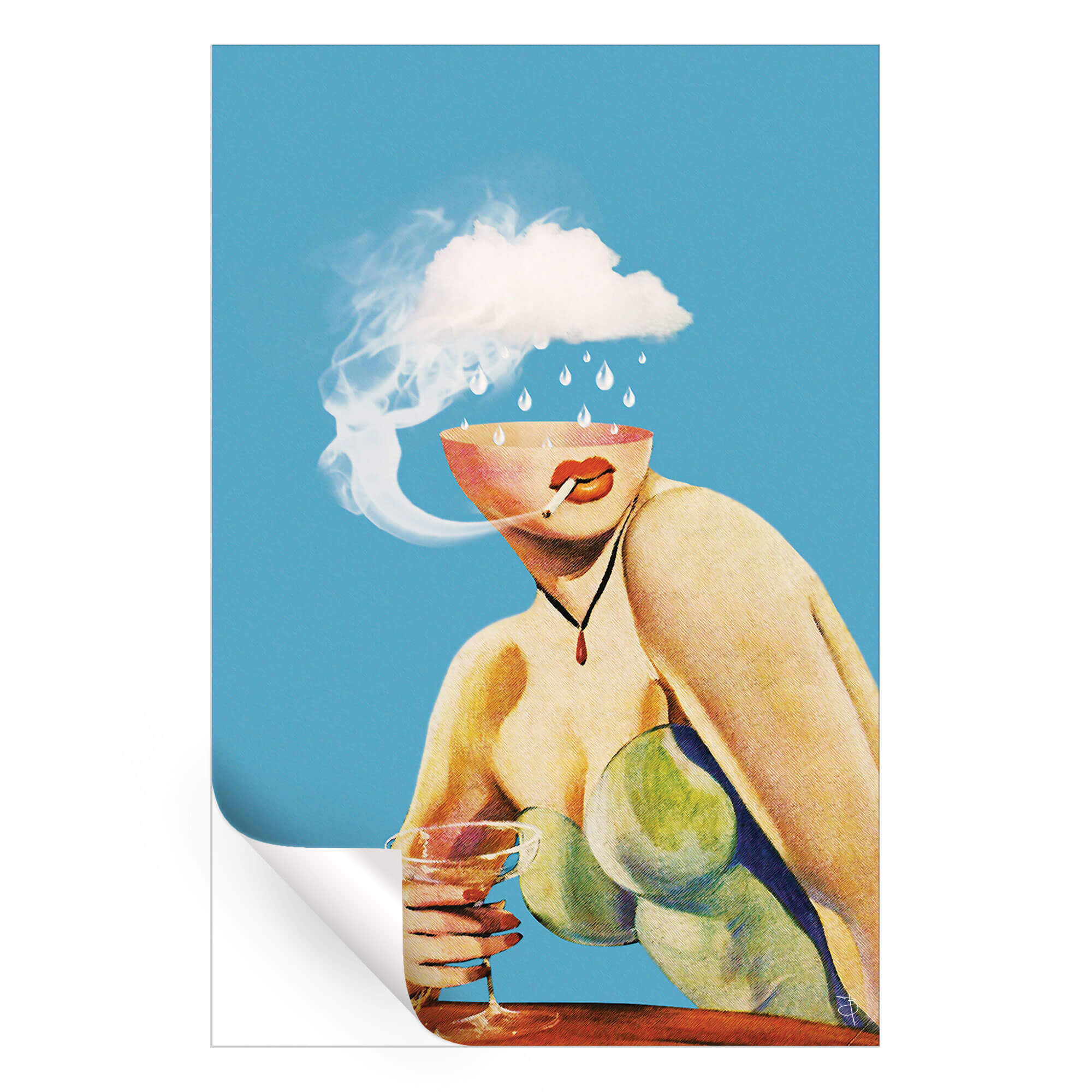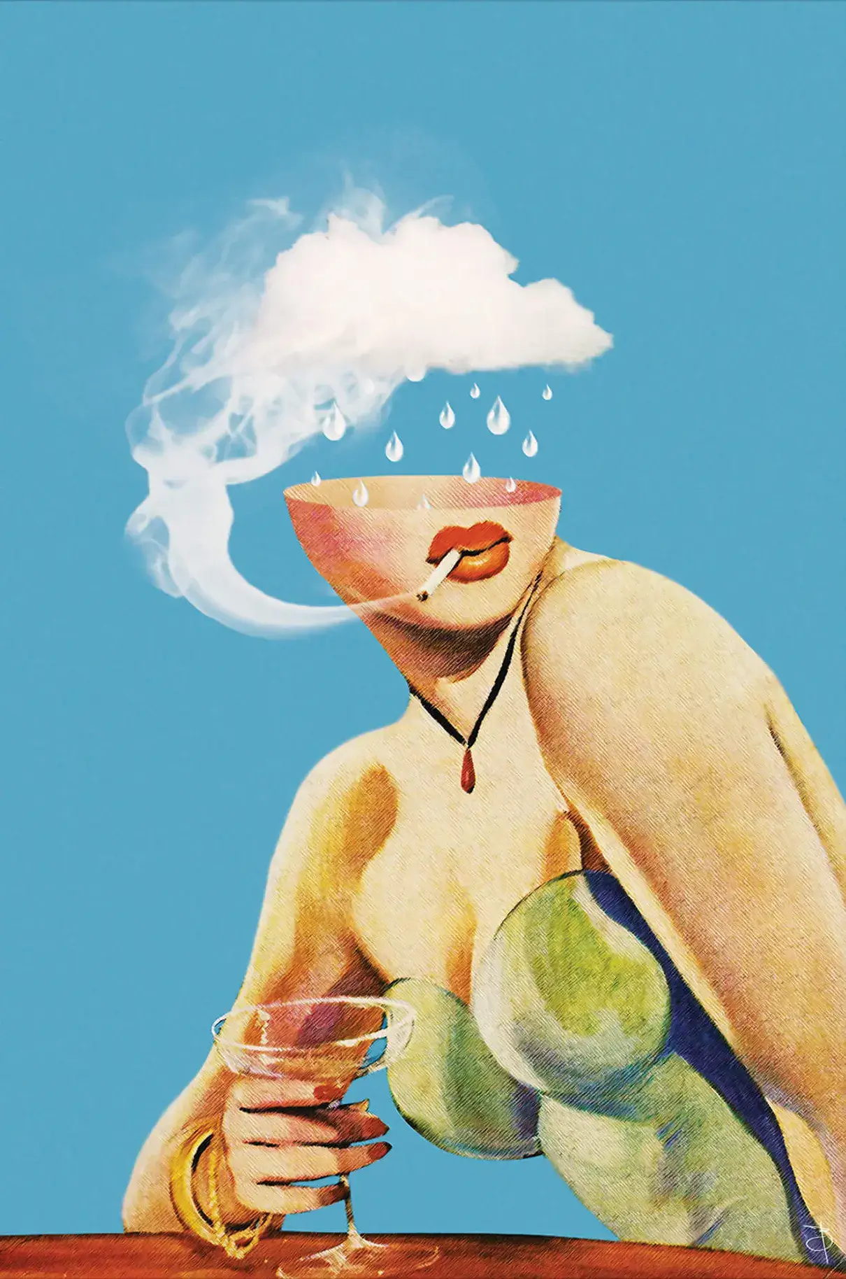 A female figure is portrayed with an inverted umbrella for a head, with a cloud above it showering rain inside. She has a cigarette in her mouth and a glass in her hand against a stark blue background. This surrealistic artwork blends the everyday with the fantastical in a striking visual metaphor.