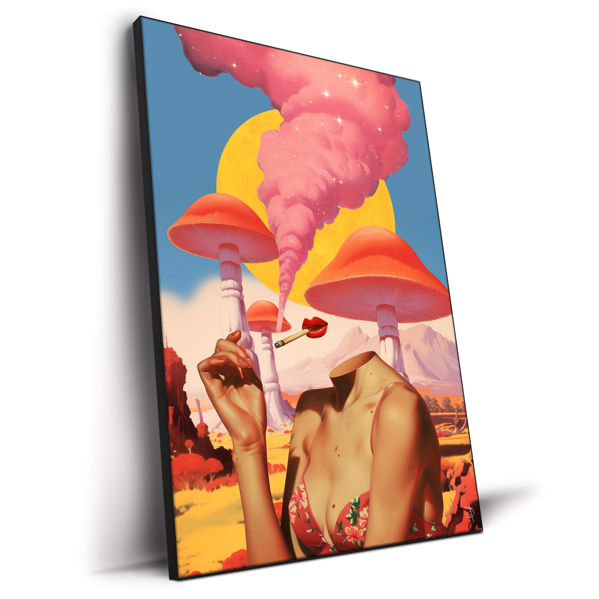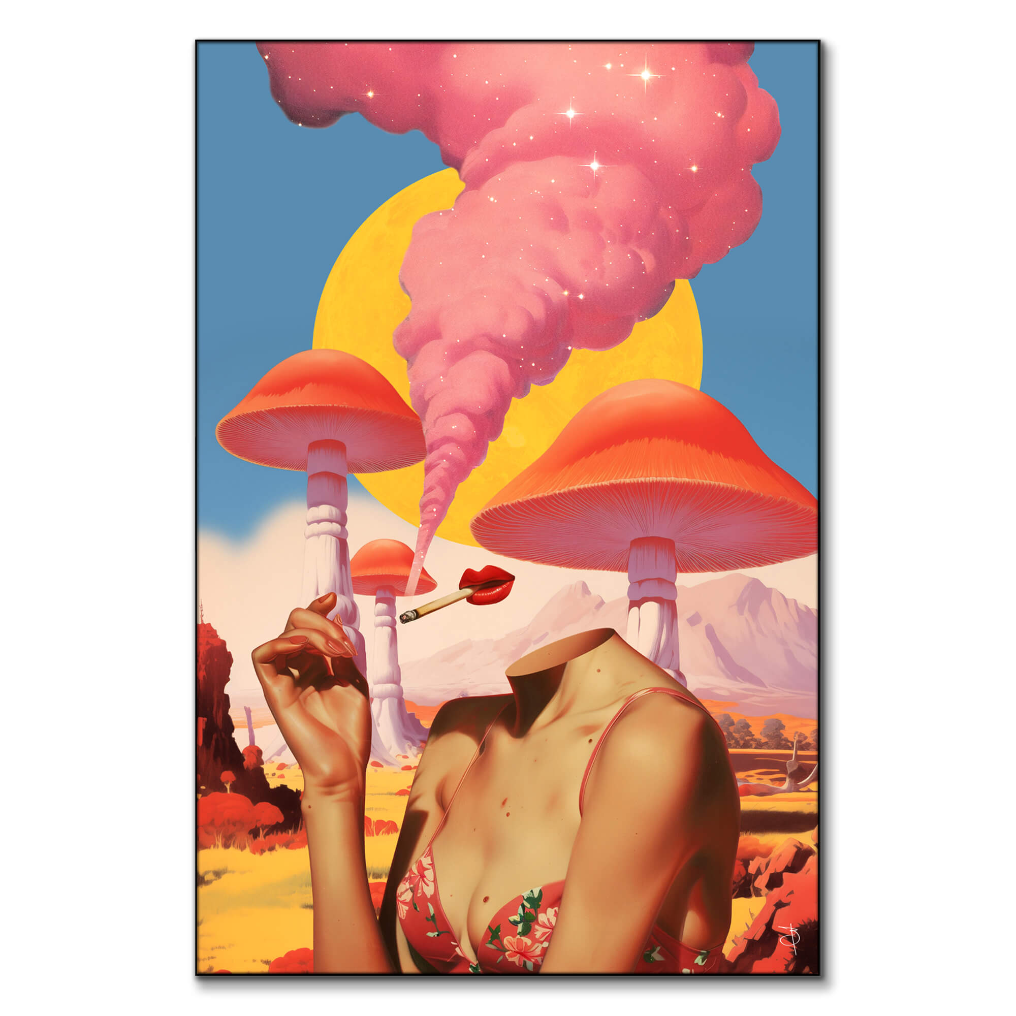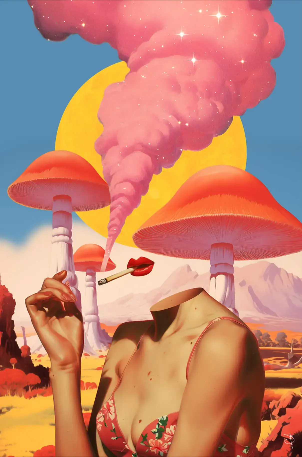 A woman’s headless figure stands against a backdrop where reality blends into fantasy. Giant fungi hover of the landscape, while a giant sun hangs low, casting a warm glow. A lit cigarette creates a bright pink plume that is littered with stars.