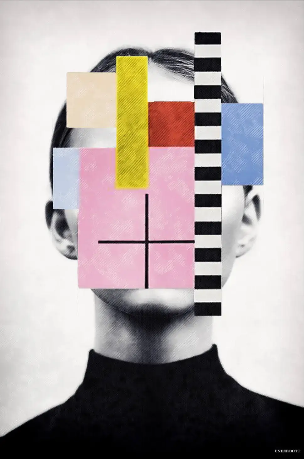 The figure’s face is segmented by rectangles and squares in a palette of muted pastels, yellows, reds, and, with a vivid vertical stripe of alternating black and white. A thin linework texture is applied over the image for added texture.