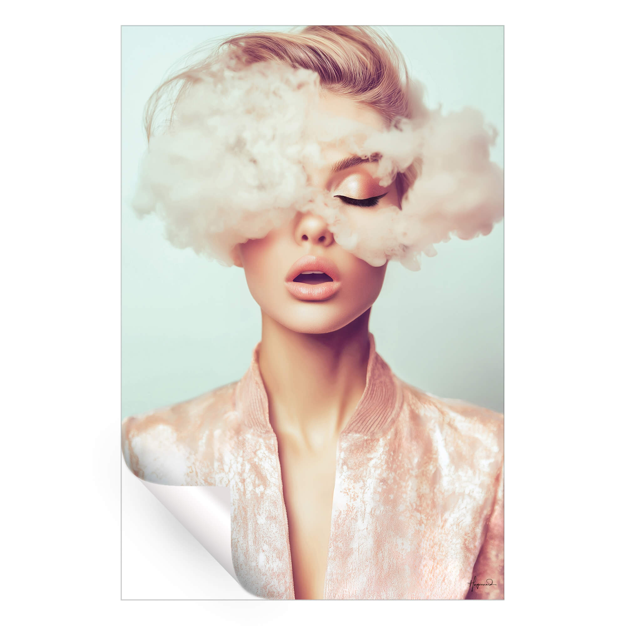 A blonde figure stands against a soft mint backdrop, her eyes hidden behind billowy clouds that float across her face. The vapor looks weightless, almost dream-like, turning her expression into a quiet mix of calm and curiosity. Her slightly parted lips and relaxed posture give the moment a hush, like she’s caught between thoughts or drifting into a daydream.