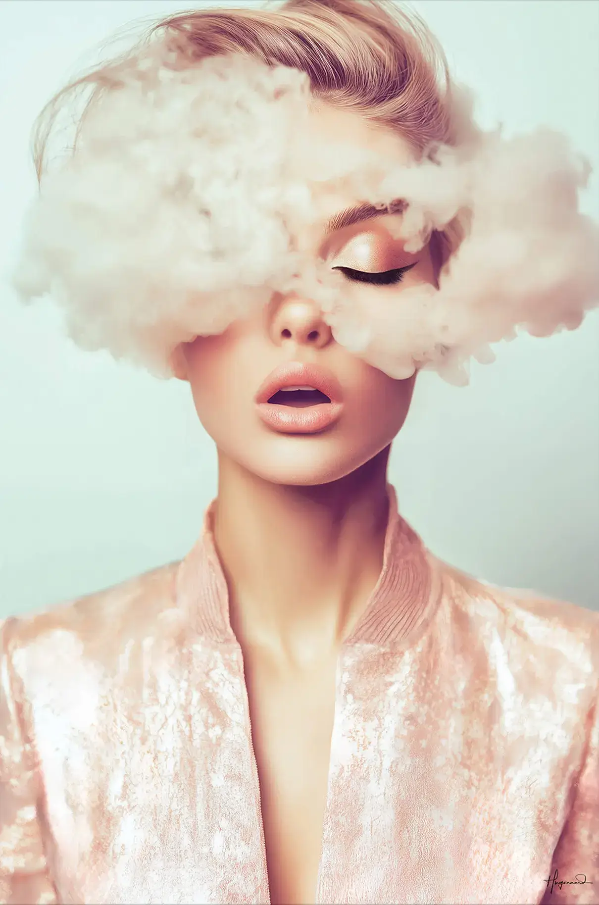 A blush satin jacket catches the light just enough to add shimmer, balancing the airy clouds with a touch of luxe texture. Warm peach and rose tones blend with cool mint and soft turquoise, keeping the palette light and modern. Subtle shadows around her collarbone add depth without distracting from the main surreal moment.