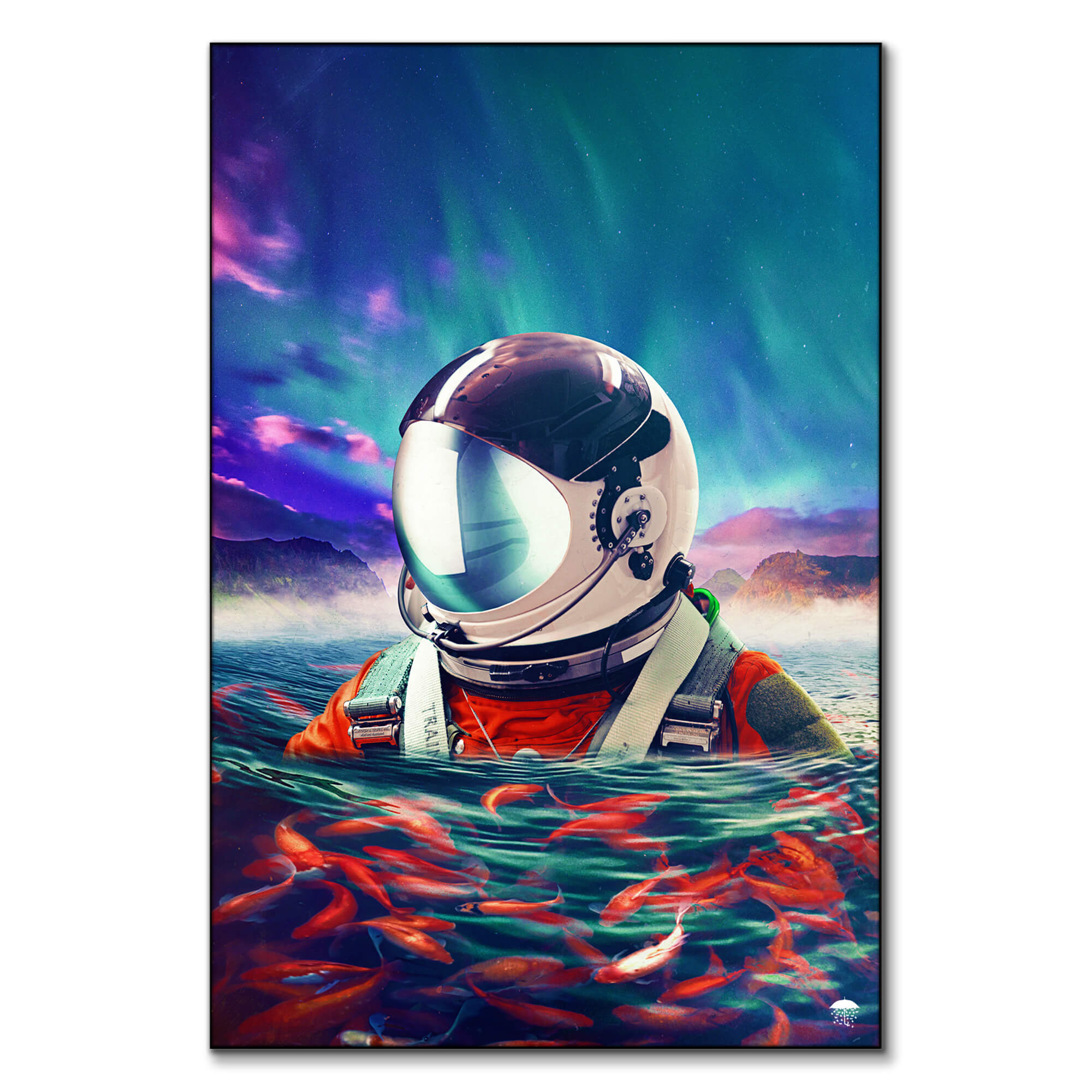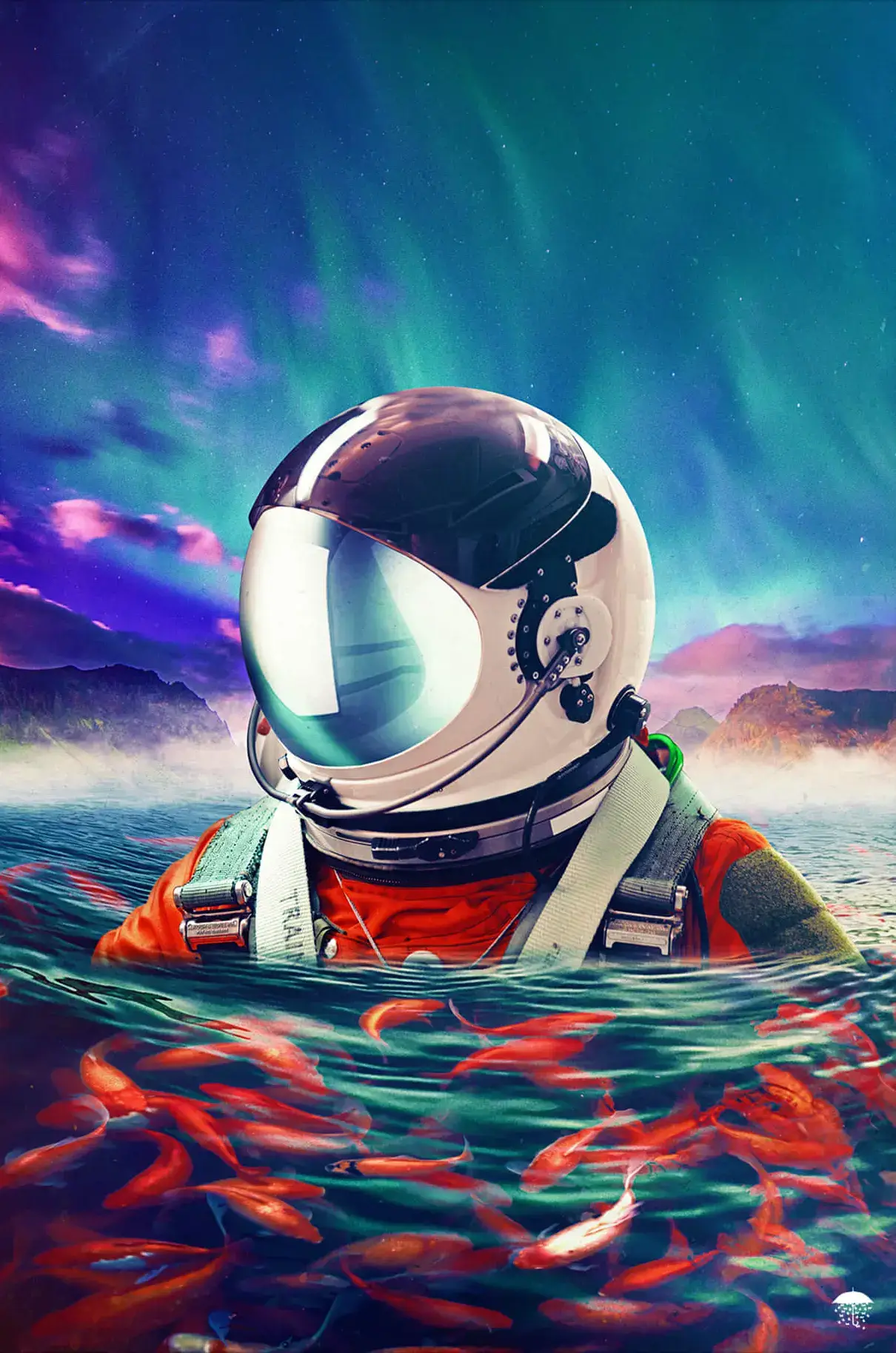 Donning an orange suit and a polished visor, an astronaut emerges from an expanse of water teeming with red fish. Above, the sky is a surreal mix of aurora-like lights, with hues of purple and green against a celestial backdrop.