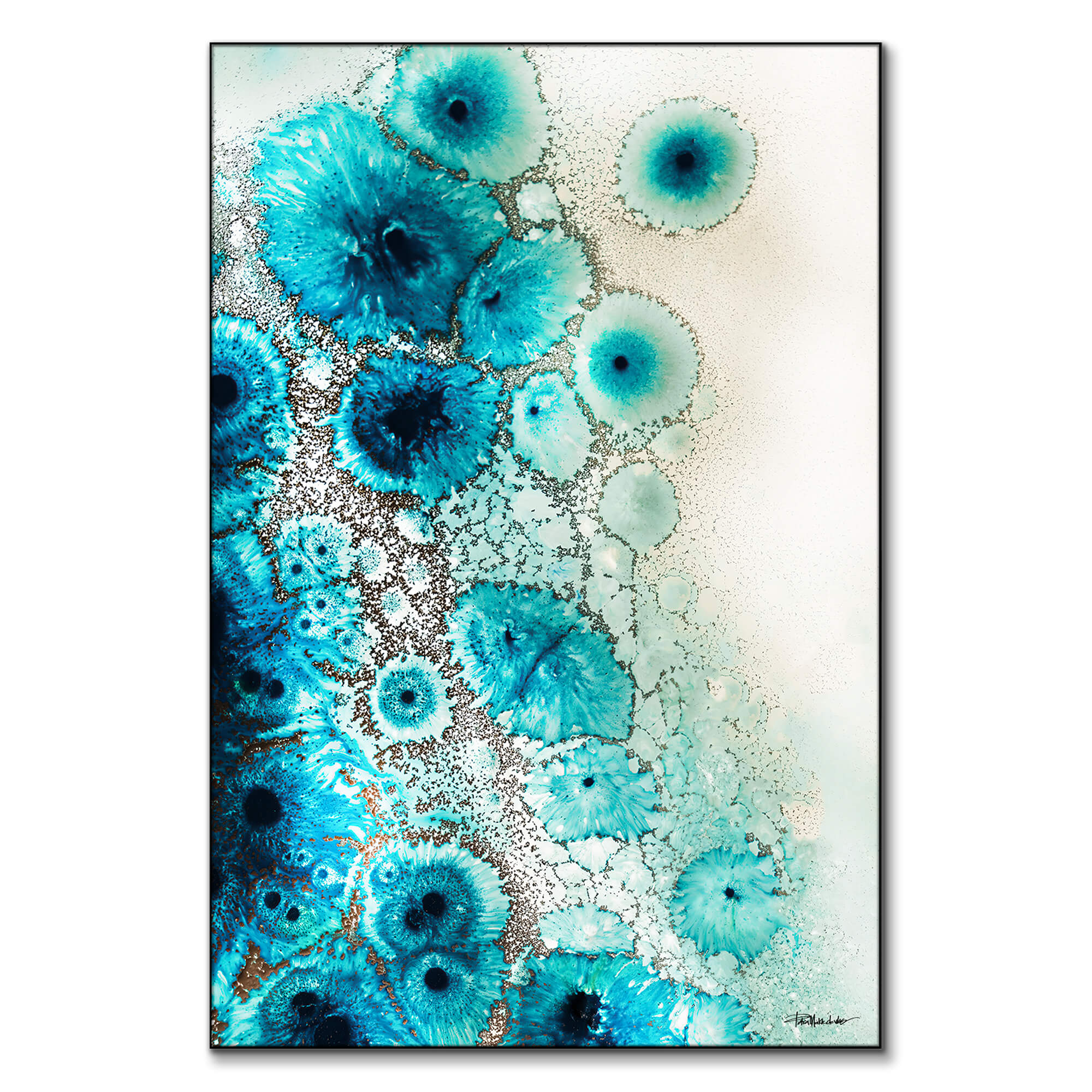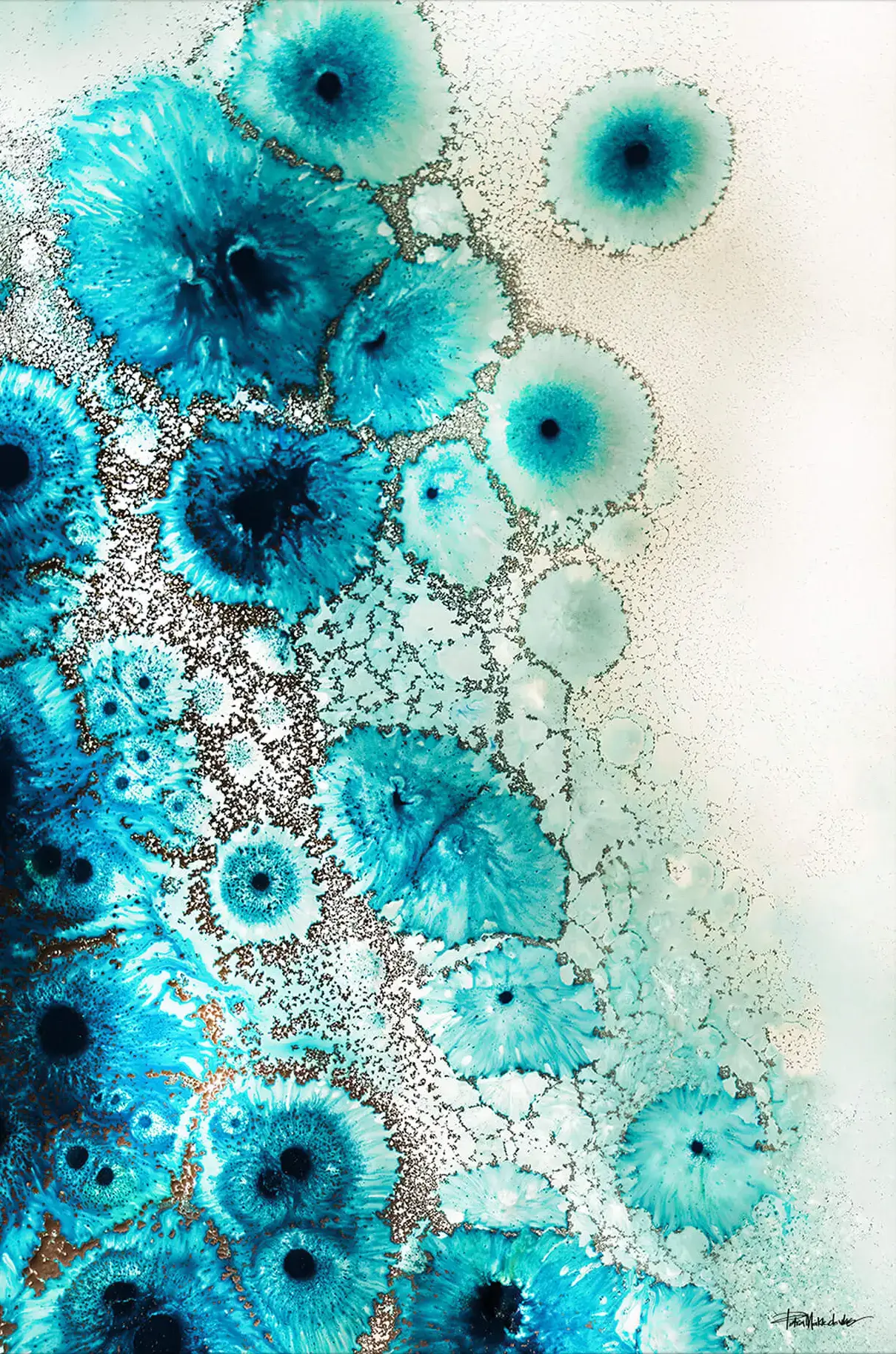Dive into the depths of the ocean with this mesmerizing abstract painting. Featuring vibrant bursts of deep blue and aqua, this artwork evokes the beauty and complexity of underwater coral reefs or waves captured in motion. The intricate layering of colors and patterns creates a captivating flow, drawing the eye and inviting contemplation. The organic forms and cool tones make this piece perfect for coastal-inspired decor or modern interiors seeking a touch of nature’s energy.