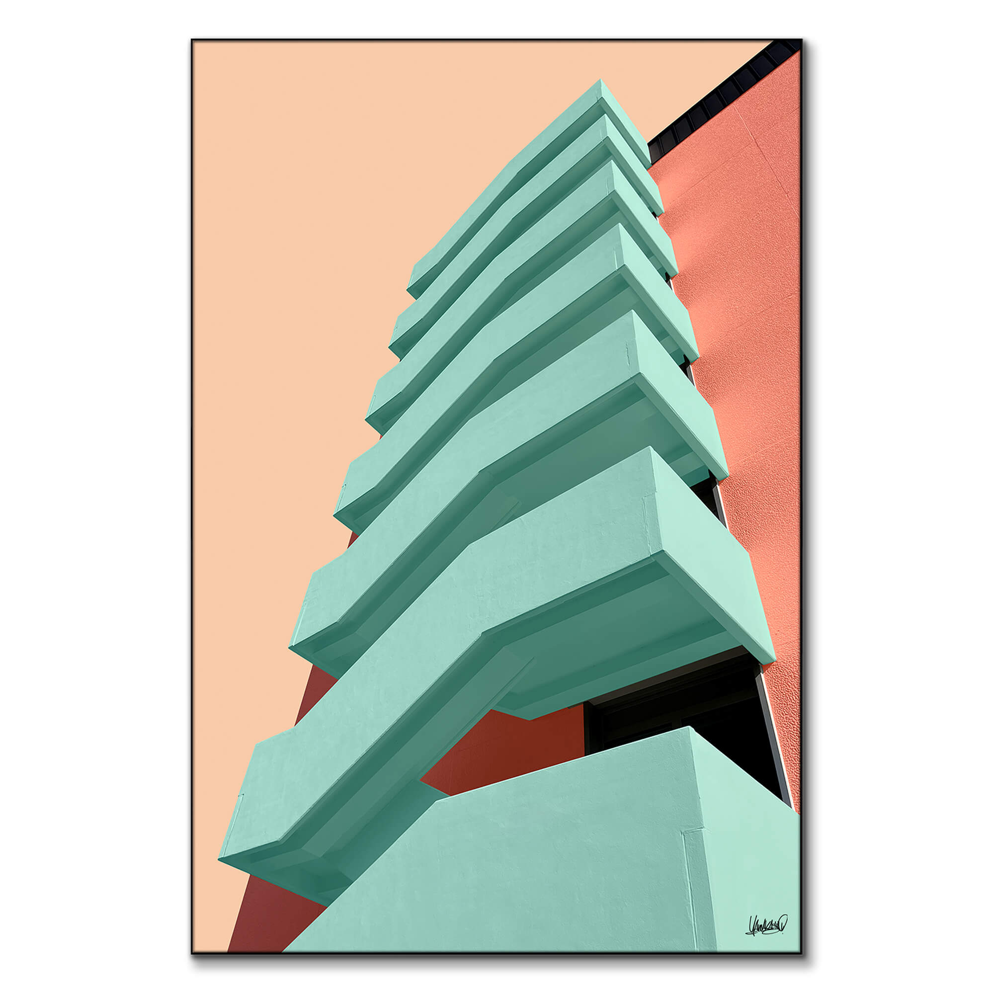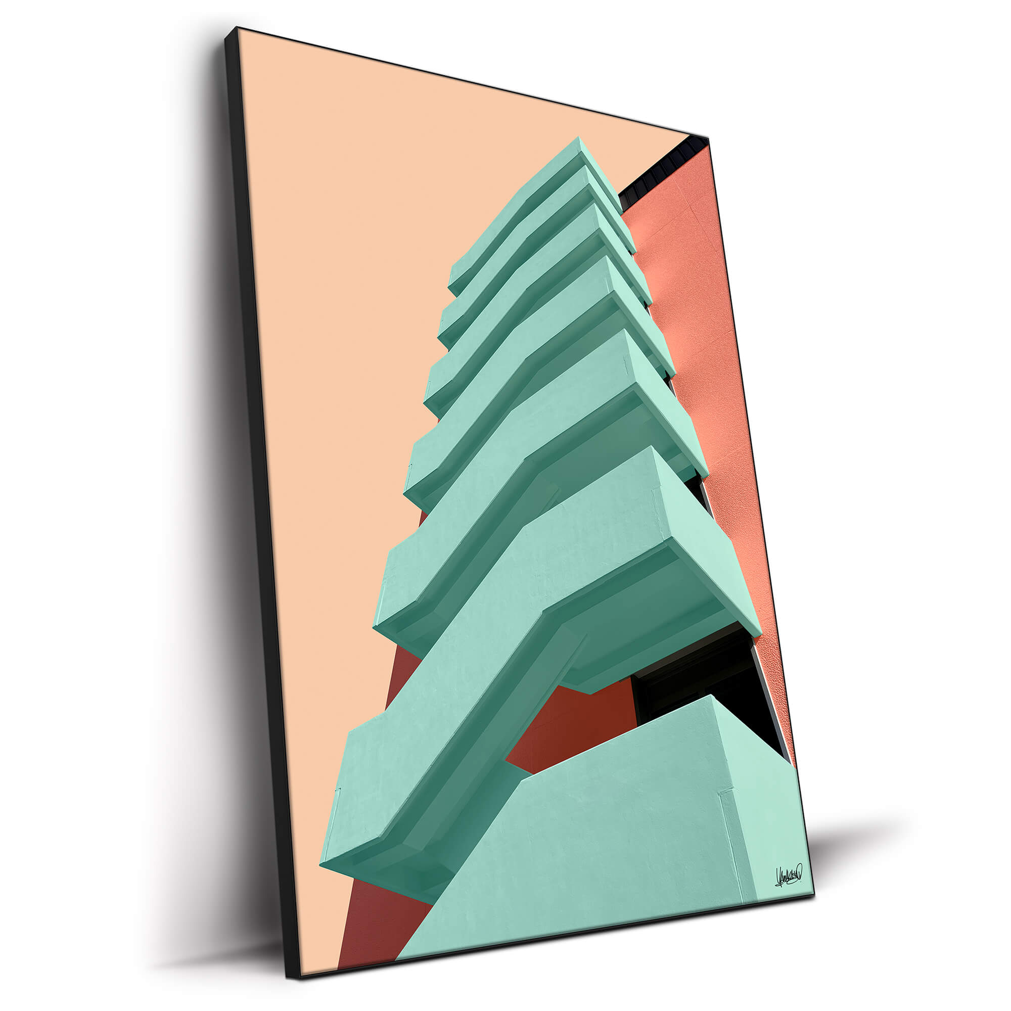 This surreal architectural composition transforms everyday geometry into something extraordinary. A mint-green staircase juts sharply against a coral-toned wall beneath a soft peach sky. The bold color contrast and exaggerated angles create a clean, minimalist dreamscape that feels both familiar and futuristic.