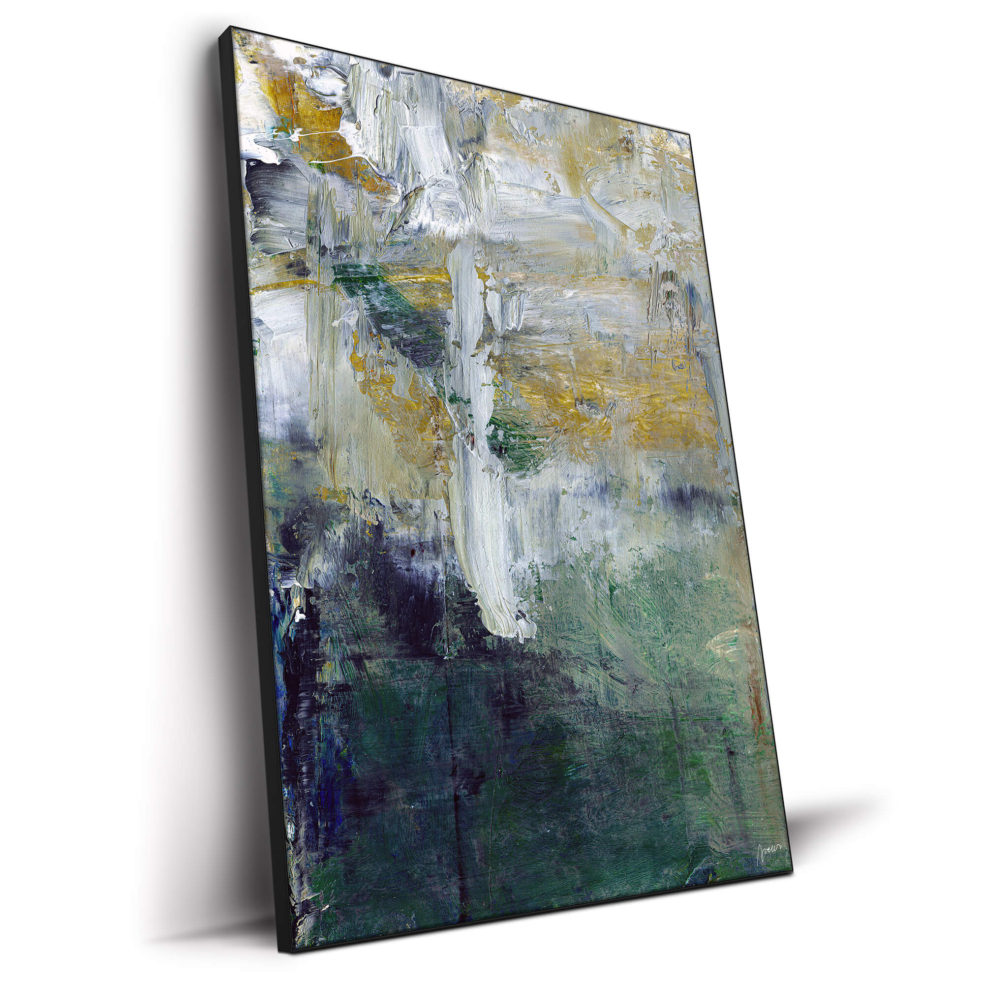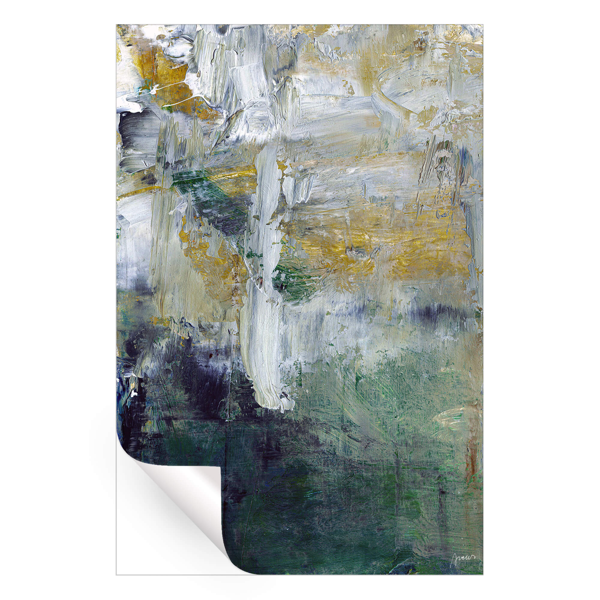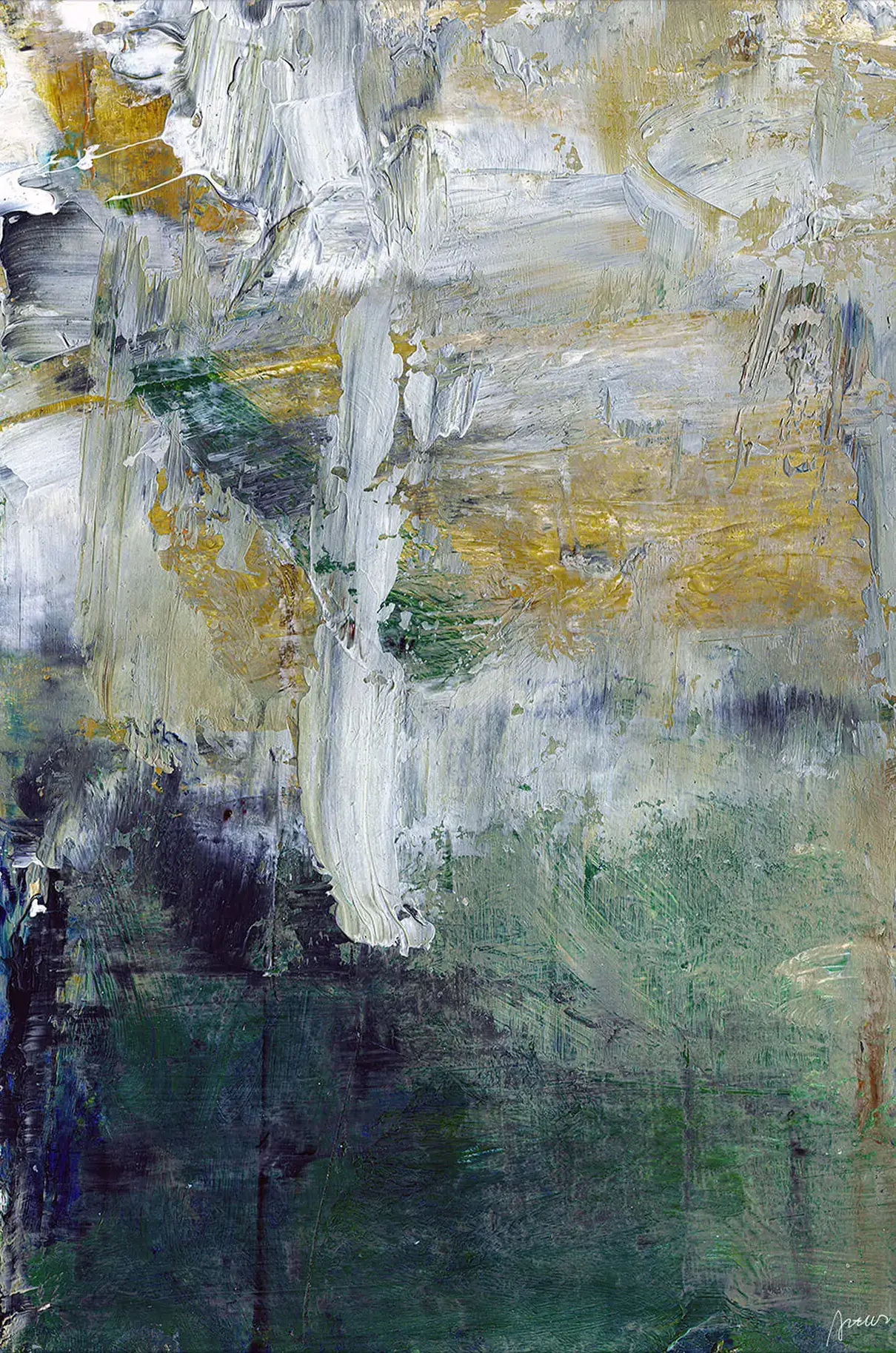 Cool greens, deep blue, and soft whites blend together in this textured abstract painting. Layers of paint overlap and dissolve, creating a composition that feels natural and fluid. The brushwork is loose and expressive, revealing subtle shifts in tone and texture that give the piece its quiet rhythm.