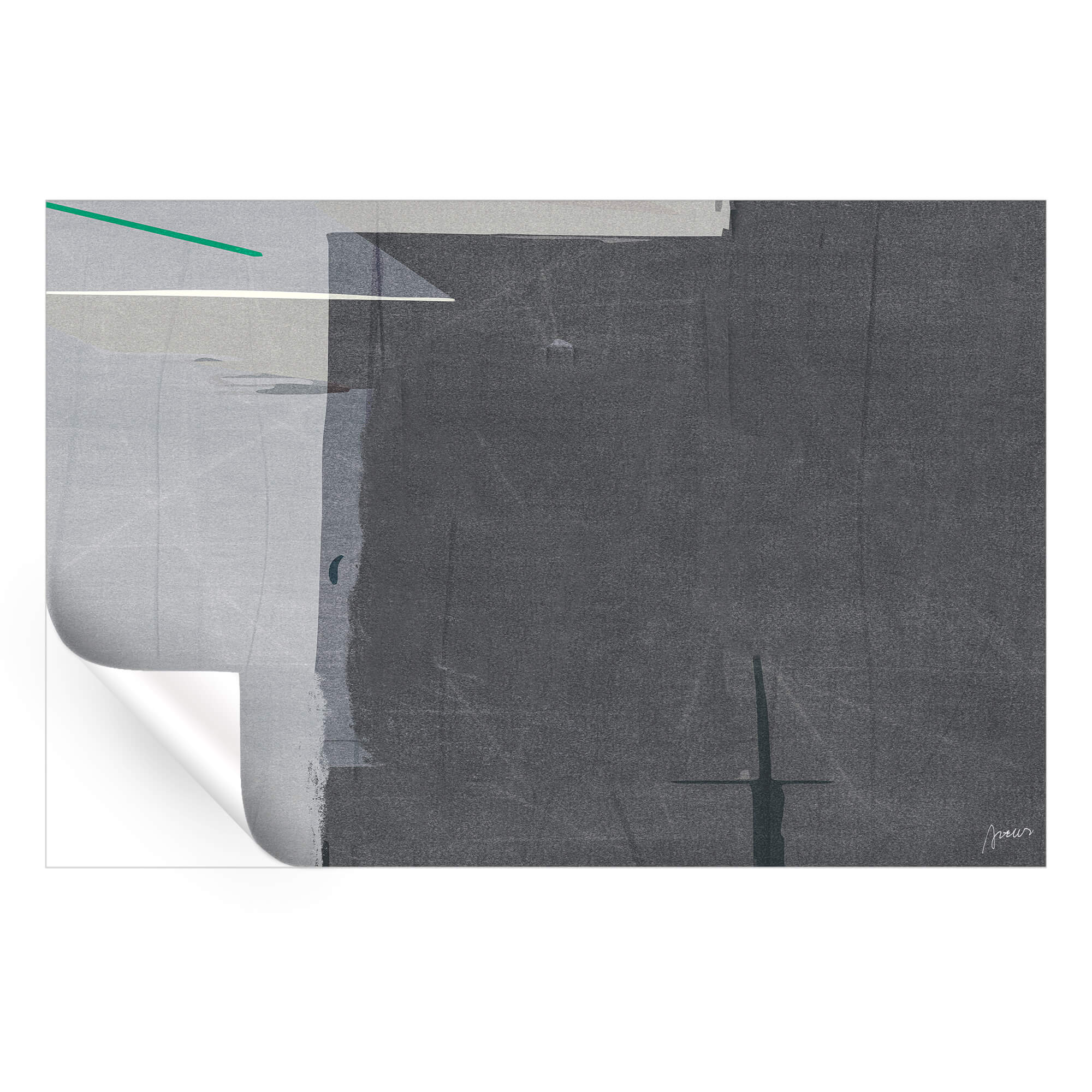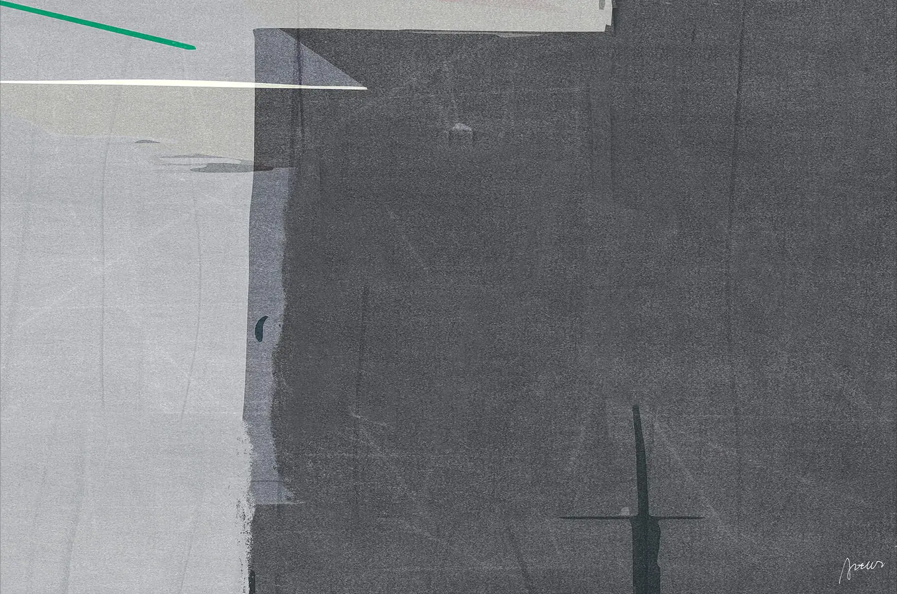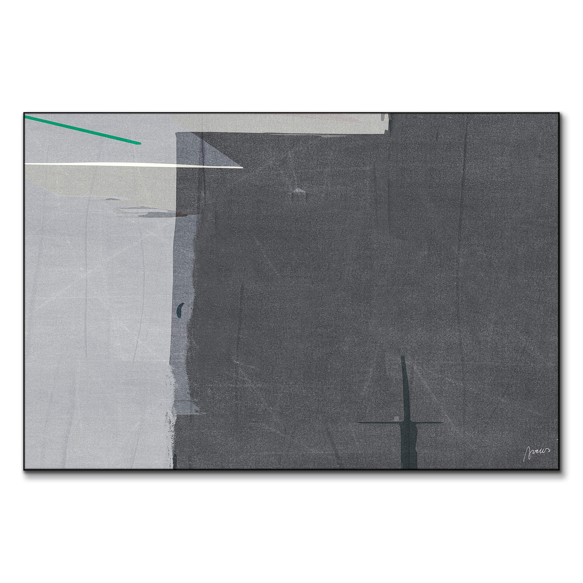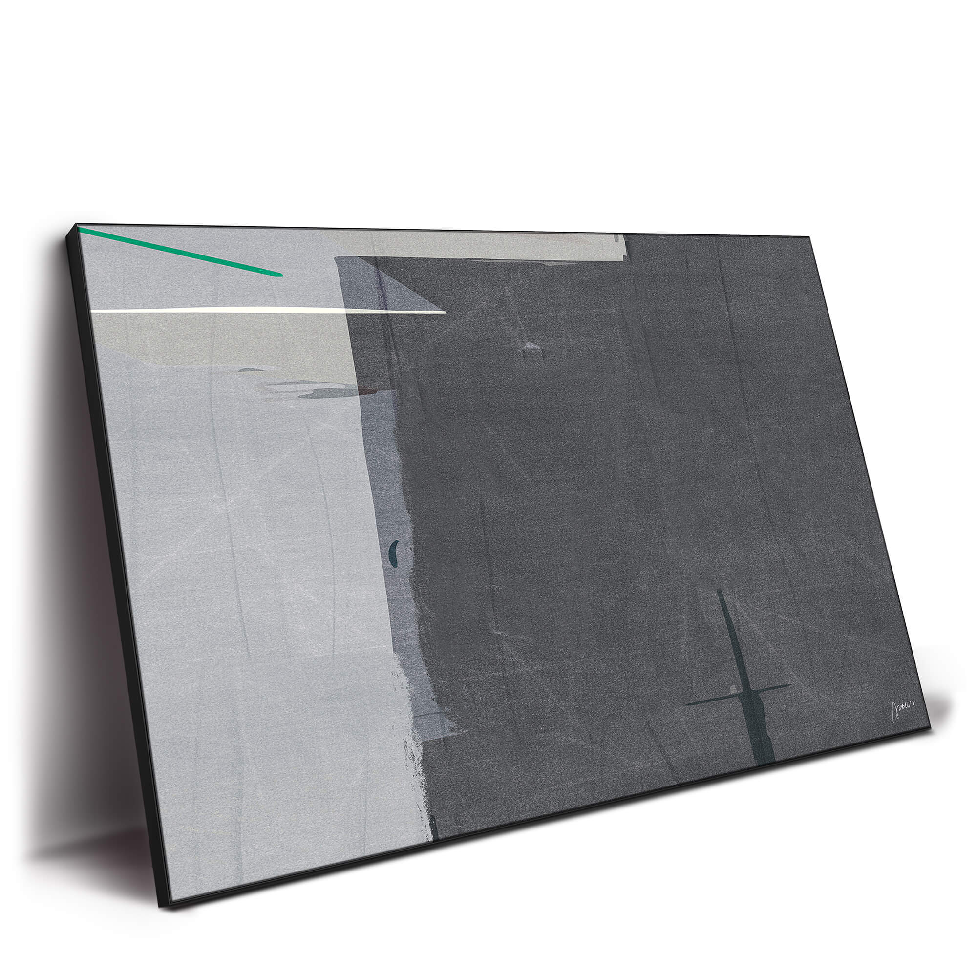 This piece distills modern abstraction into a study of texture and restraint. Subtle variations of gray and slate are layered with faint linear gestures and small hints of white and teal, creating quiet tension within the simplicity. The surface feels architectural—structured yet fluid, calm but full of depth.