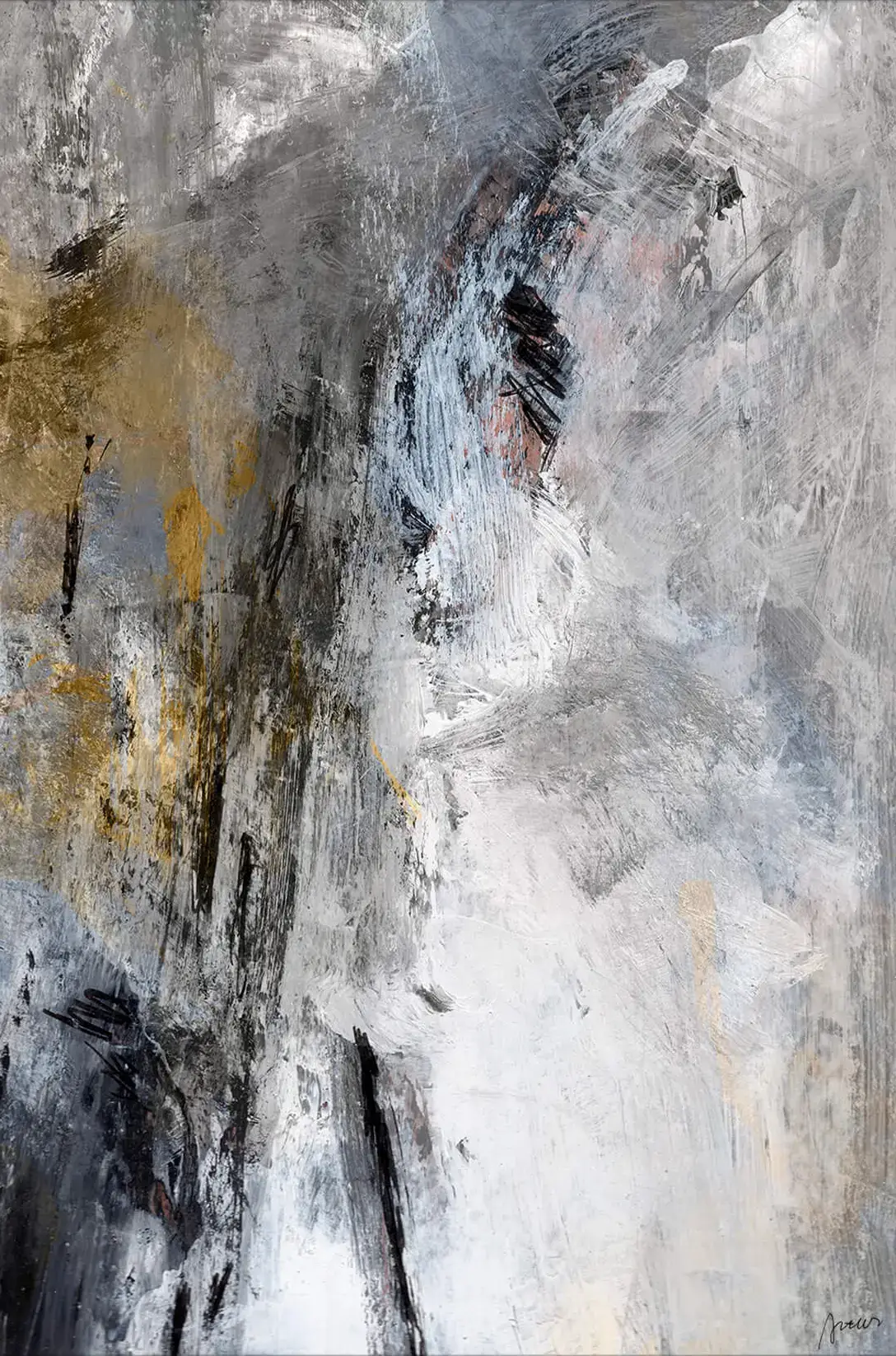 Chaotic brushstrokes of grey, white, and black whirl across the surface, punctuated by bold dashes of gold that catch the eye, like flecks of sunlight peeking through a stormy sky. The strokes are both frenzied and deliberate, a storm captured in time, conveying a sense of raw energy contained within the boundaries of the frame.