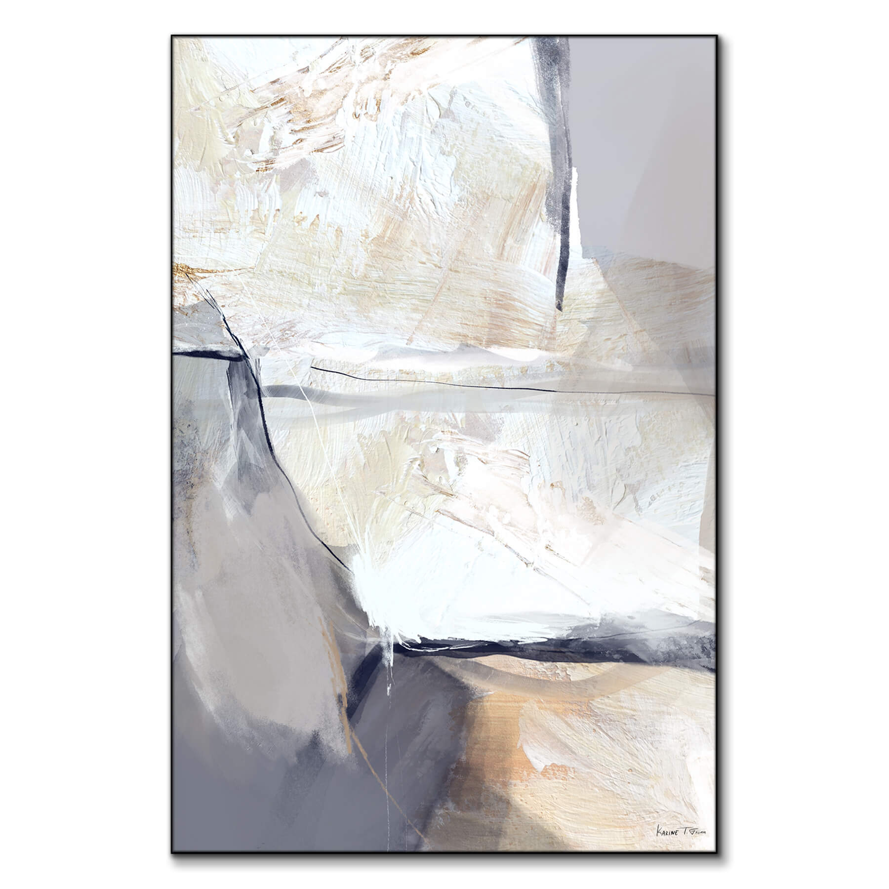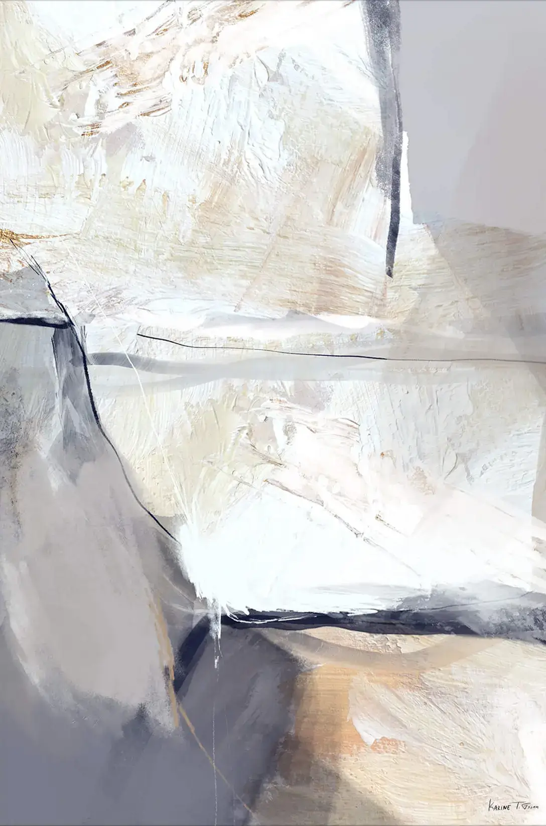 Textured strokes of white and warm tan sweep across, interrupted by a stark diagonal line that slashes through like a cliff edge. Shadowy purplish greys merge in the charcoaled depth, with specks of warm gold that flicker like distant lights. The visual tension between the vast lightness and the anchoring dark creates a sense of natural drama.