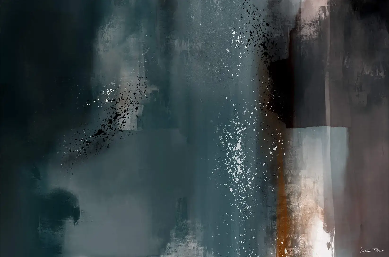 Shades of darkness merge with streaks of light, painting a composition rich in depth and enigma. Deep blues and obsidian are illuminated by starlike flecks of white. Warmth seeps through in the strokes of brown and gray, reminiscent of time-worn structures.