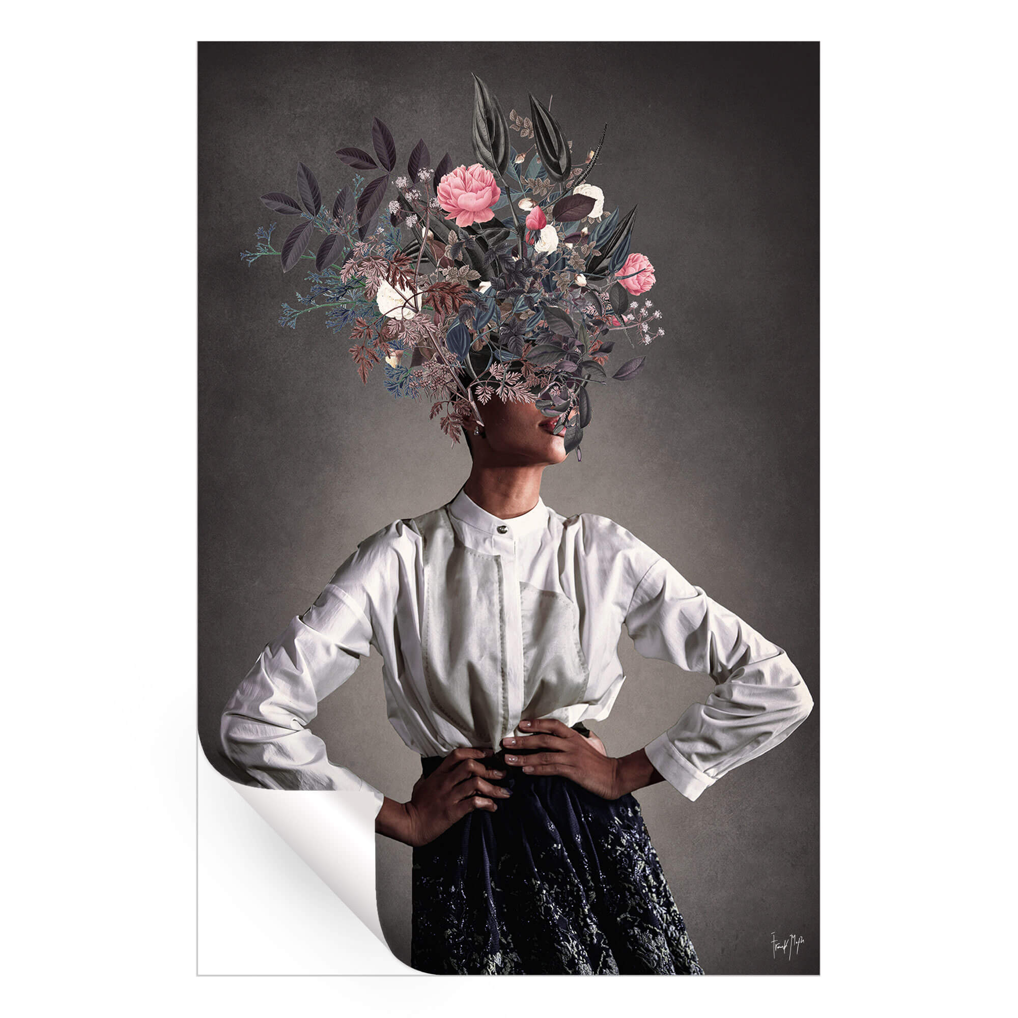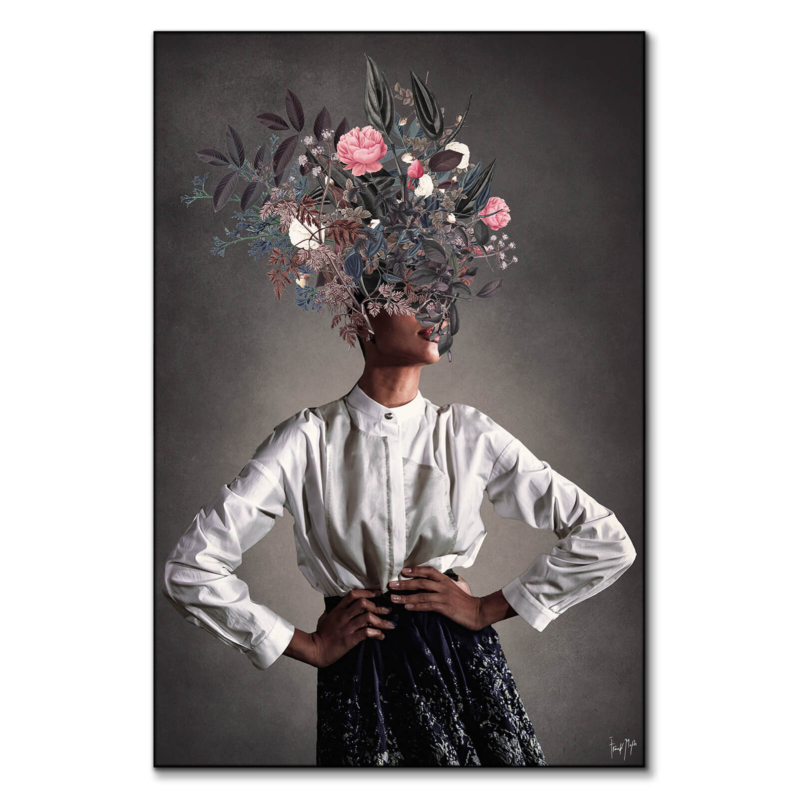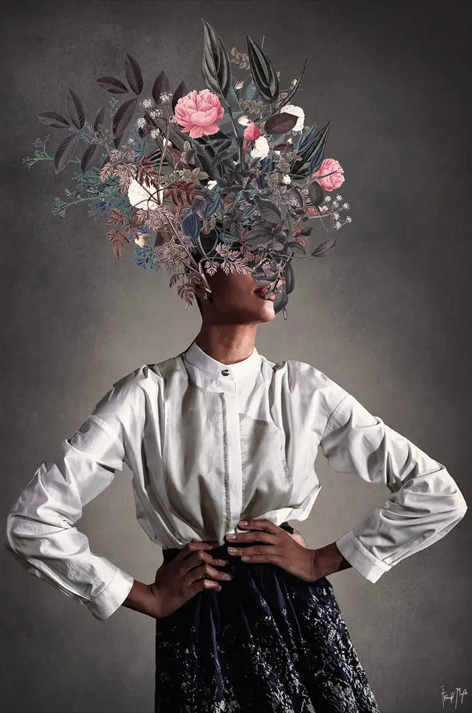 A person stands confidently, head tilted, with an explosion of flowers and foliage blooming from their face. The fashionable white shirt contrasts with the dark, textured background and the deep hues of the botanical arrangement, accentuating the vivid display.