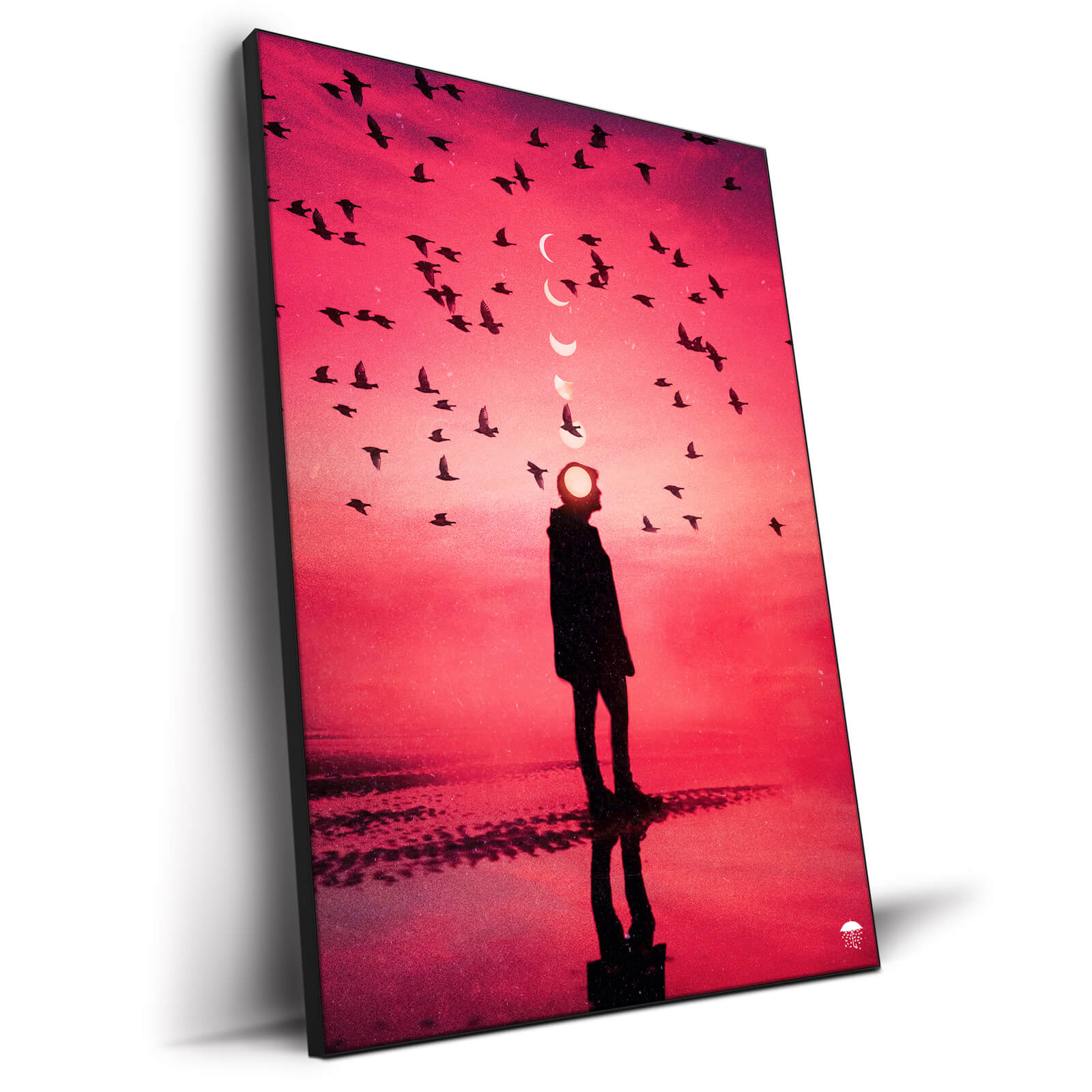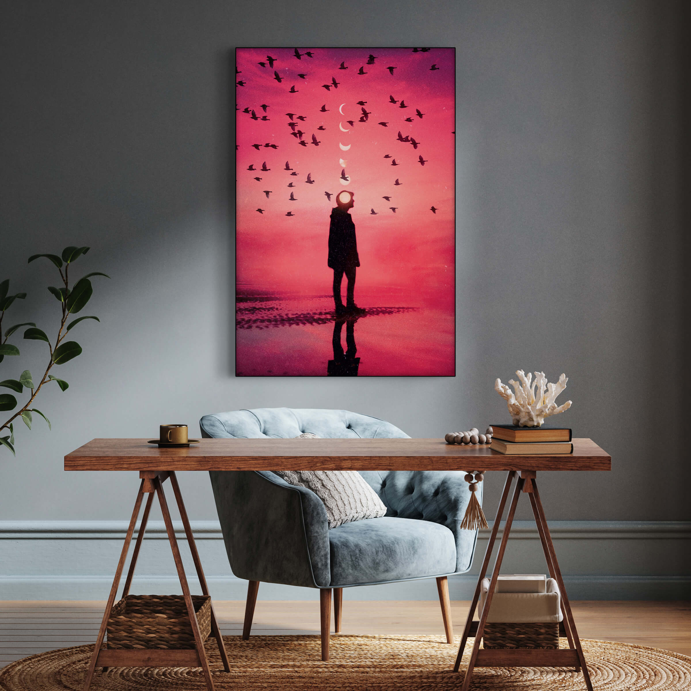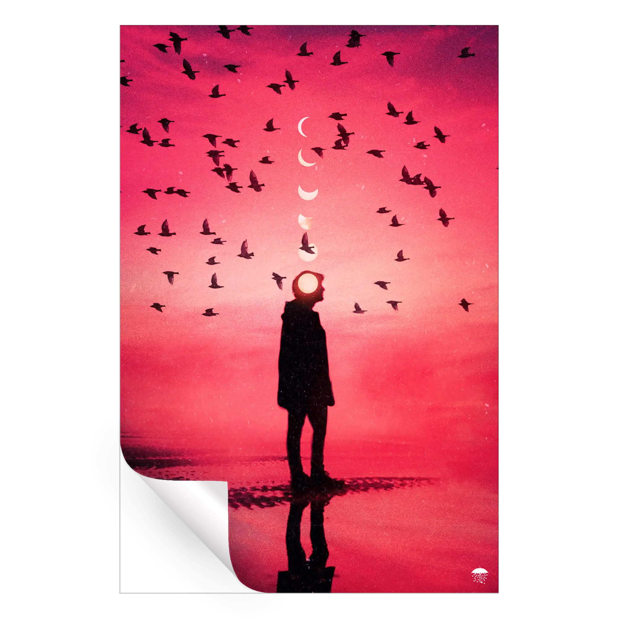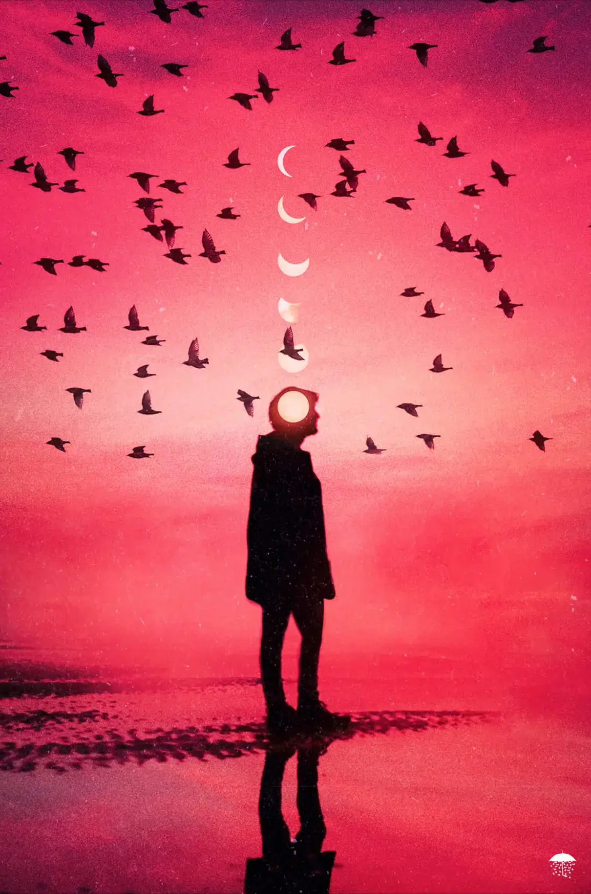 A silhouette of a person stands against a pink-hued sky reflected in still water below. Above, birds take flight in a scattered pattern, and the phases of the moon vertically align, glowing softly.