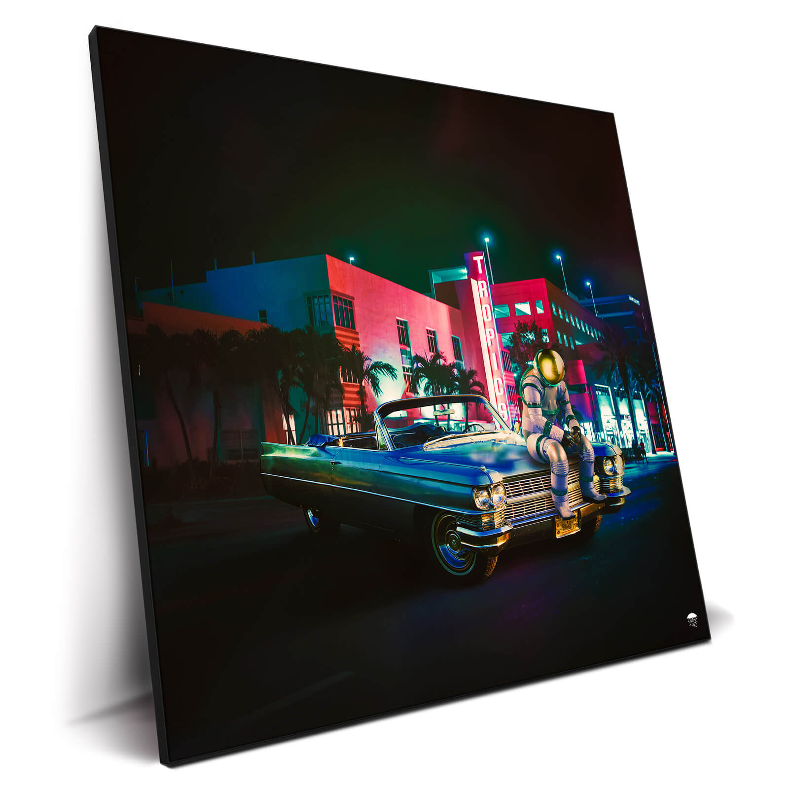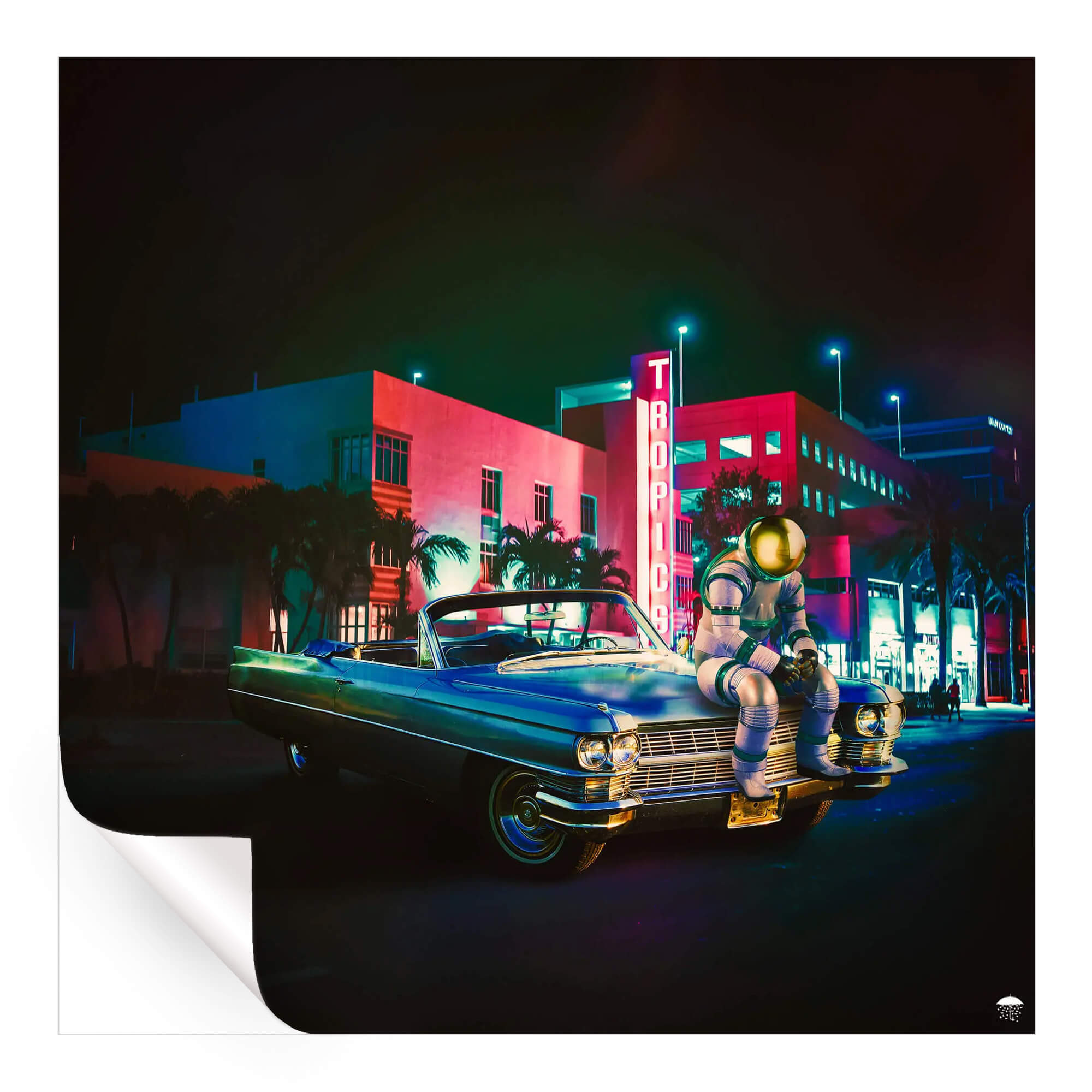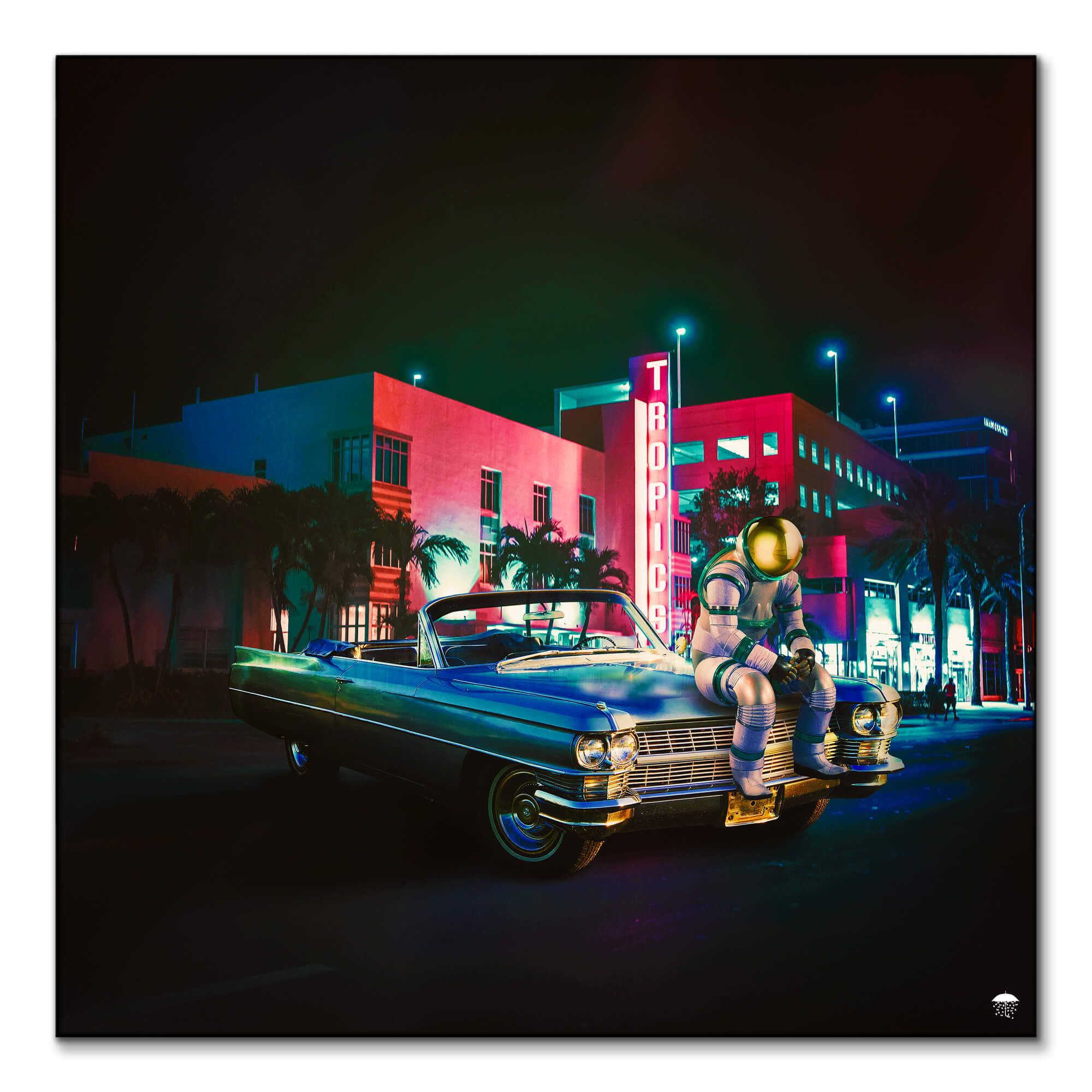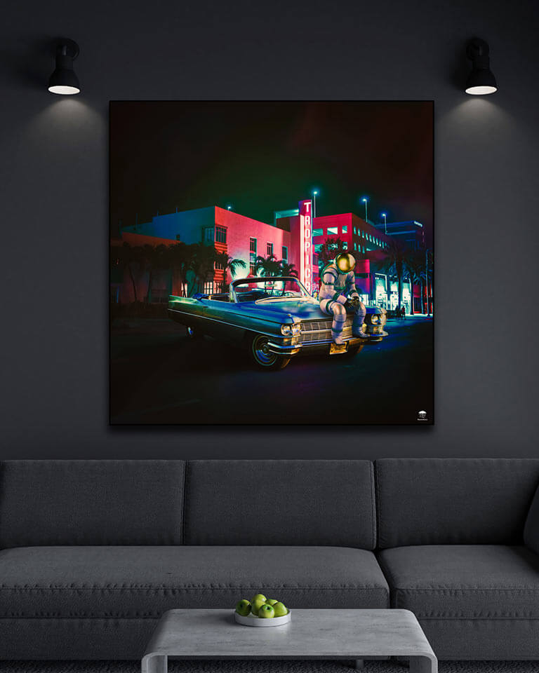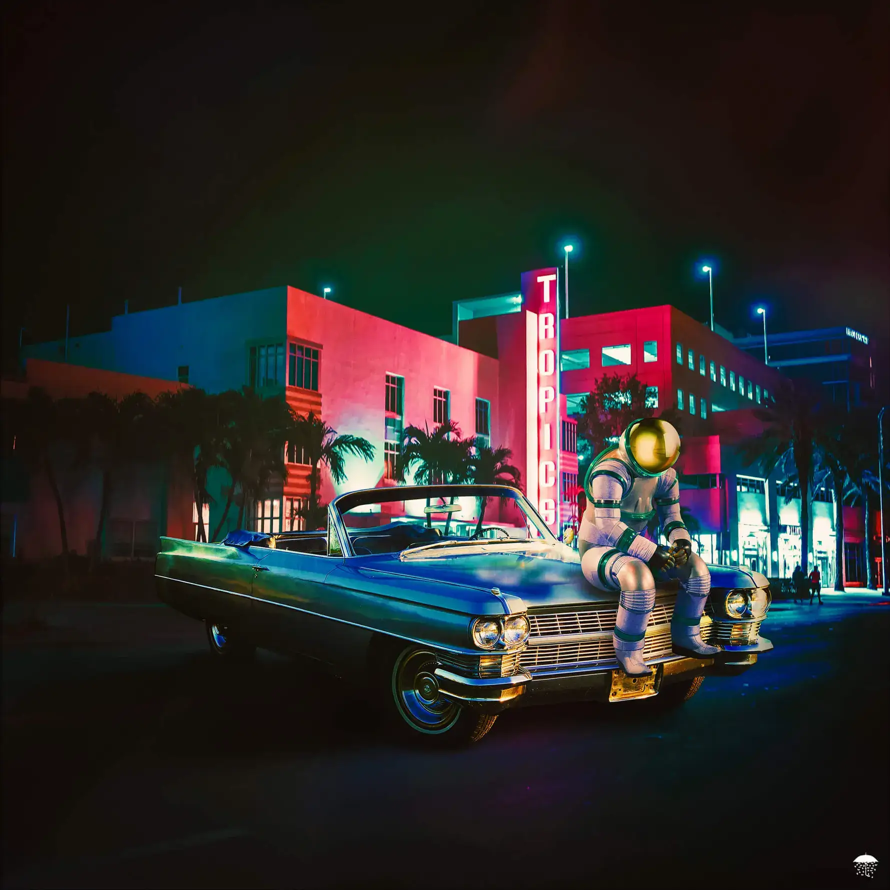 Palm trees line the backdrop where neon signs blaze, with “TROPICS” illuminating the vicinity in vibrant red, evoking a warm, nostalgic atmosphere reminiscent of Miami’s Art Deco district. The juxtaposition of a classic car and an astronaut encapsulates a fusion of retro charm and futuristic exploration.