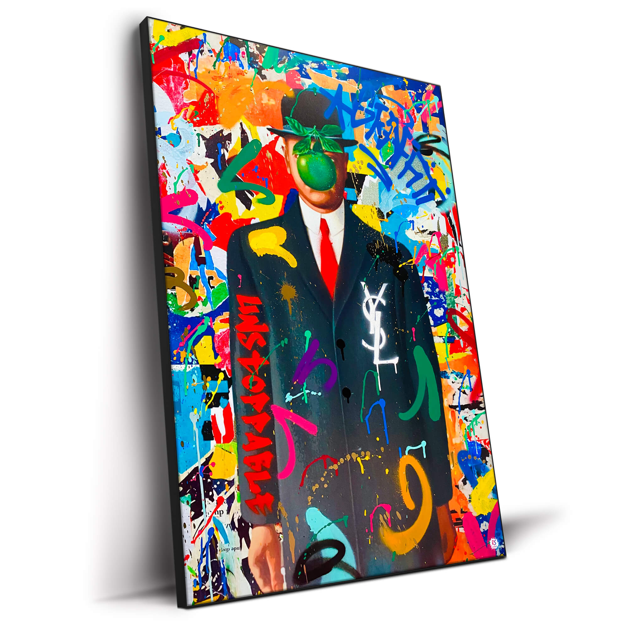René Magritte’s ‘The Son of Man’ is reimagined in an explosion of graffiti vigor, marrying the mystery of the obscured face with the untamed spirit of street art. The iconic apple and bowler hat meet a backdrop of wild color splashes and tags, creating a provocative blend of classical surrealism and contemporary edge, perfect for the modern art enthusiast’s collection.