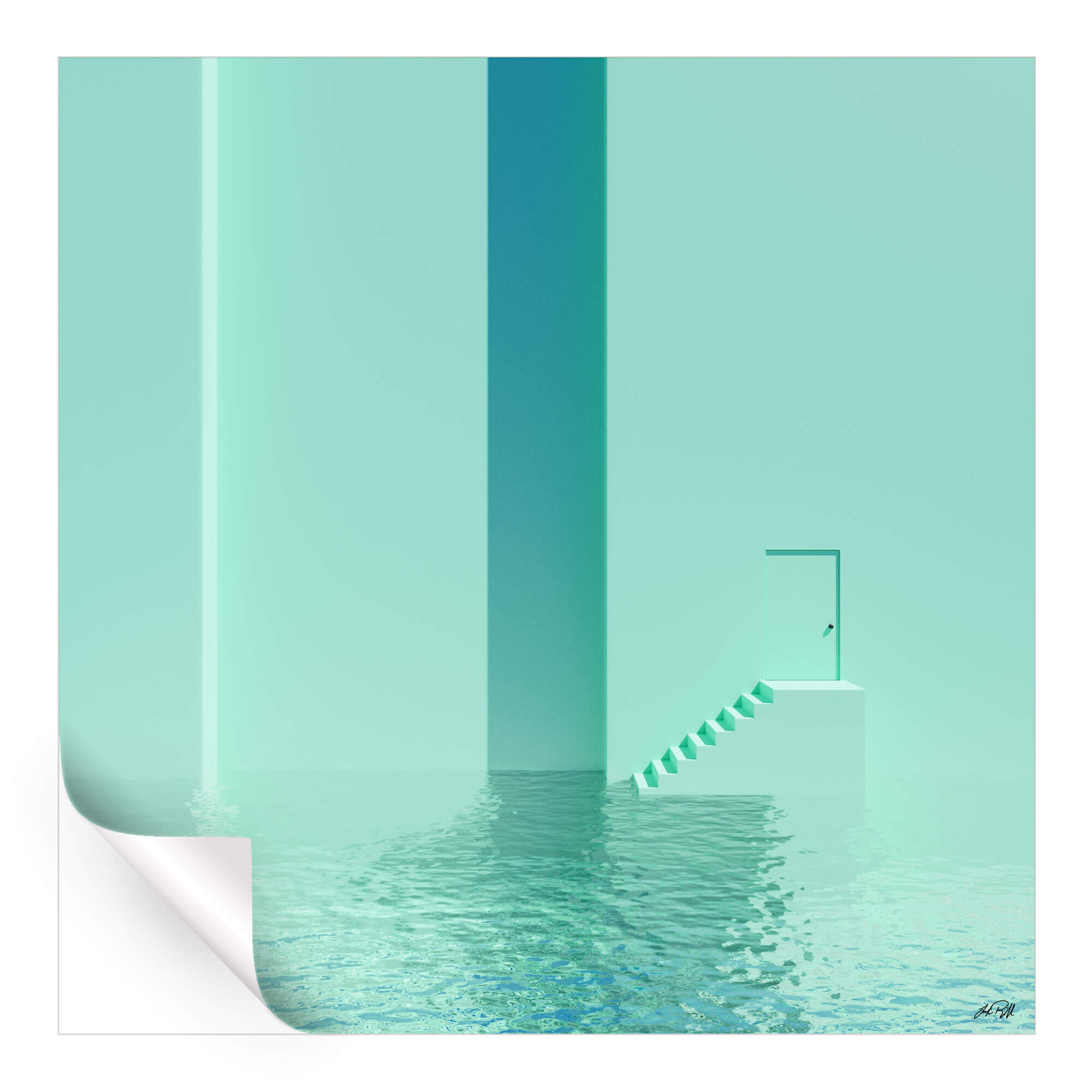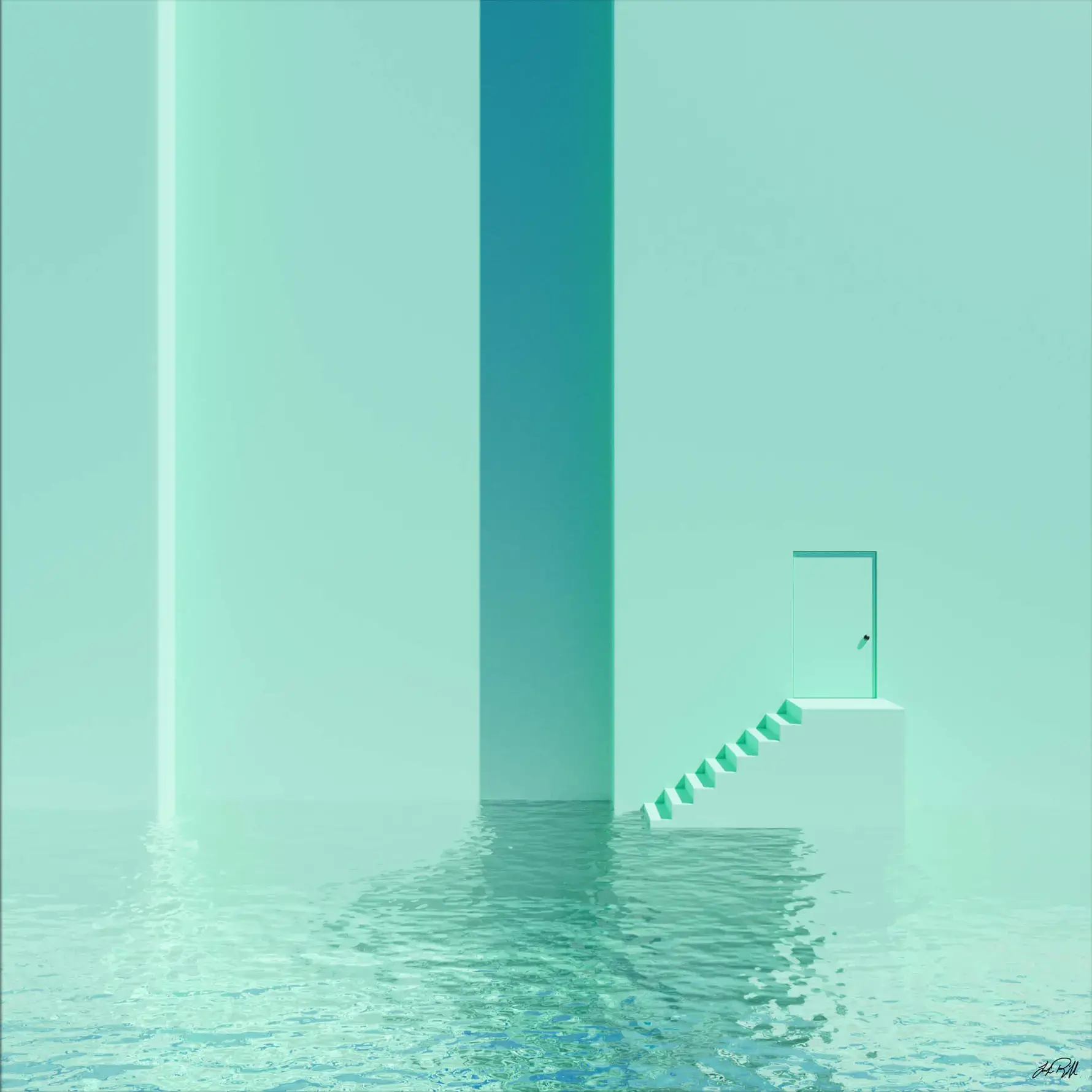 A serene water surface reflects two vertical structures, one a sheer, translucent column and the other a solid blue. A small white platform with a spiral staircase leads to a minimalist door, suggesting an entrance to an unknown space, all set against a gradient of soft aqua tones.