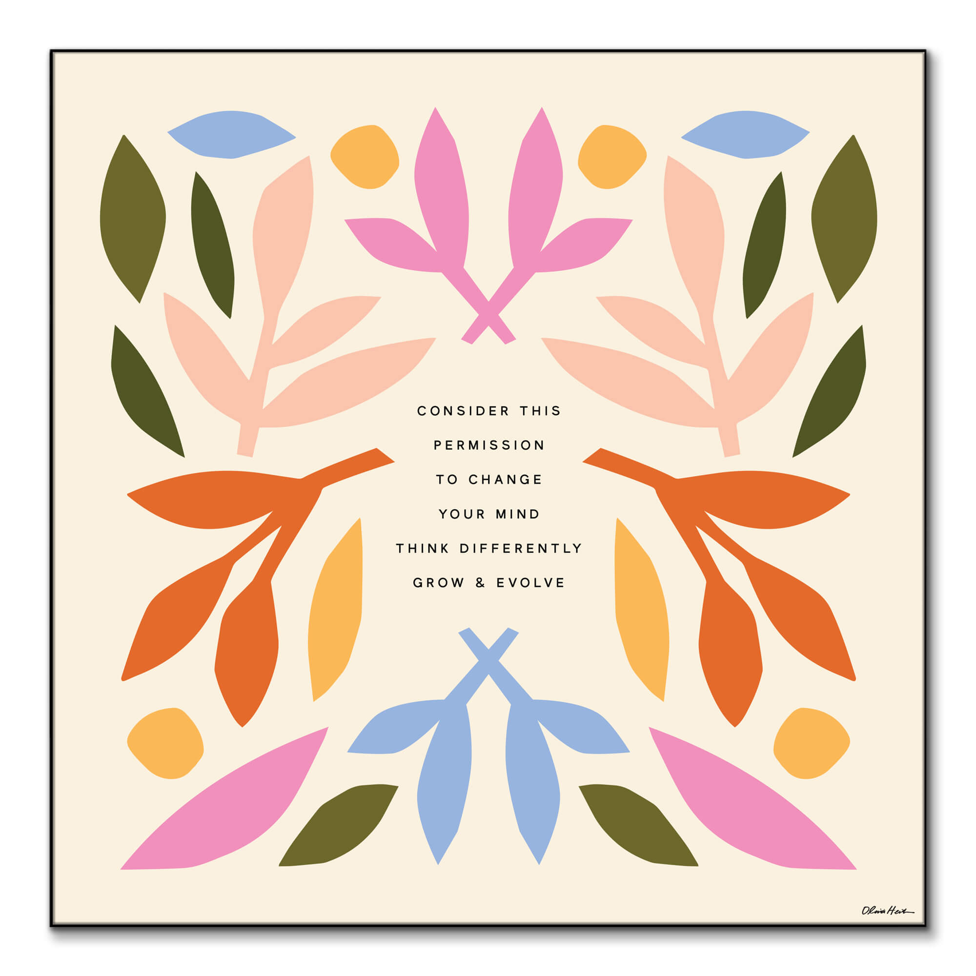 Symmetrical leaf patterns in a medley of pastel and earth tones create a harmonious backdrop for the empowering message at the heart of this artwork. The organic shapes and gentle colors of the leaves complement the theme of natural progression and transformation.