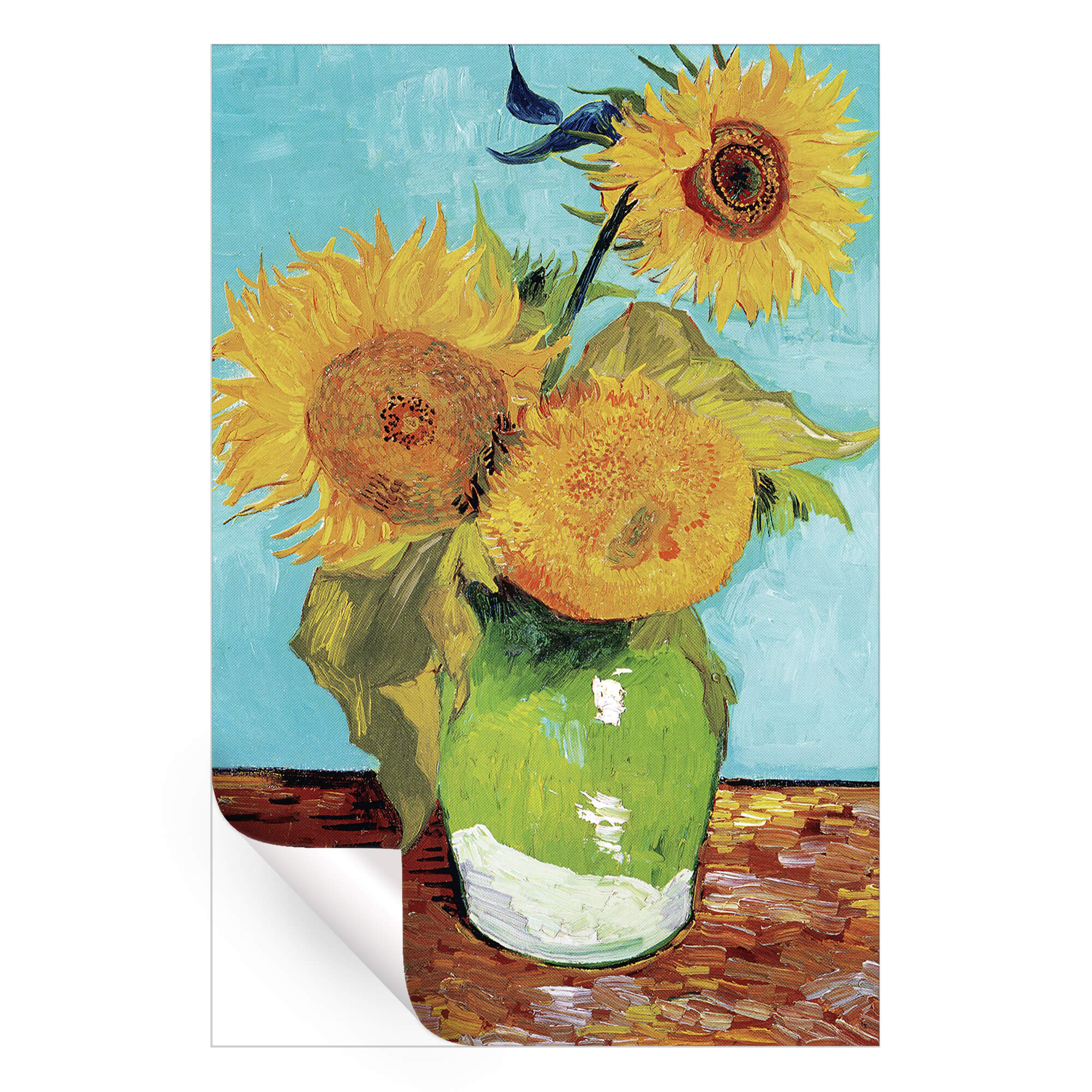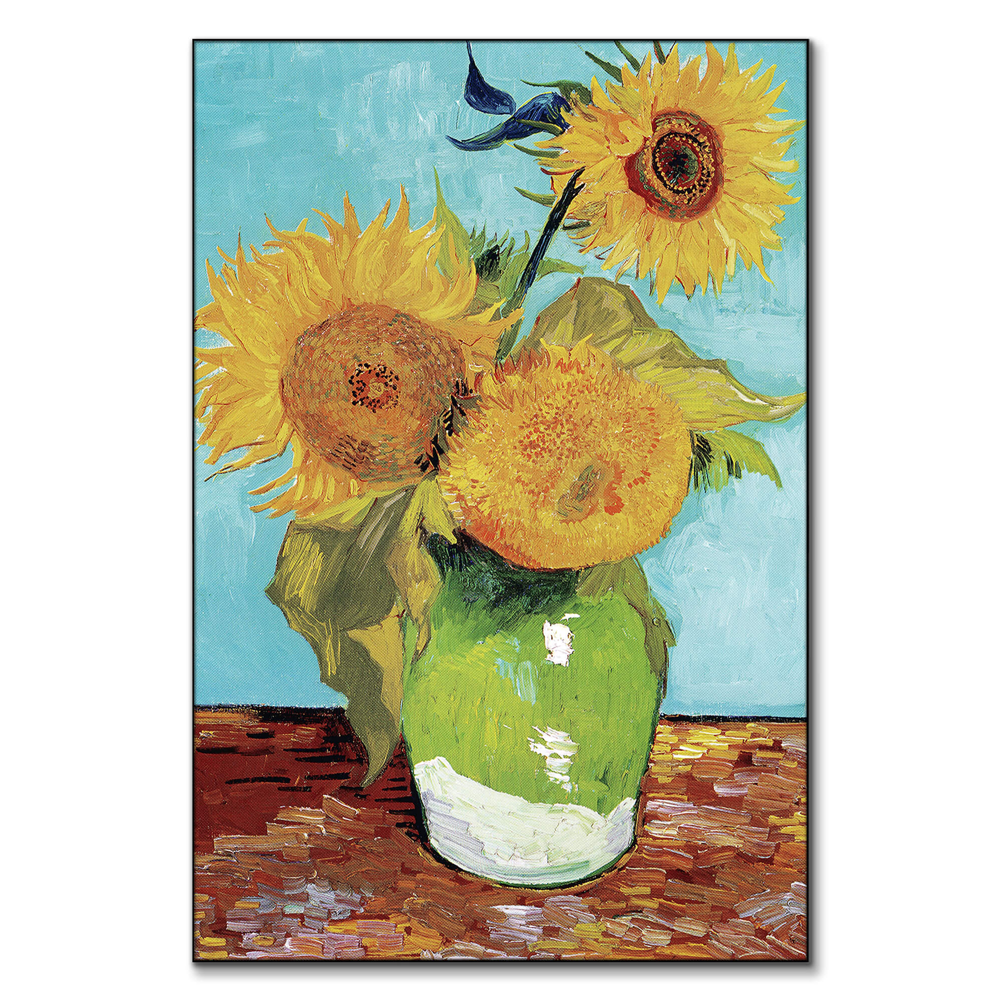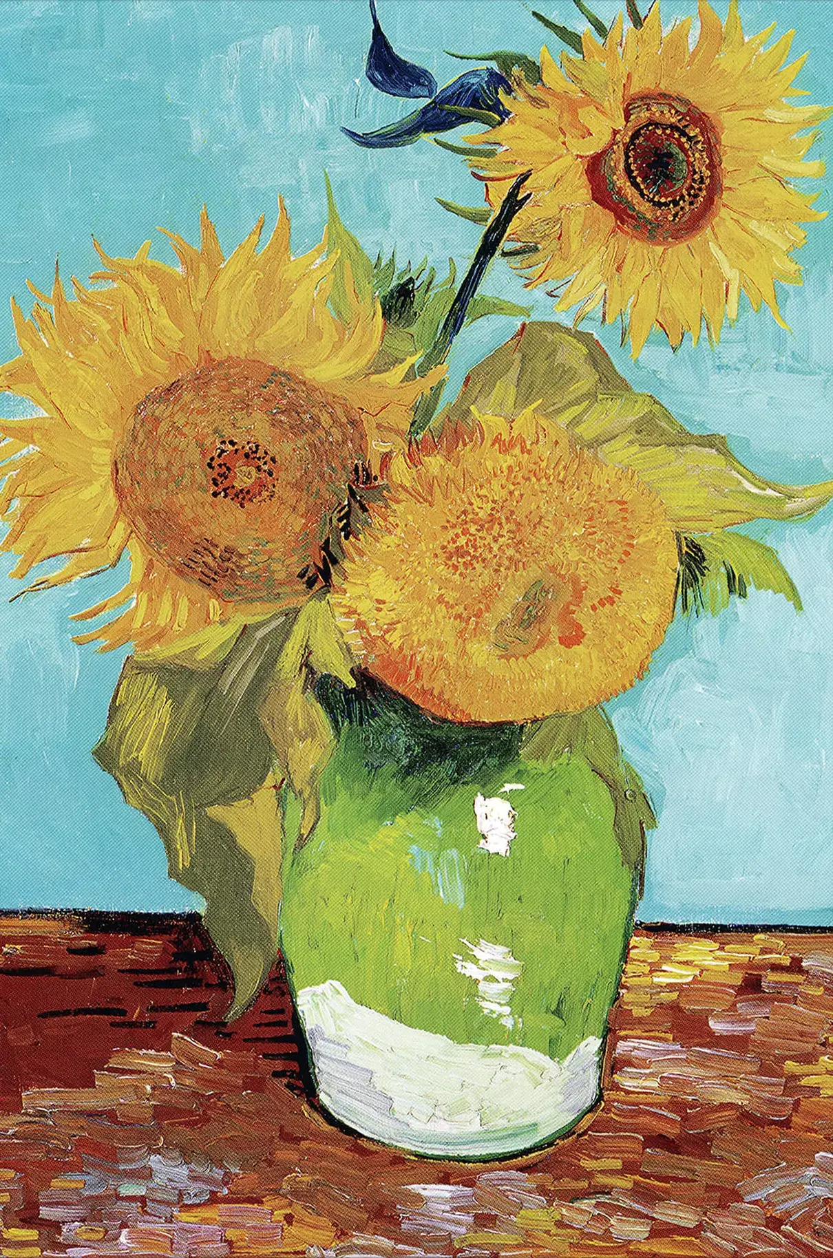 Bright sunflowers, big personality. This iconic piece shows three heavy blooms leaning out of a glossy green vase, petals wild and full of life. The yellows are rich and warm, moving from soft gold to deeper amber tones. You can see every textured brushstroke, like the paint is still wet and glowing in the light. Leaves spill over the rim, loose and relaxed, giving it that effortless, real-life charm.