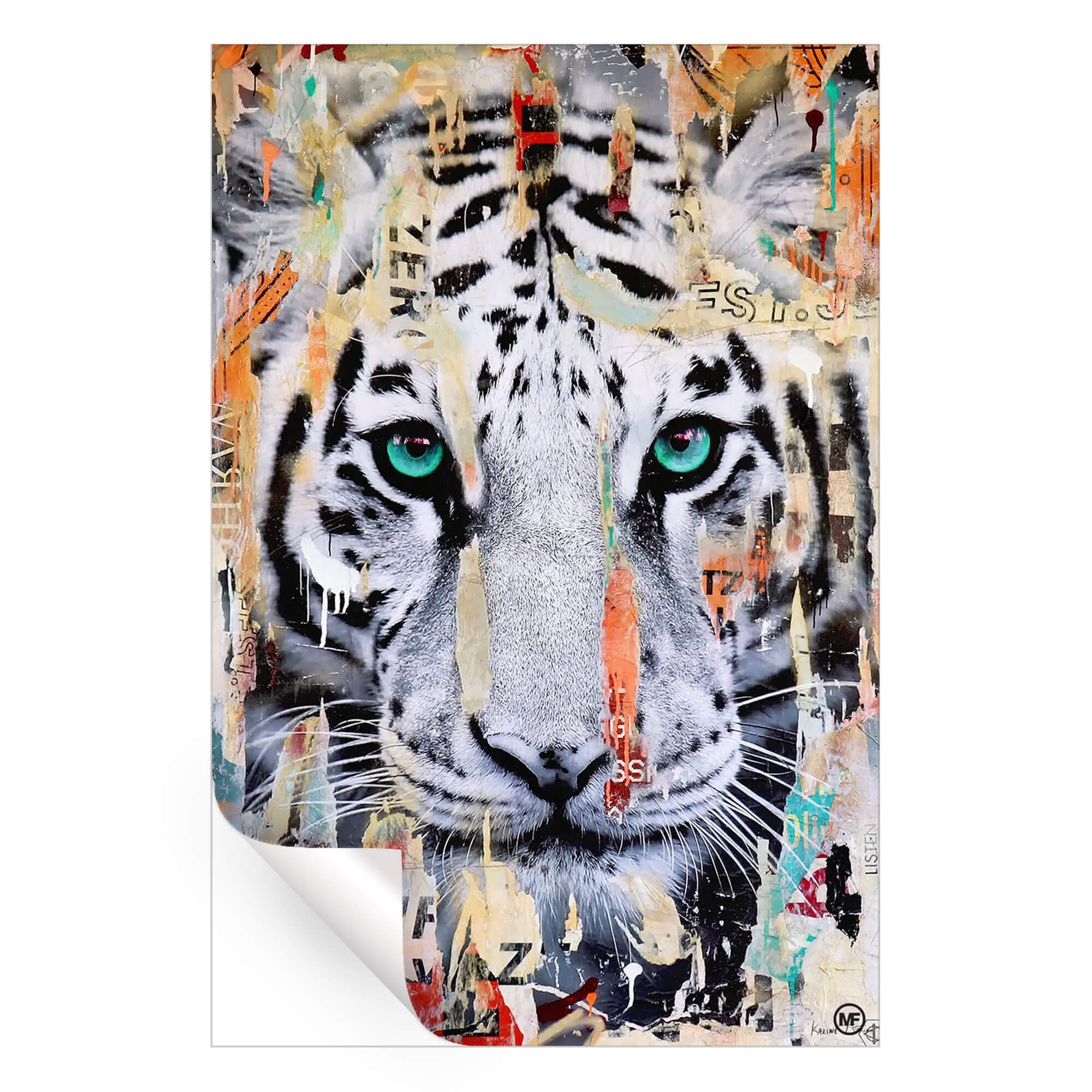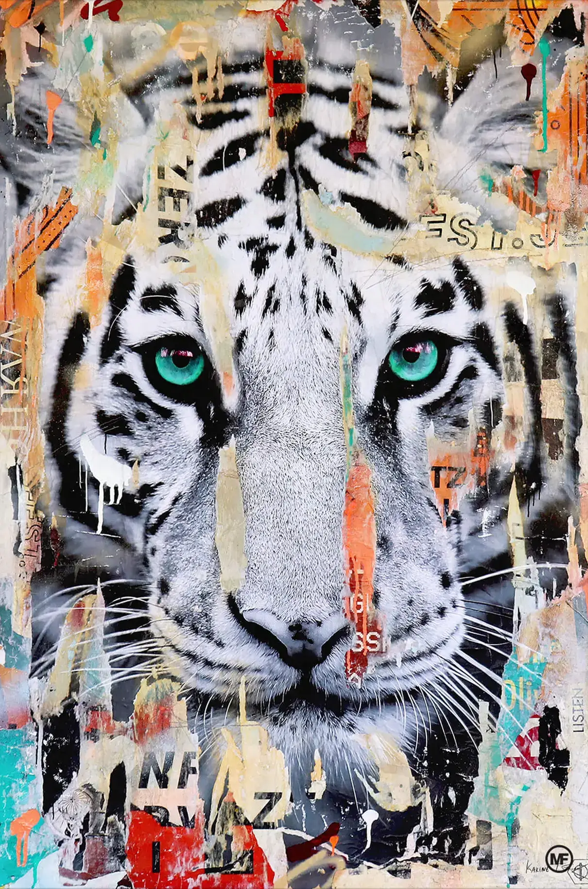 Each stroke and splash of color celebrates the tiger’s powerful essence, set against a backdrop of urban artistry. Layers of text, graffiti, and vibrant hues highlight the animal’s raw power, while drips of paint across its face add to the artwork’s dynamic energy.