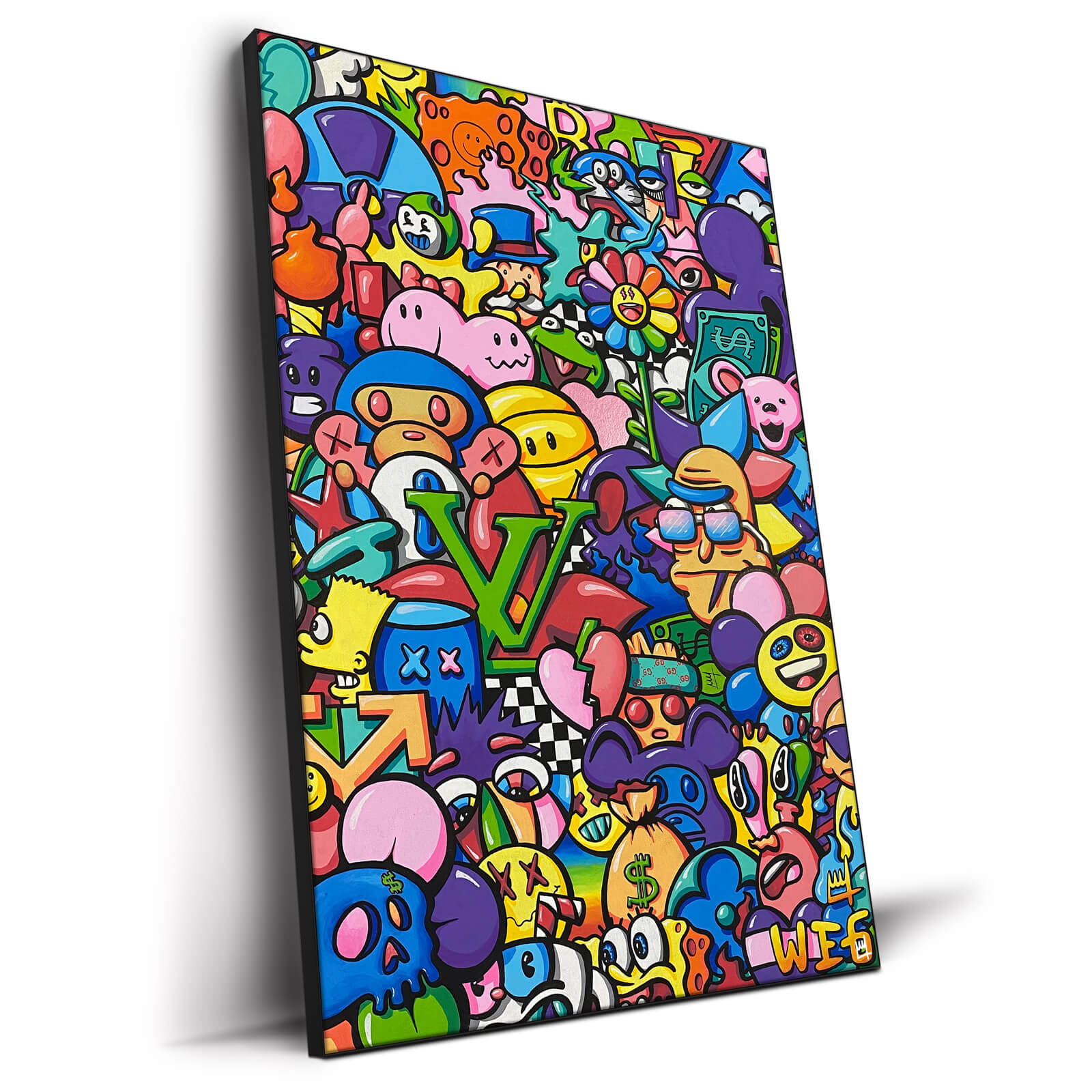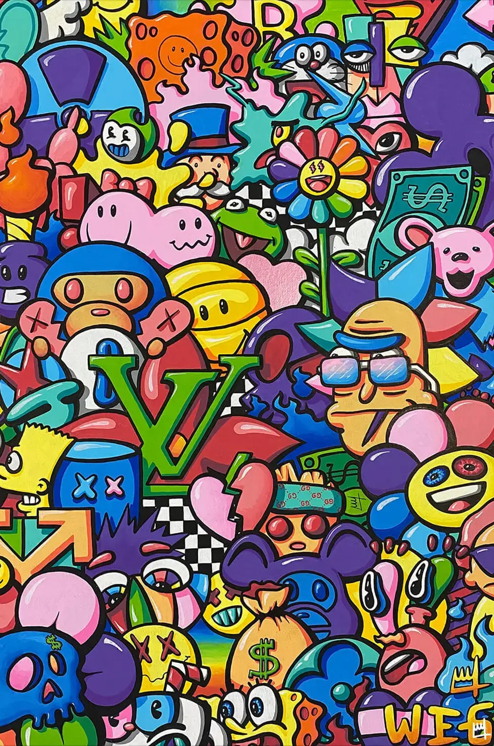 An eclectic mix of pop culture symbols, characters, and abstract elements creates a dense, eye-catching mosaic. From smiley faces to iconic brand logos, each element contributes to the chaotic harmony of the piece. Bright colors and varied patterns give the impression of a playful, visual symphony. The composition is a lively blend of nostalgia and whimsy, with every inch offering a new detail to discover.