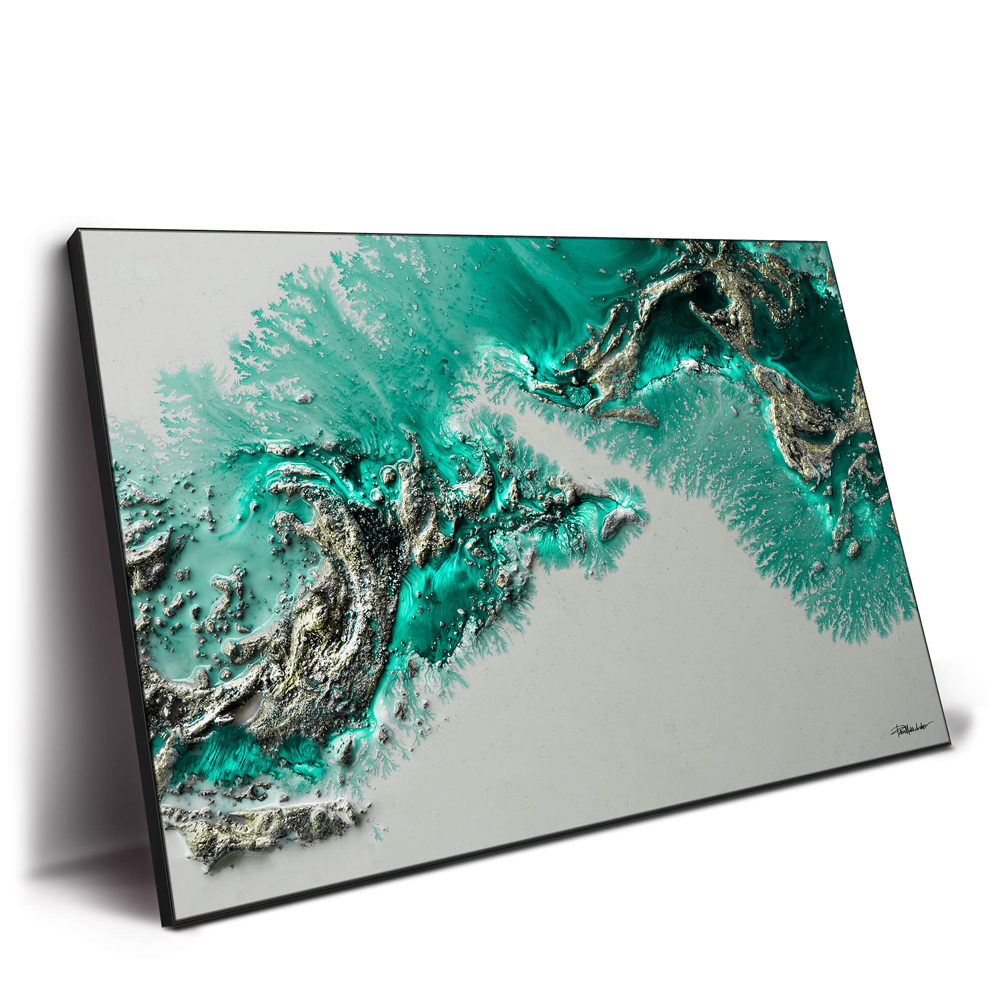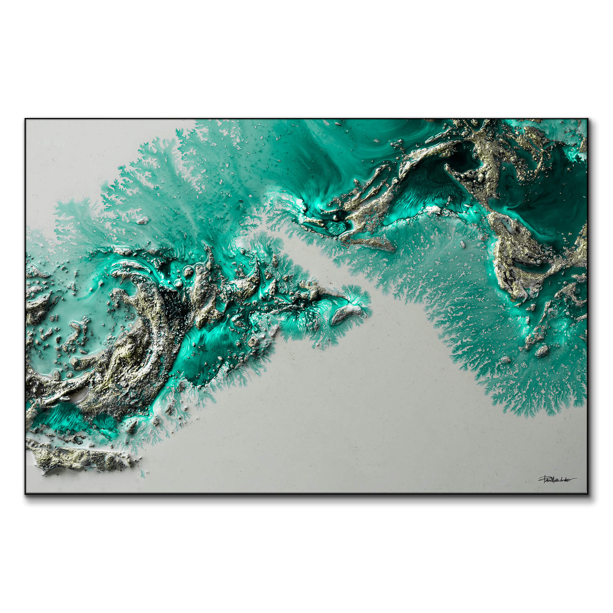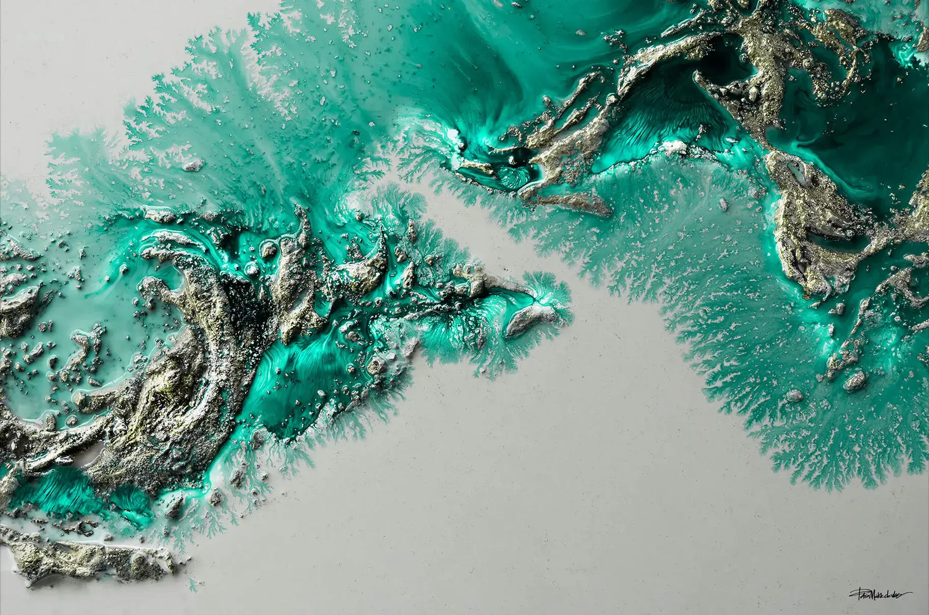 A dynamic abstract ocean artwork that combines shades of deep teal and turquoise to create the impression of topographic ocean waves. With fine details and layers of flowing textures, the piece captures both the movement and calm of the sea. The mix of soft and bold brushstrokes symbolizes the natural ebb and flow of the ocean, with subtle golden accents highlighting the depth of the waves.