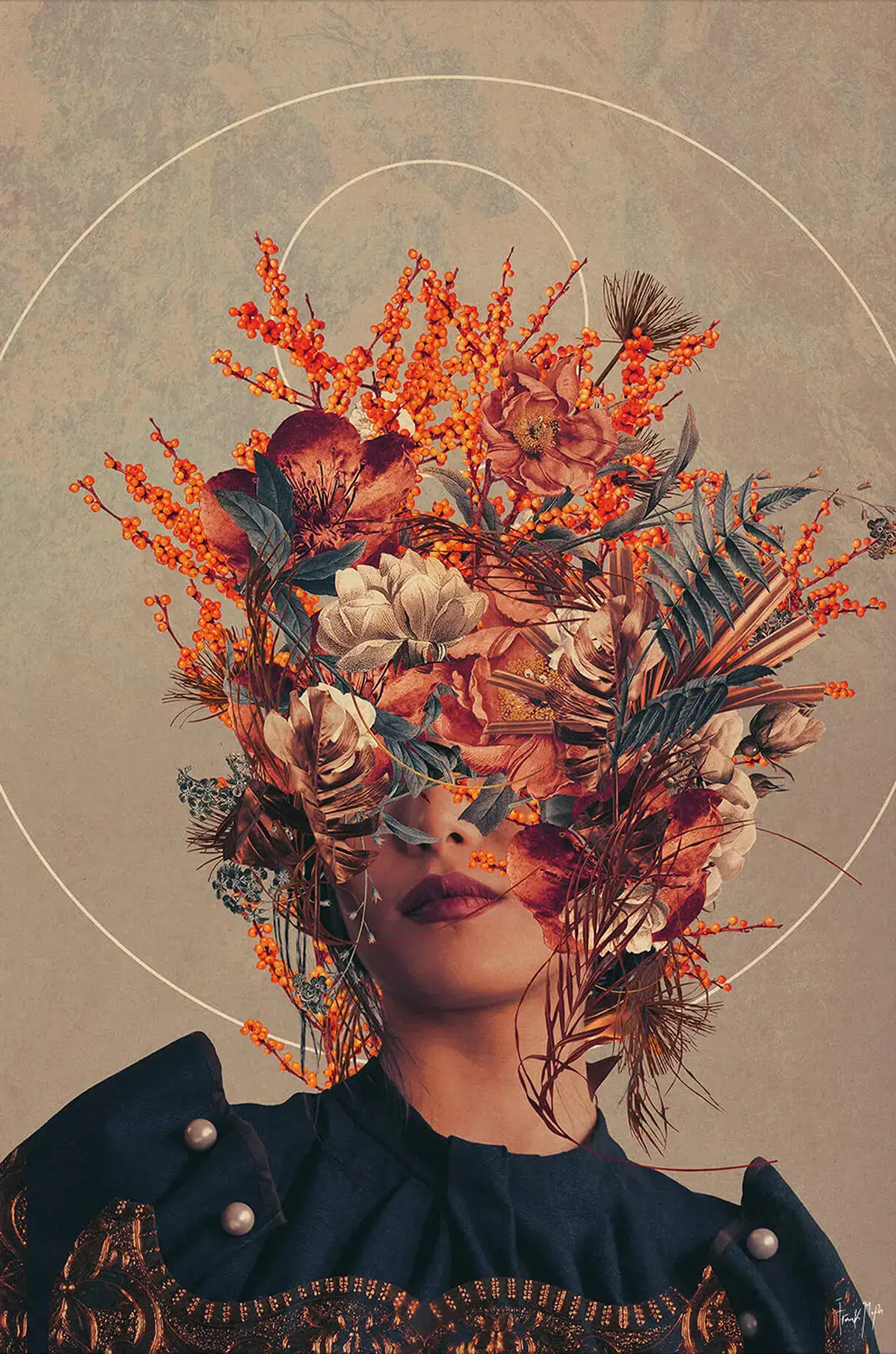 This surreal floral portrait brings a touch of mystery and elegance to contemporary art. A woman’s face is hidden behind an intricate bouquet of orange berries, pale blooms, and autumnal leaves that burst outward in every direction. Circular line patterns subtly frame the composition, giving it balance and a celestial sense of harmony.