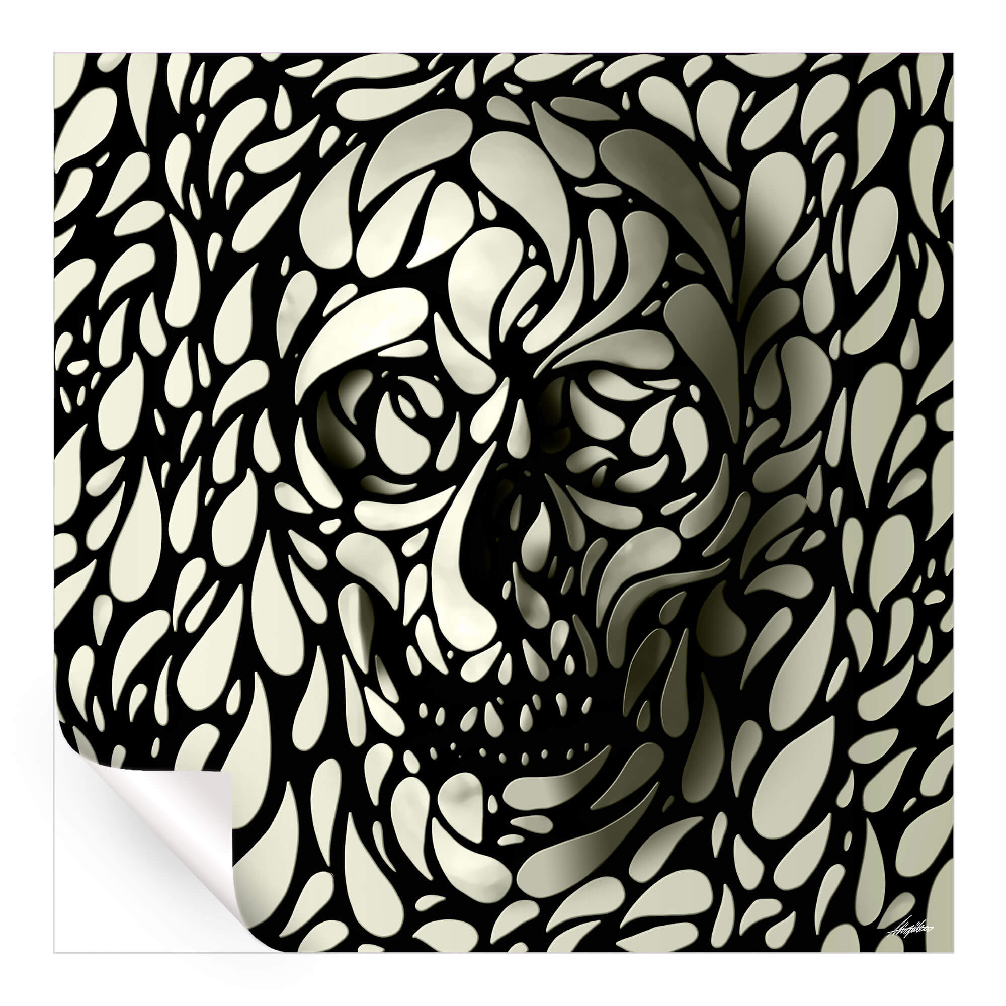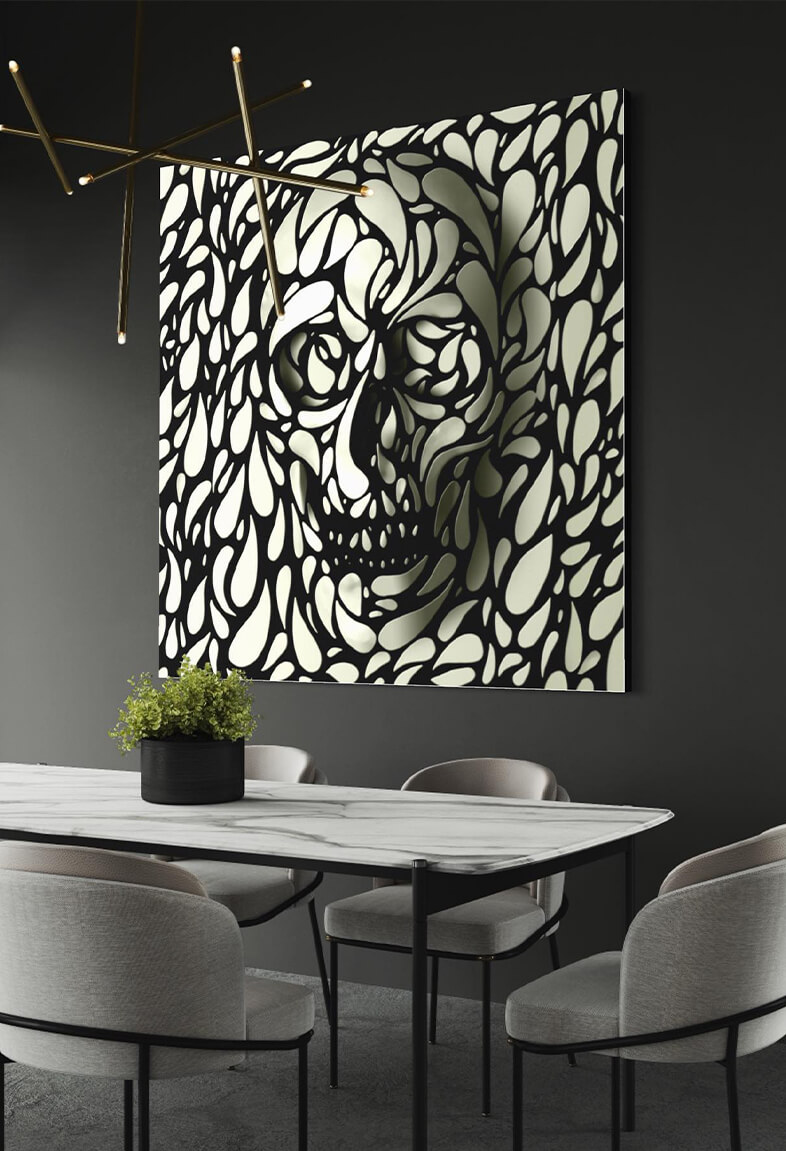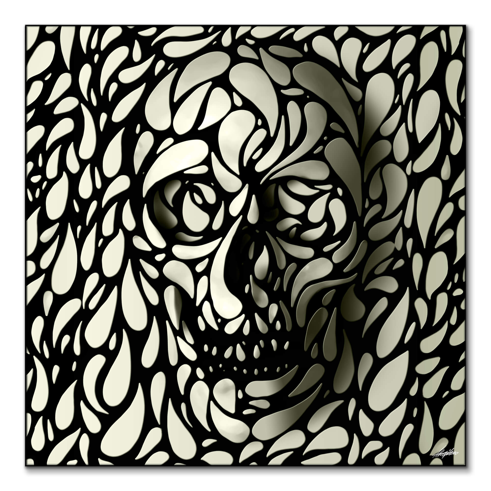 In a symphony of curves and contrasts, Ali Gulec shapes a hypnotic skull from a labyrinth of natural forms. Each droplet-like element melds to form a face that commands attention, showcasing the artist’s ability to turn something usually somber into a captivating allure.