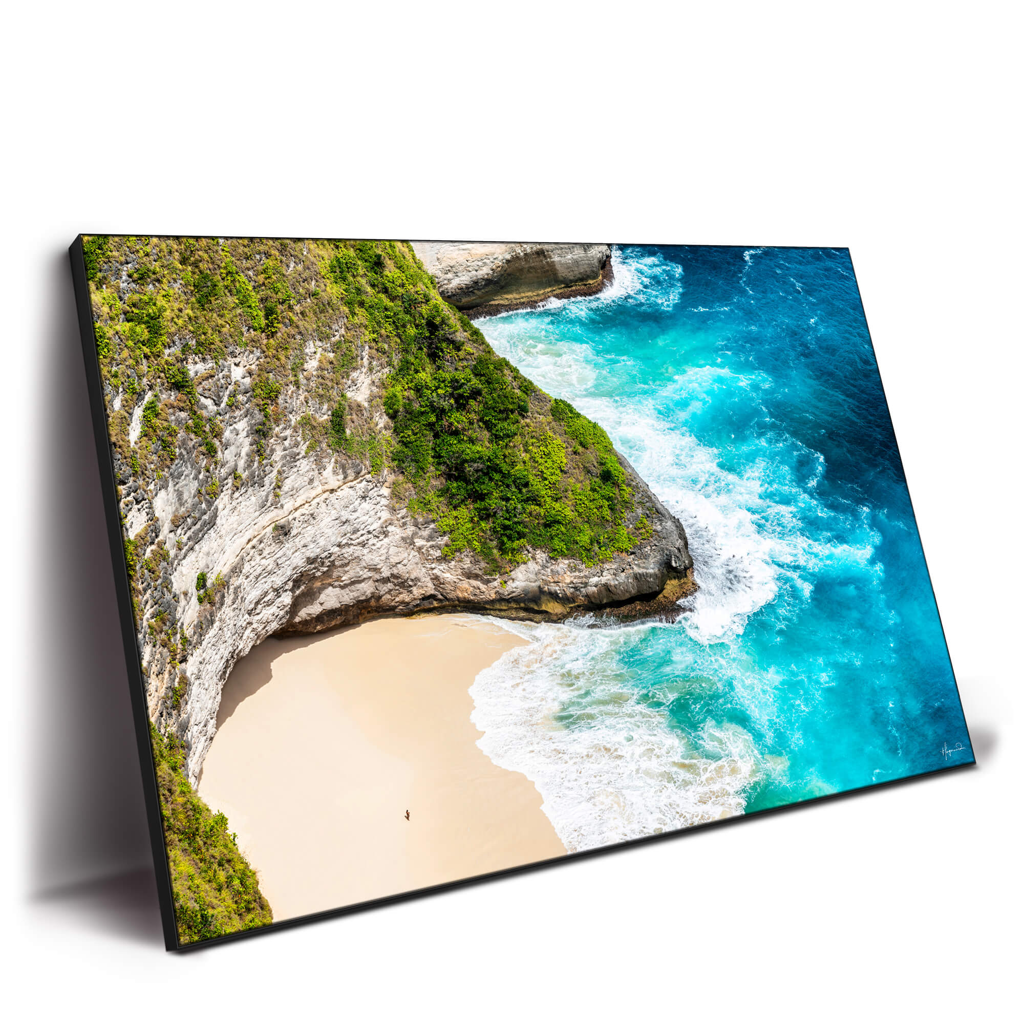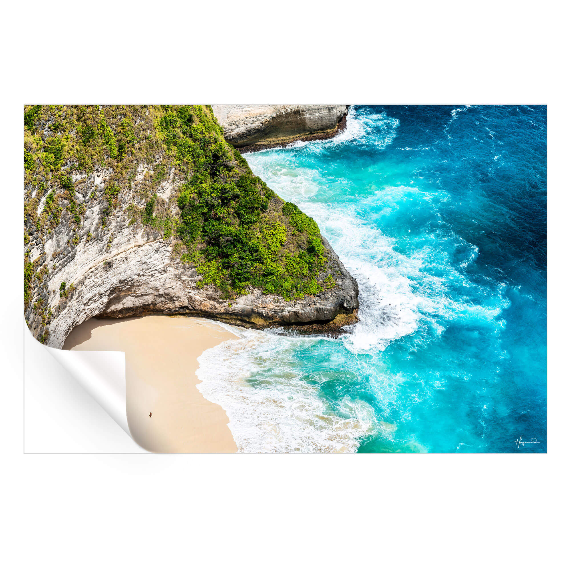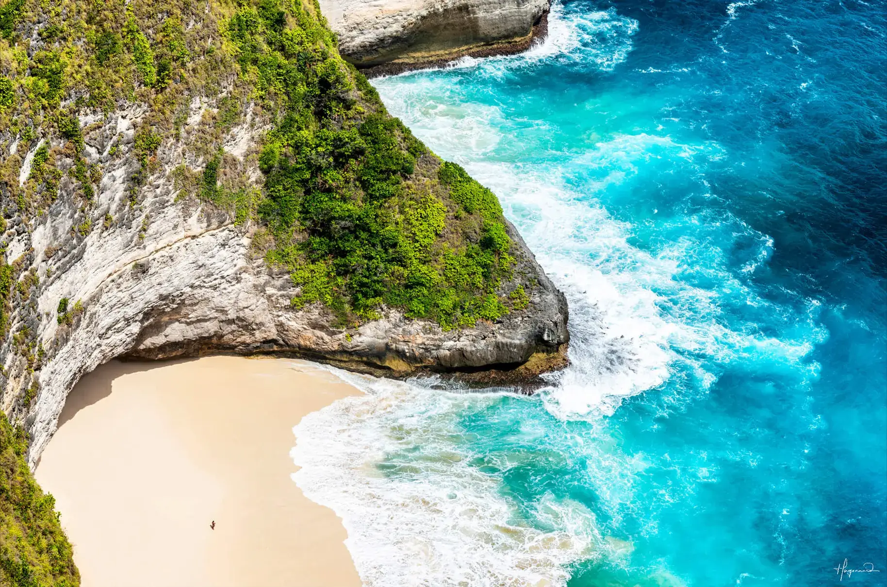 A breathtaking aerial view of a secluded tropical beach, flanked by towering green cliffs. The waves of the vivid turquoise ocean crash against the rugged coastline, carving out a serene cove of pristine white sand. It’s a picturesque scene of tranquility and natural beauty, seemingly untouched and remote.