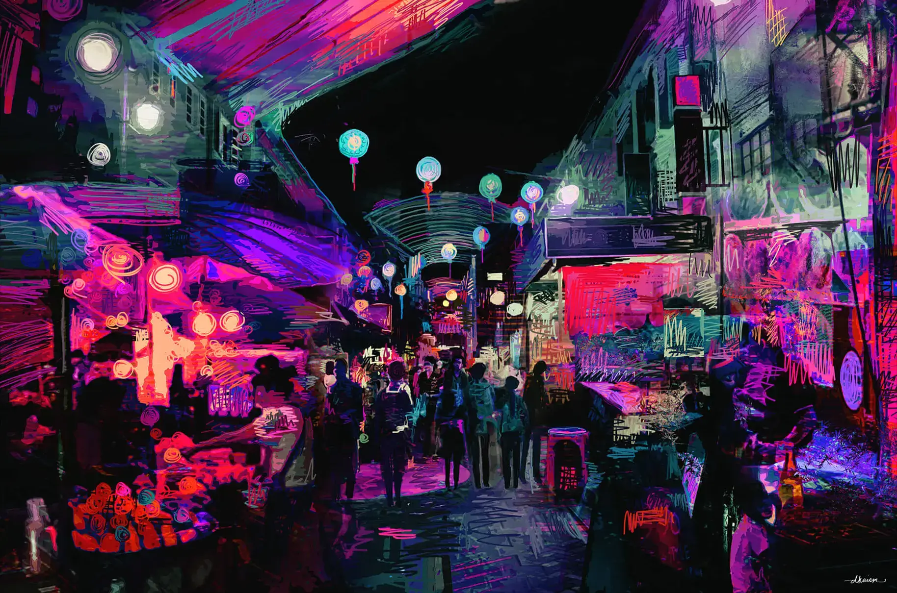 A bustling street comes alive with the vibrant hum of Daniel Ignacio’s abstract city life. Streaks of neon colors blend with the silhouettes of the crowd, each person a note in the urban melody.