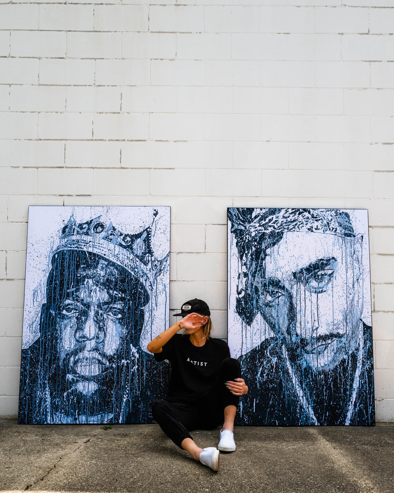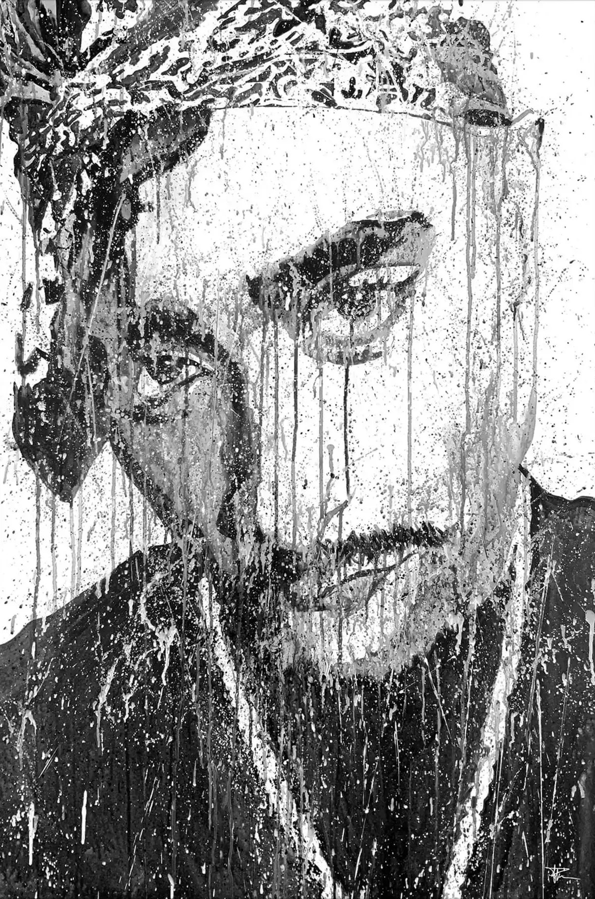 In a stark monochromatic palette, the intense gaze of Tupac Shakur is immortalized, his image rendered with a raw, dripping energy that captures the essence of his revolutionary spirit.