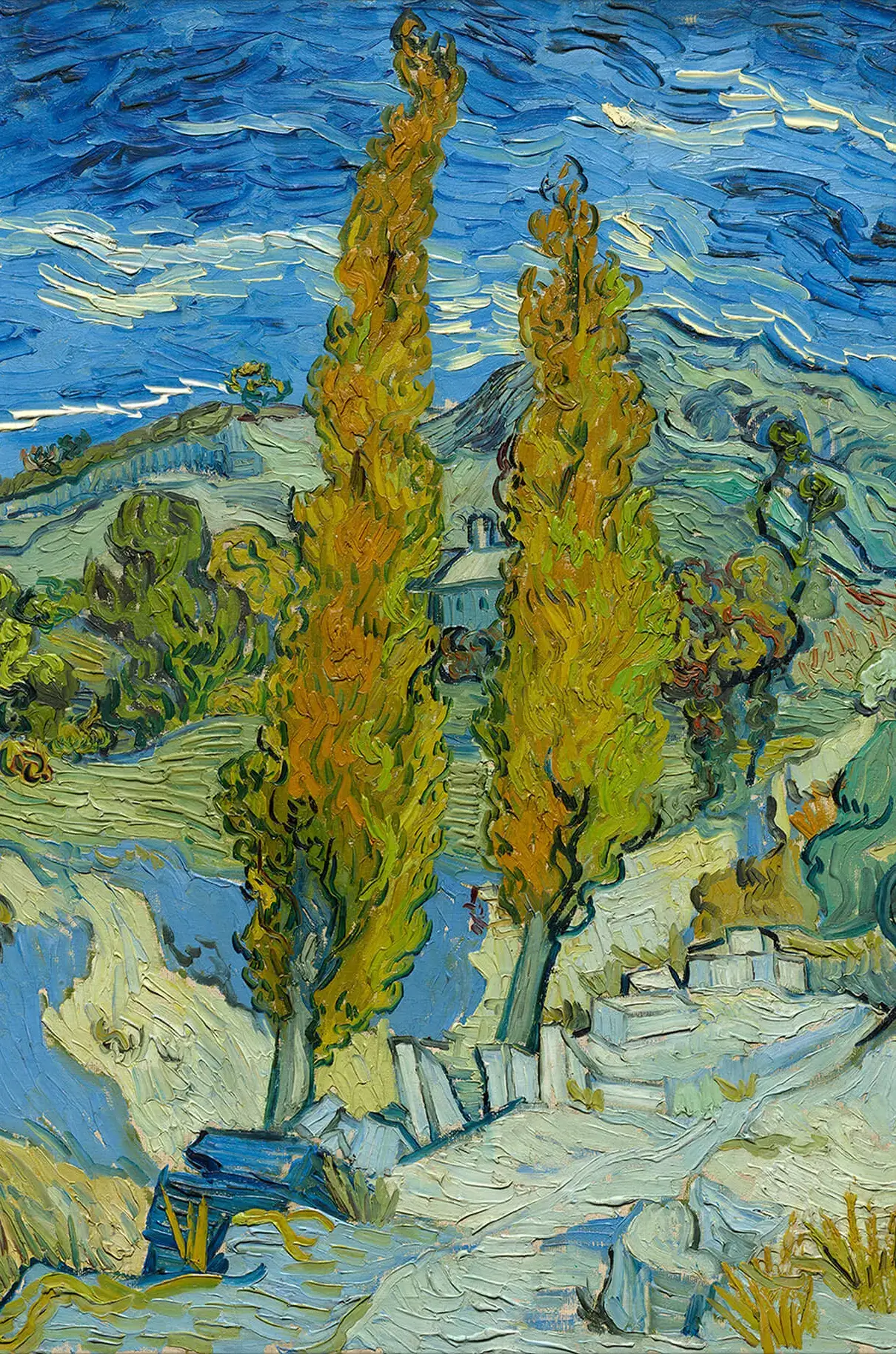 Two Poplars in the Alpilles by Vincent van Gogh shows pale limestone steps leading the eye upward toward two flame-shaped poplars painted in bold strokes of chartreuse and ochre. Rolling hills pulse with rhythmical brushwork, and cool shadows pool in the valleys. The sky twists in layered ribbons of sapphire, ultramarine, and powder blue, suggesting a brisk mistral wind.