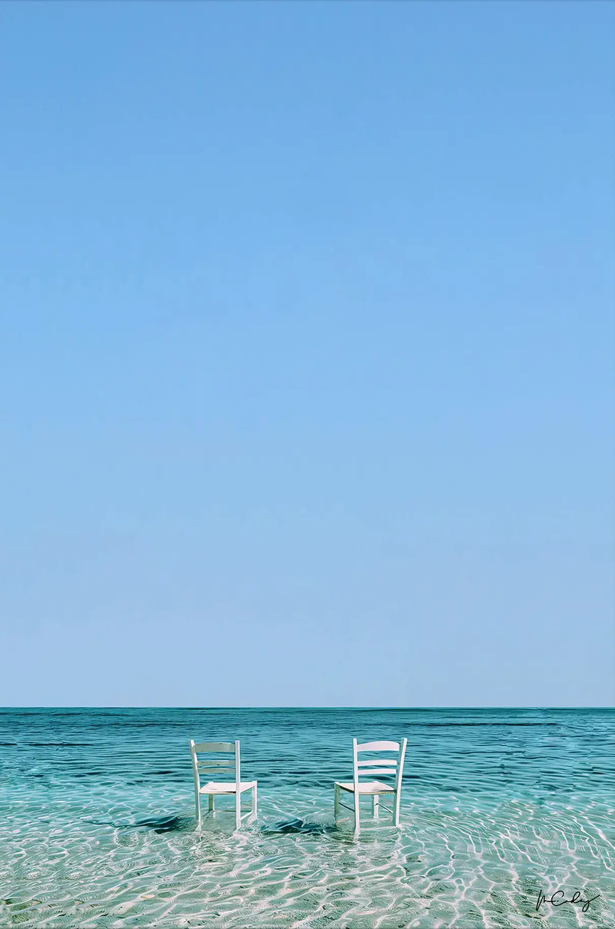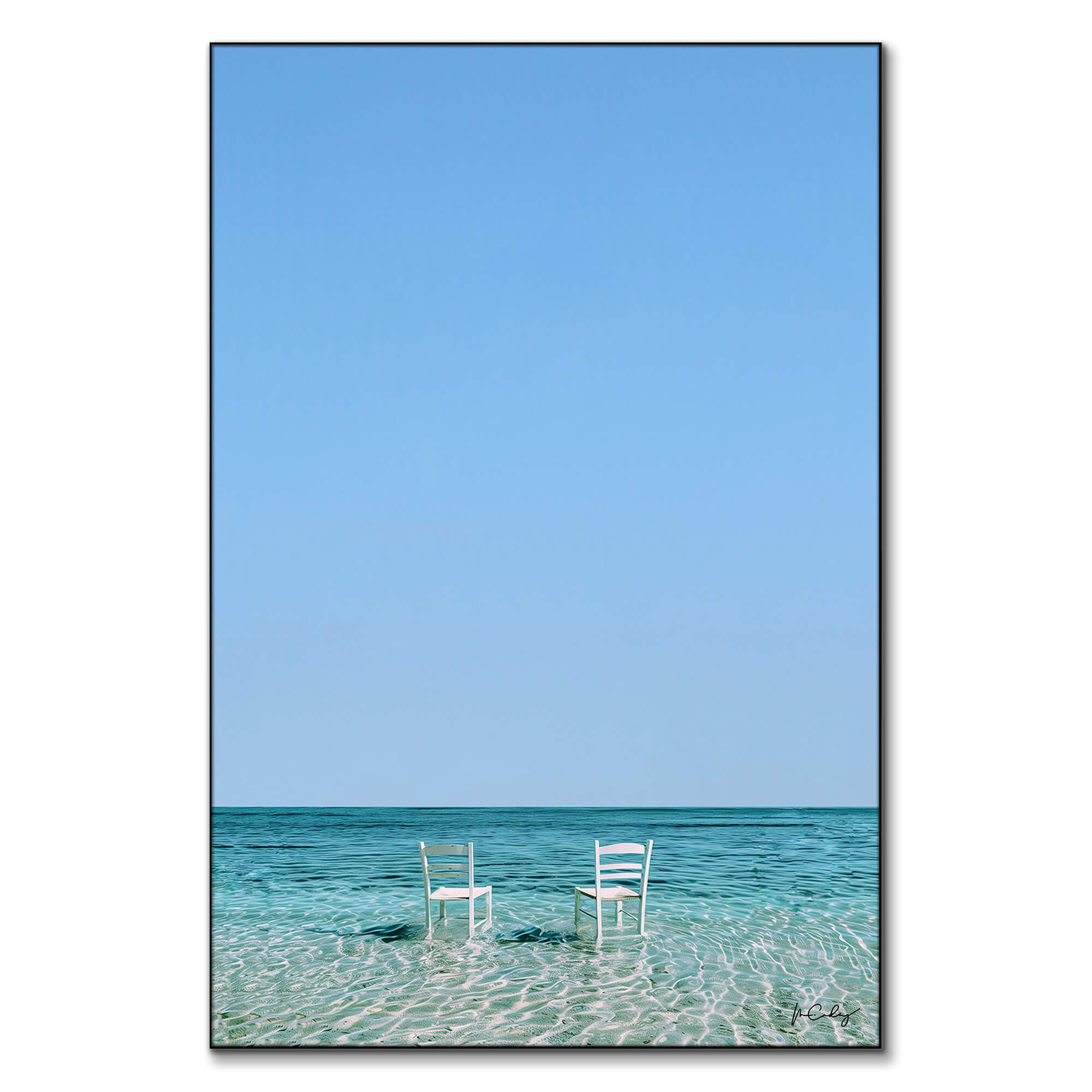 Two white chairs rest knee-deep in crystal shallows, framed by a limitless teal horizon and miles of open sky. Sunbathing is a calming vertical art print that invites quiet conversation and slow breathing into any room.
