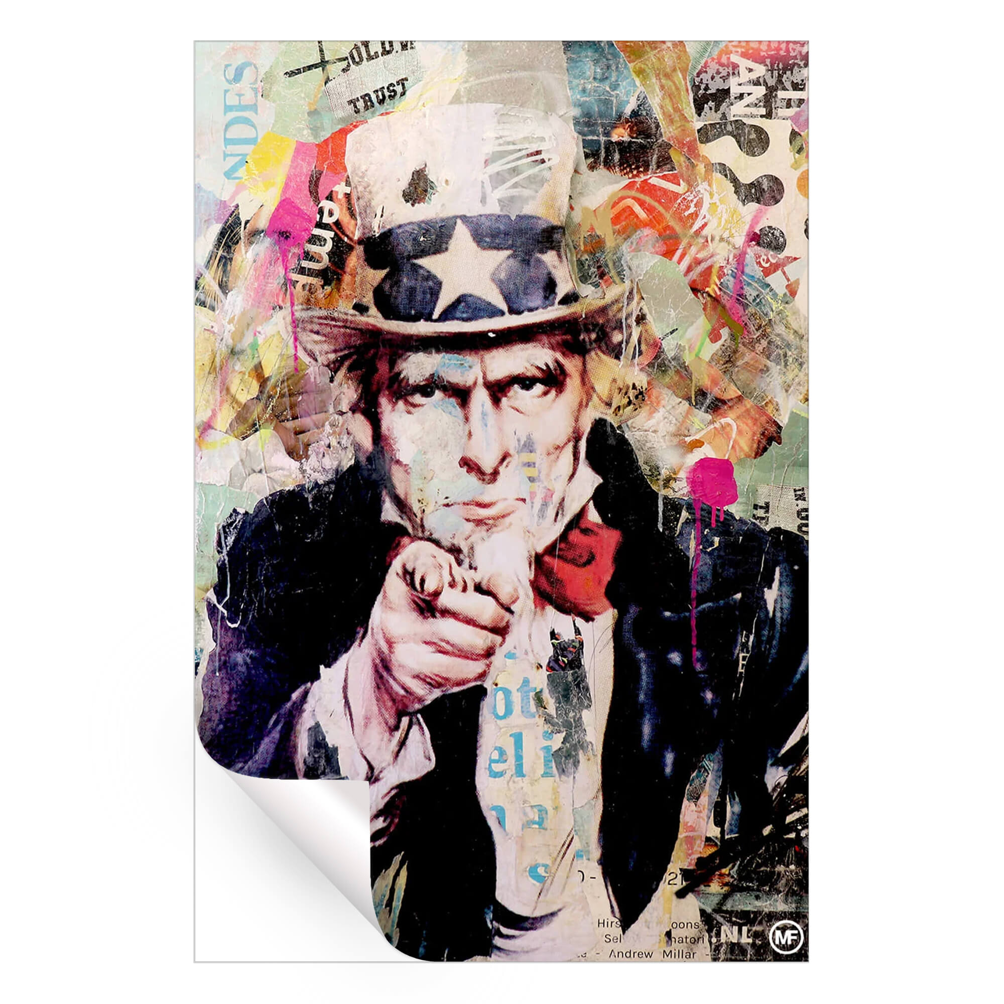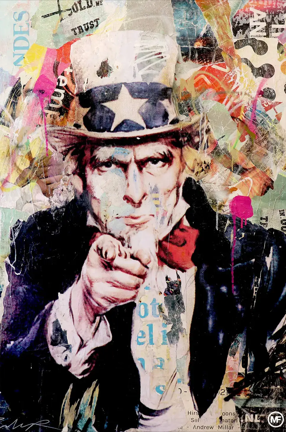 This artwork offers a dynamic reinterpretation of the iconic Uncle Sam, reimagined through the lens of contemporary pop art.