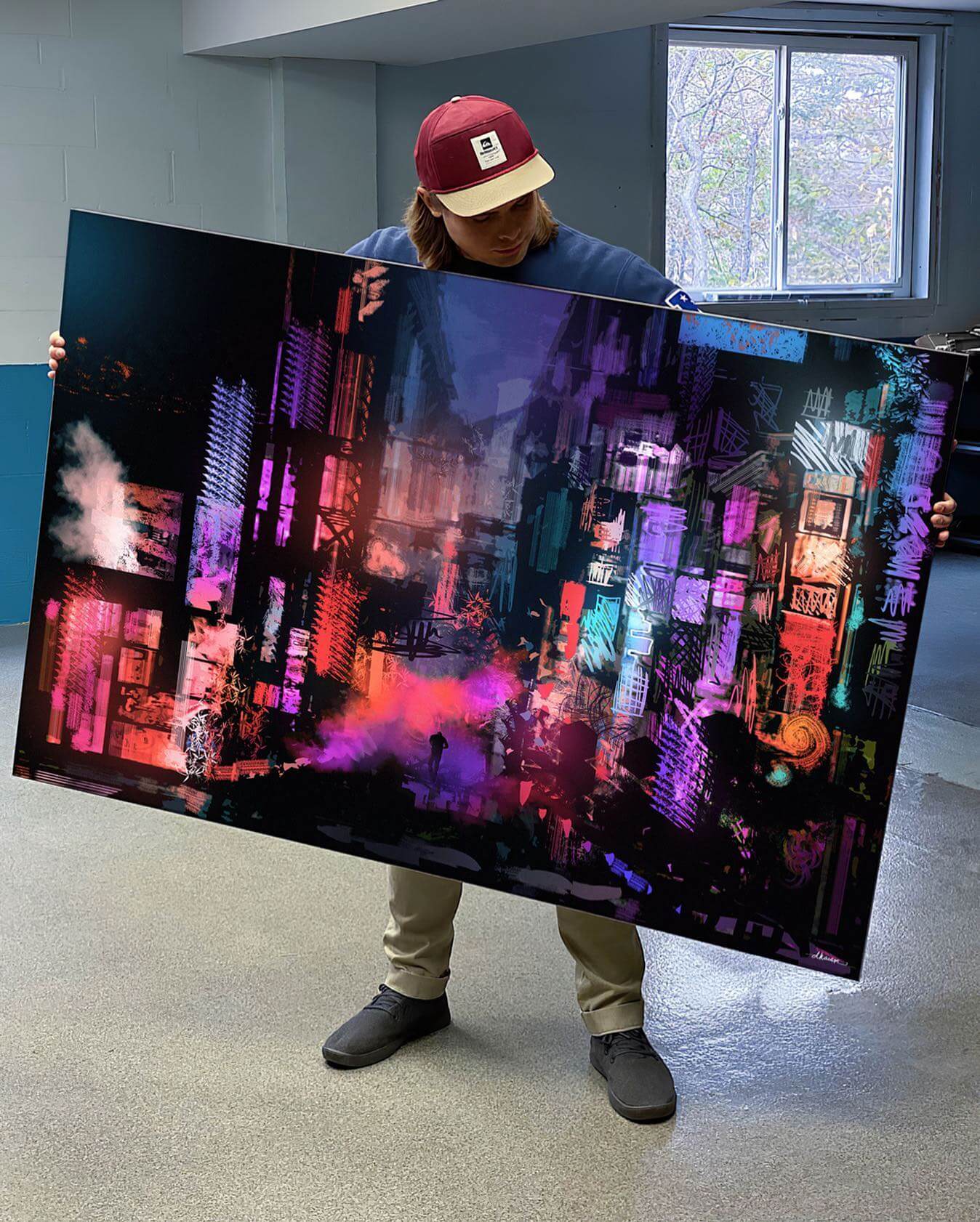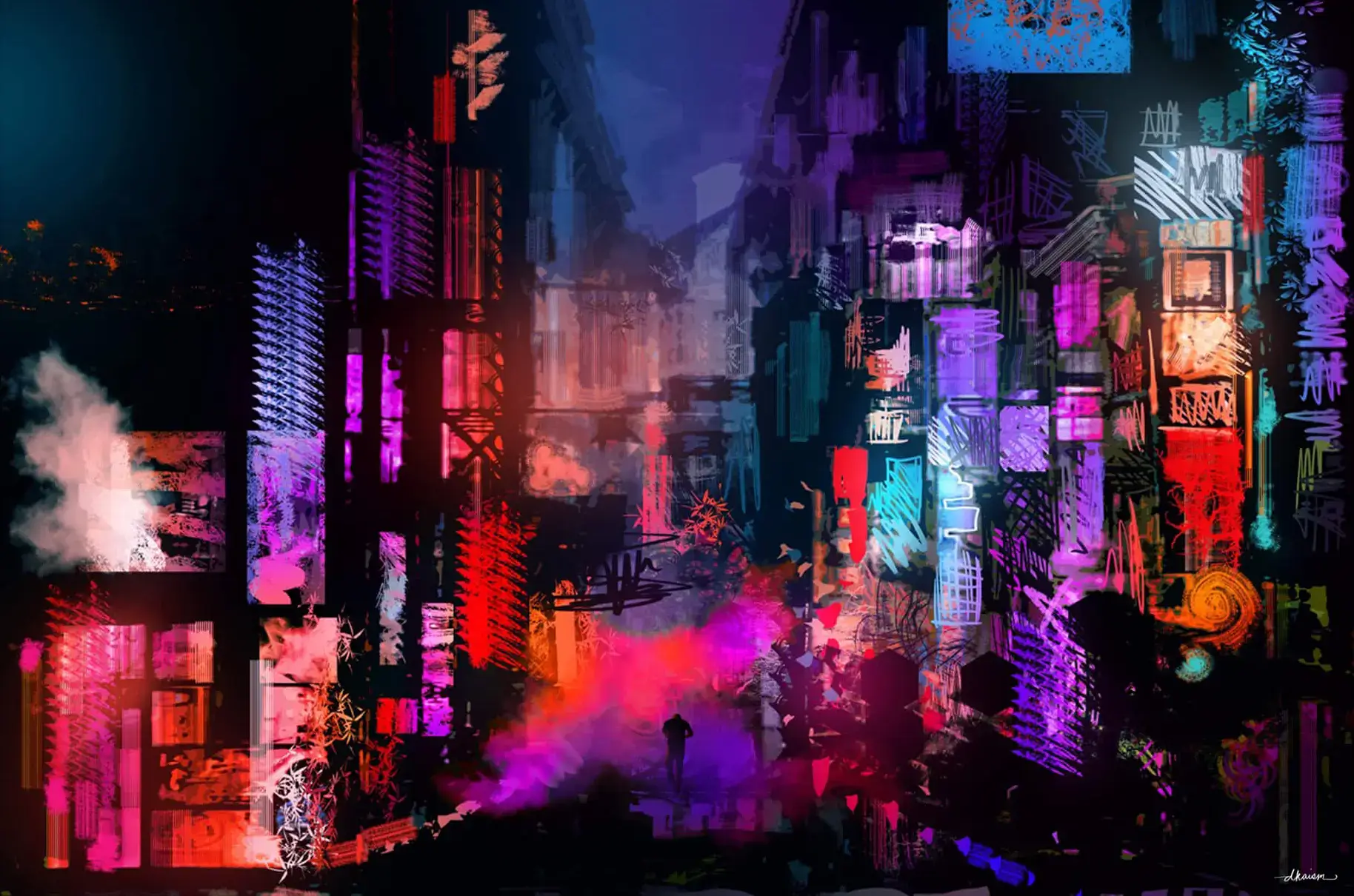 The cityscape, unleashed at night, transforms into Daniel Ignacio’s vibrant tableau of pulsating colors and shadowy figures. Neon strokes cut through the dark, sketching a world alive with hidden depths and untold stories.