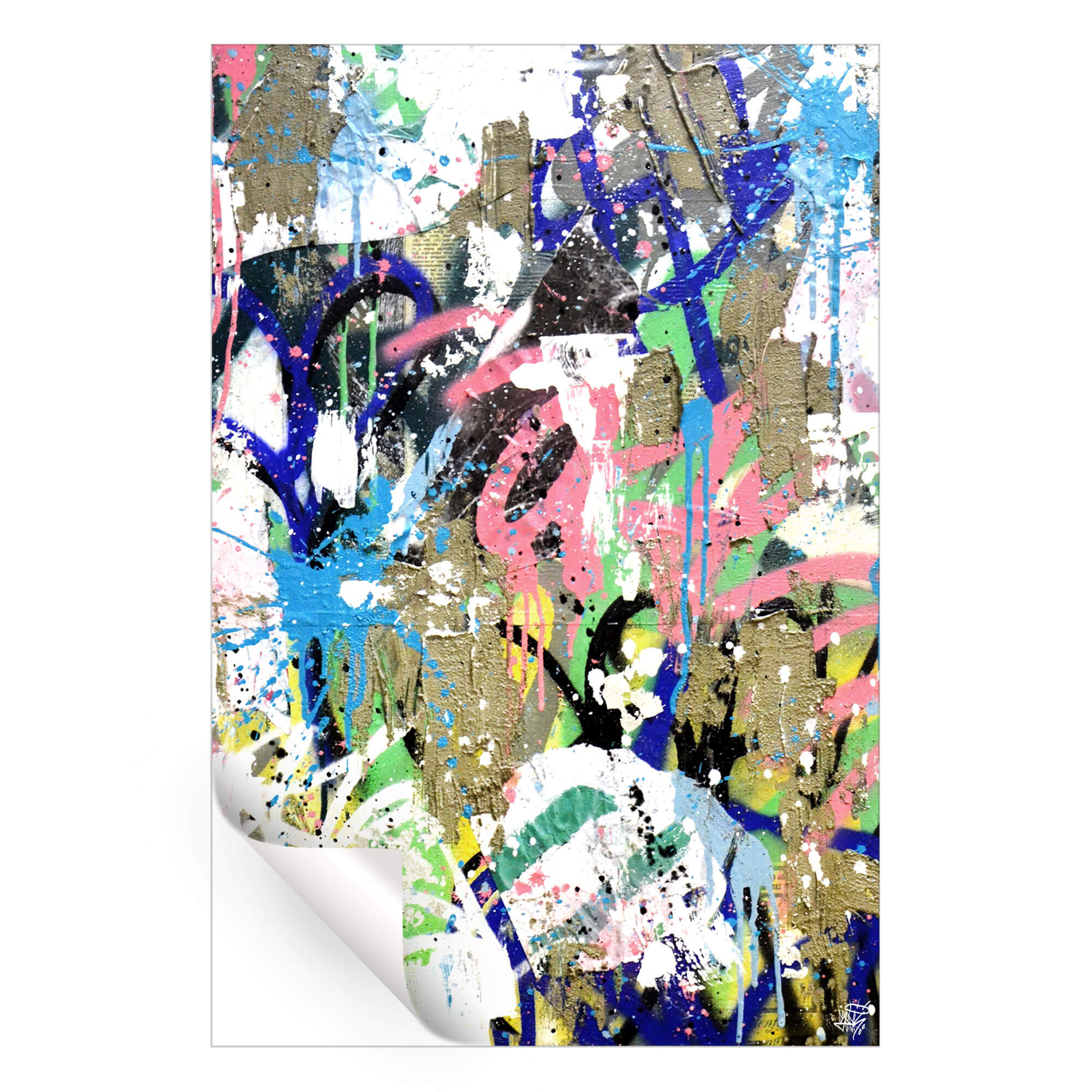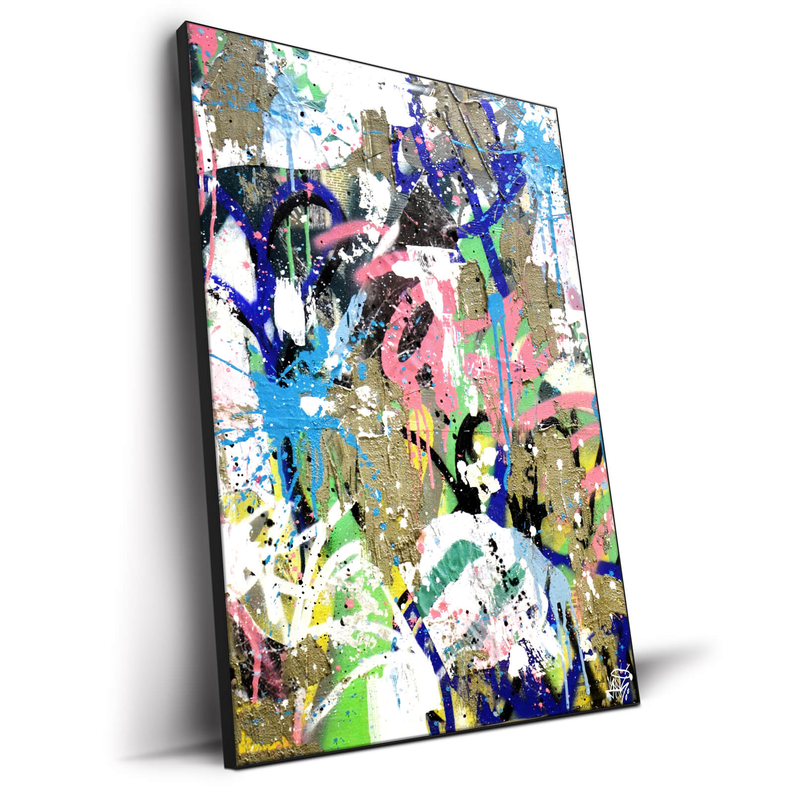 Streaks of blue, pink, and white paint are layered over a textured background of tans and blacks. Splatters and drips of paint create a spontaneous and raw visual effect, with patches of green and yellow adding brightness to the composition. The use of color and form gives the piece an abstract, graffiti-like feel.