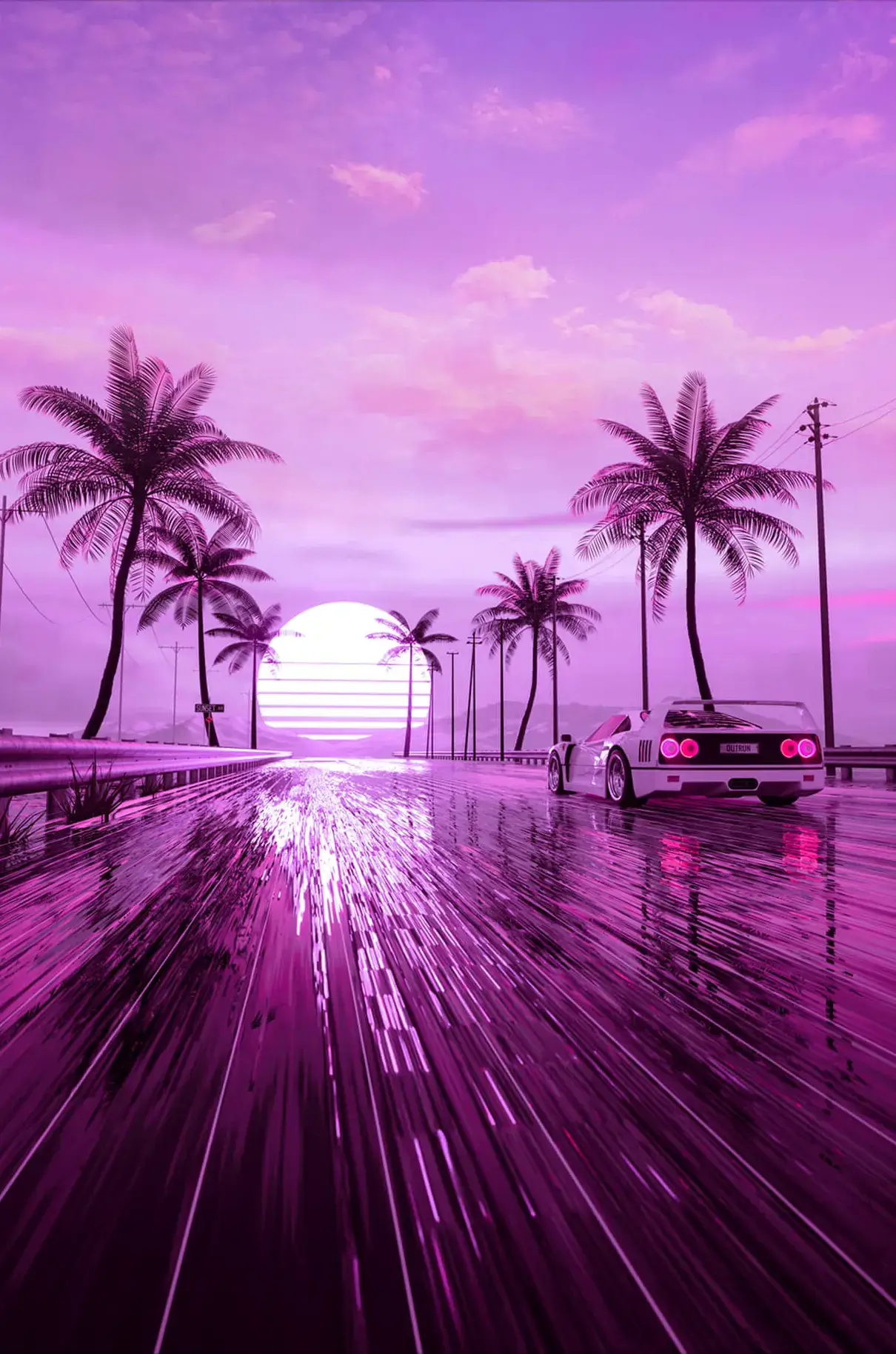 The setting sun casts a glow, silhouetting palm trees and imbuing the scene with a calm, tropical ambiance. The car’s iconic design is reflected on the road’s surface, blurred to show the speed of the car.